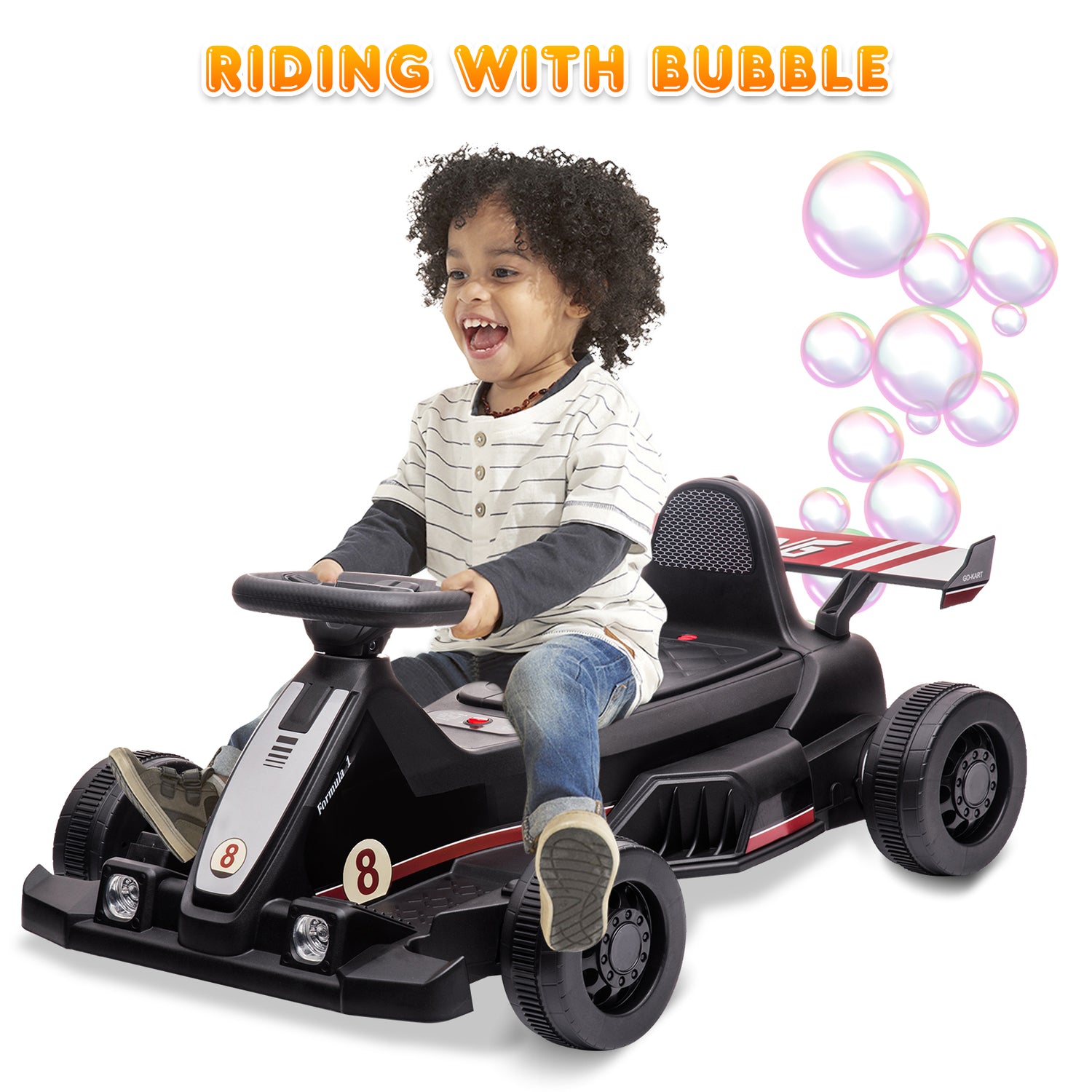 SYNGAR's New kid's power bubble go kart. If you want to give your child a different gift, then you must not miss this 6v bubble go kart that can spit bubbles, this kart has a classic racing appearance with a horn, steering wheel, pedals, lights, etc. Bring the most realistic driving experience for children. What's more, fun bubbles are projected from the car as the child drives. Available in three colors, this bubble car is perfect for kids ages 2+ and under 44 pounds, ideal for birthdays, and holiday gifts!