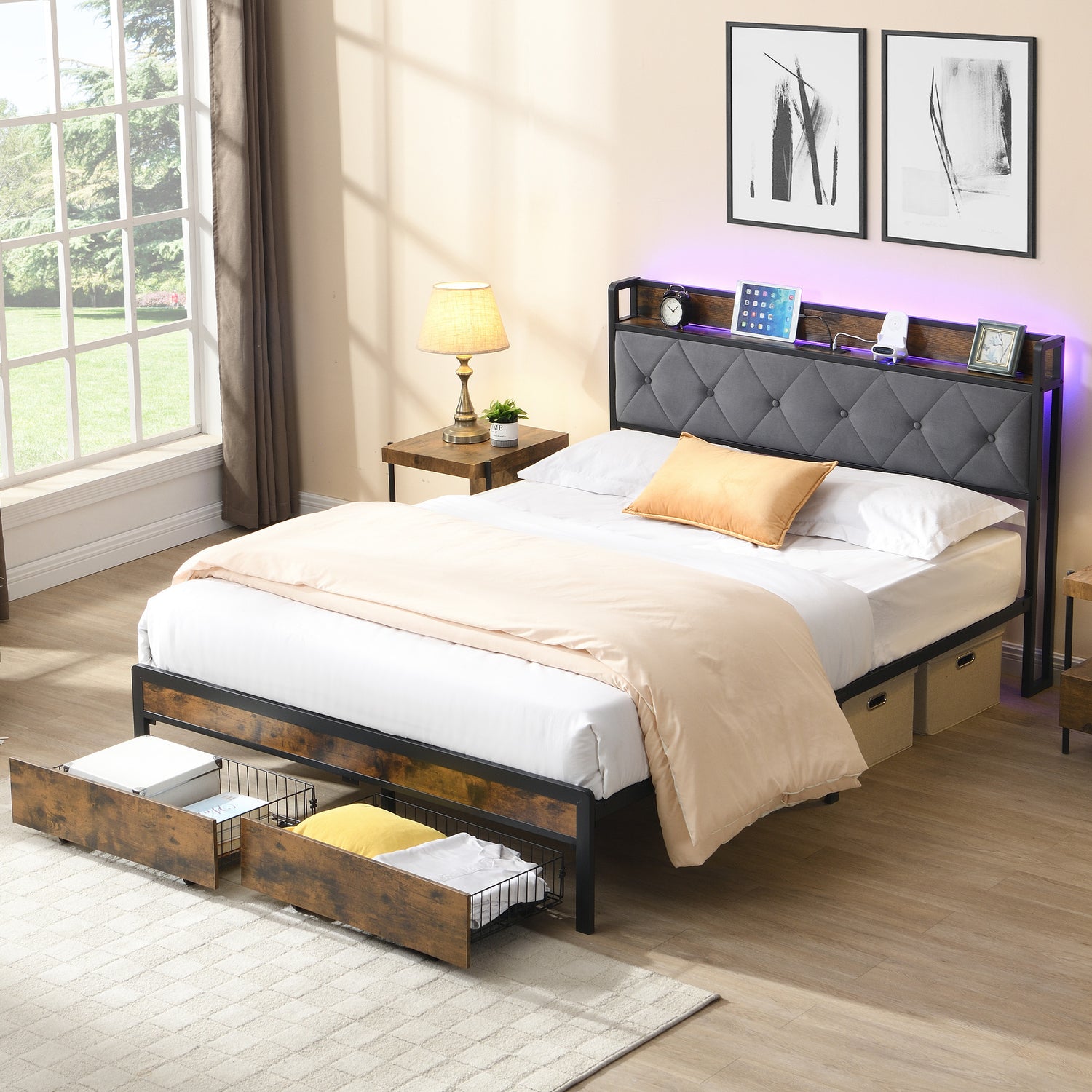 Full Bed Frame with Upholstered Headboard and LED Light, SYNGAR Platform Bed Frame with Charging Station and 2 Drawers, No Box Spring Needed, Easy Assembly, Oak Color