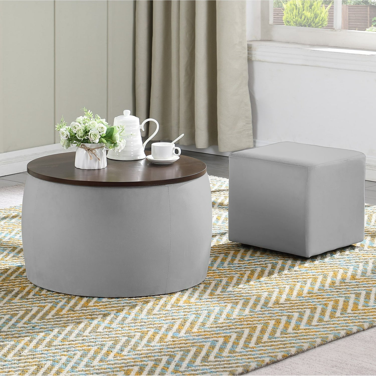 Storage Ottoman with Tray, Round Ottoman Coffee Table Handmade with Storage, Cube Organizer, End Table for Living Room, LJ423
