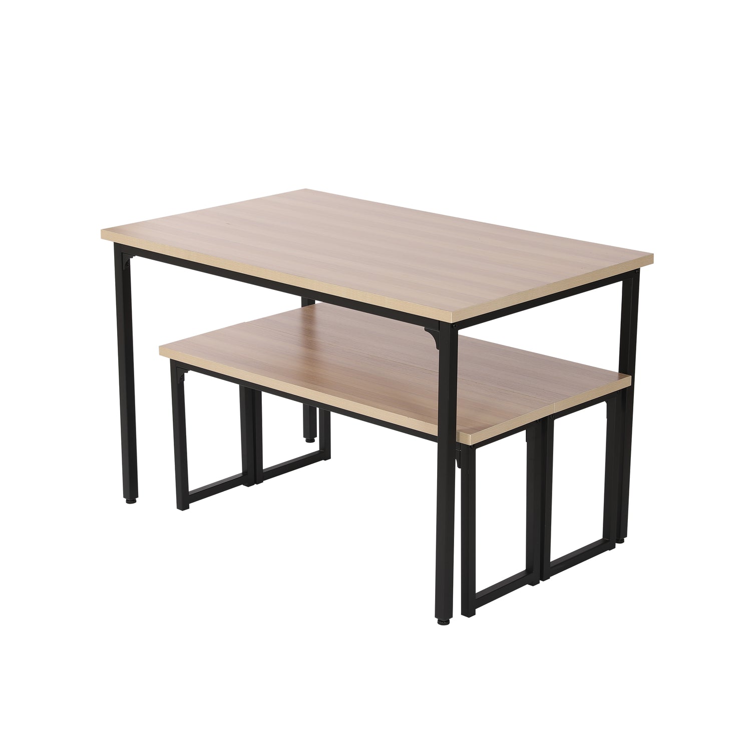 Bringing modern style to your dining room. This dining set comes with a rectangular dining table and two benches, crafted from metal frames and wood boards, which ensure its sturdiness and durability, and also bring warmth to your dining room.