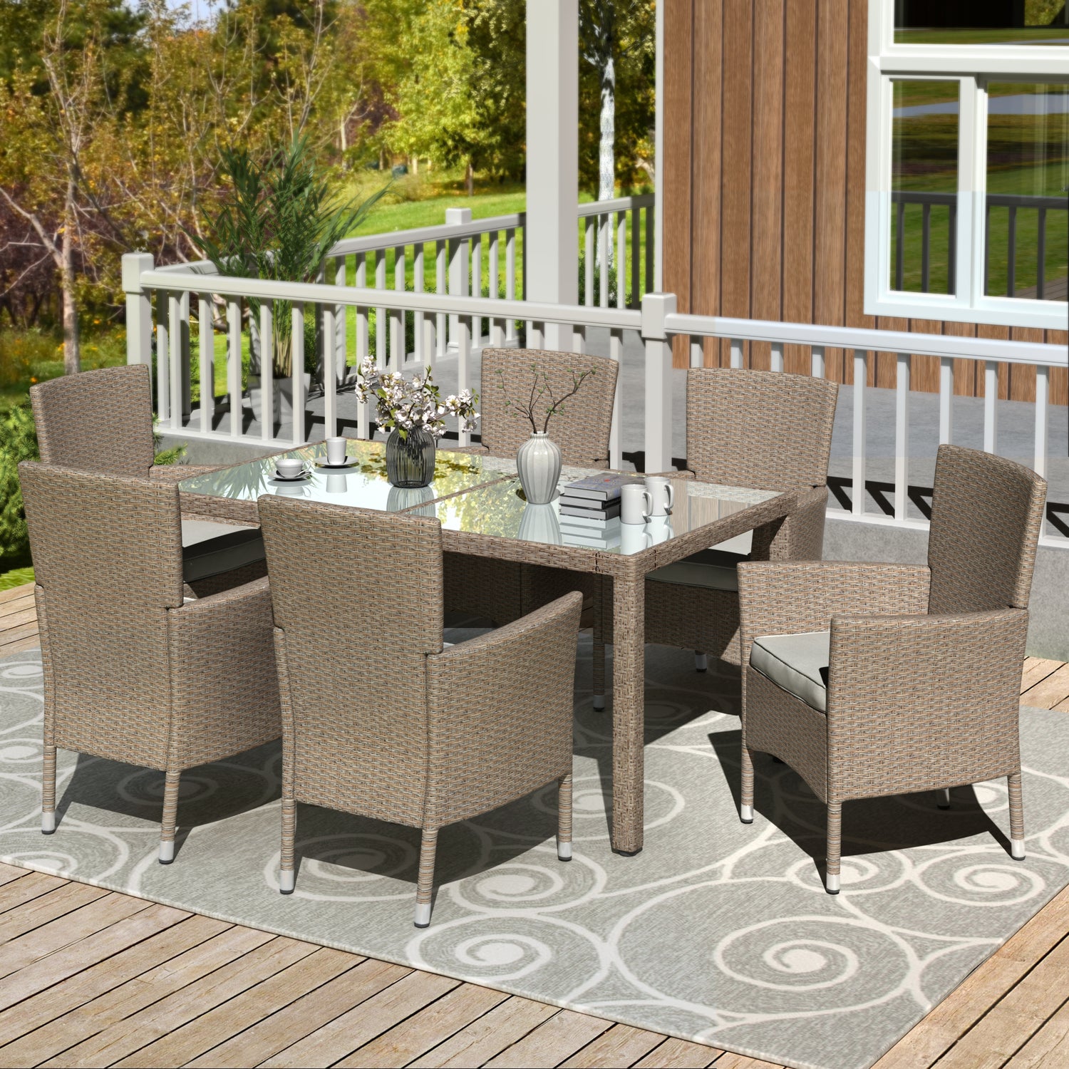 This patio dining set includes 1 table with an acacia wood top and 6 rattan chairs with cushions that provide enough locations for family and friends' dinner parties. In addition, combining refined classic style with quality material, this 7 pieces rattan dining set matches any decor and is suitable for outdoor and indoor use, bringing elegance and unique charm to your backyard, garden, and courtyard. Create a fantastic outdoor leisure area that you always dreamed of and hold a panoramic view of the outdoor natural scene at the same time.