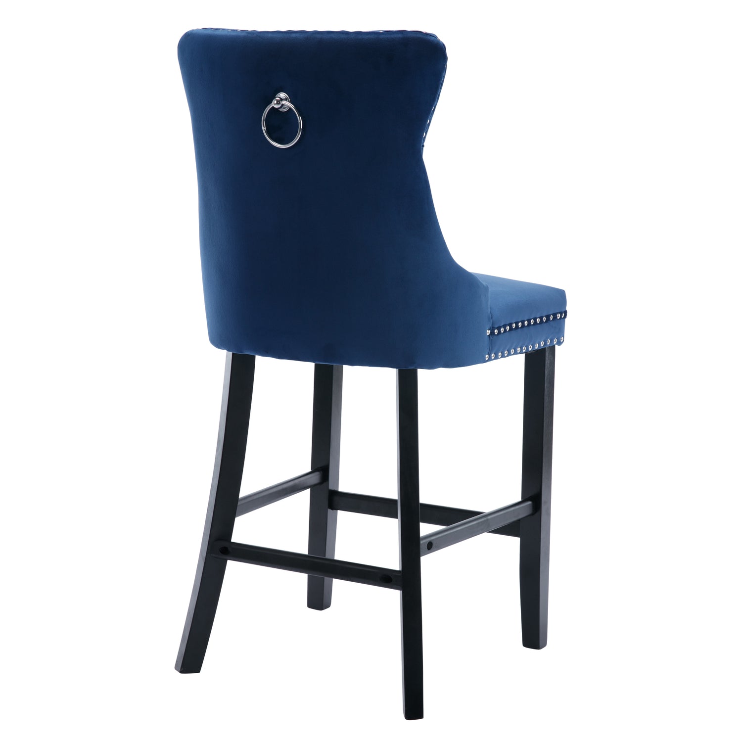 Simply elegant, the Solid Wood Button Tufted Bar Stool Set of 2 has a Modern & Stylish style. This bar chair is upholstered in blue color perfectly accented with button tufting. The seats and backs are padded and button-tufted, and the chair is surrounded by rivets, and the stylish, noble, and not the tacky design you will love. And the durable wooden legs are finished in a deep color to match the style. These high-back chairs are slightly and elegantly curved, expertly finished with velvety soft upholstery. The Upholstered Leisure Style 2-piece bar stool with footrest is perfect for bars or counters.