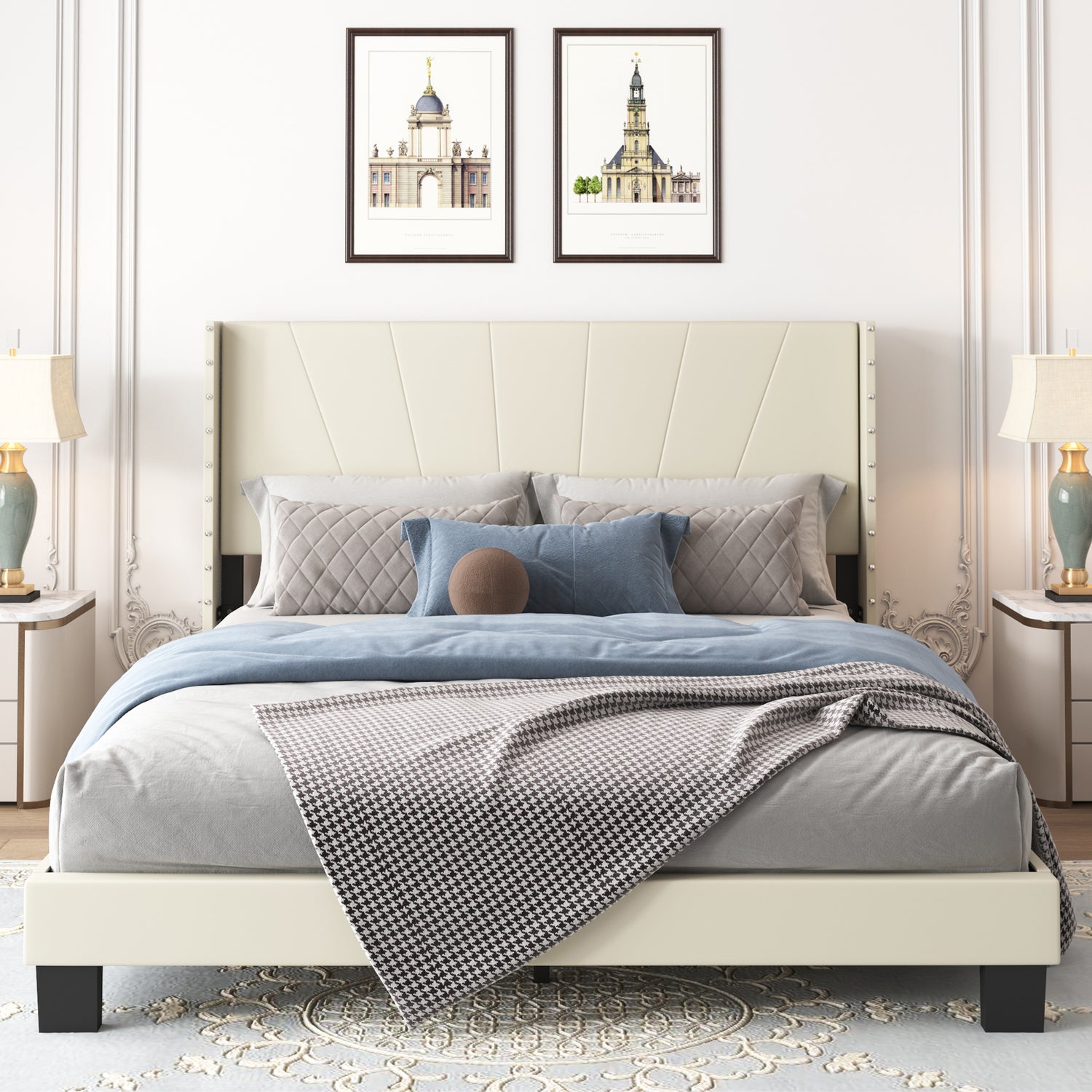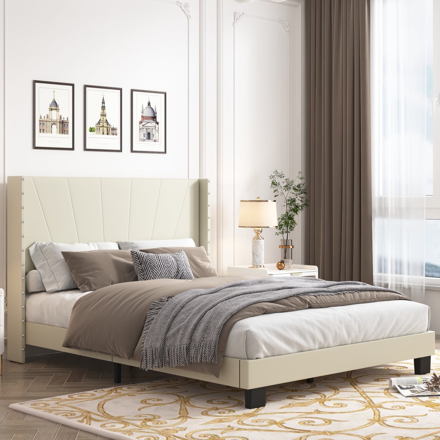 SYNGAR Upholstered Platform Bed with a metal frame and solid wood slats support combined to provide a solid foundation for a good night's sleep. With an elegant upholstered rivet wingback design headboard for sturdy construction and durability. Includes a comfortable headboard, sturdy metal frame, strong wood slats, and support legs of the bed to support your memory foam, latex, or spring mattress (not included). Made of quality fabric upholstered, metal frame, and wood slats, this platform bed is durable and sturdy and can serve your family for years.