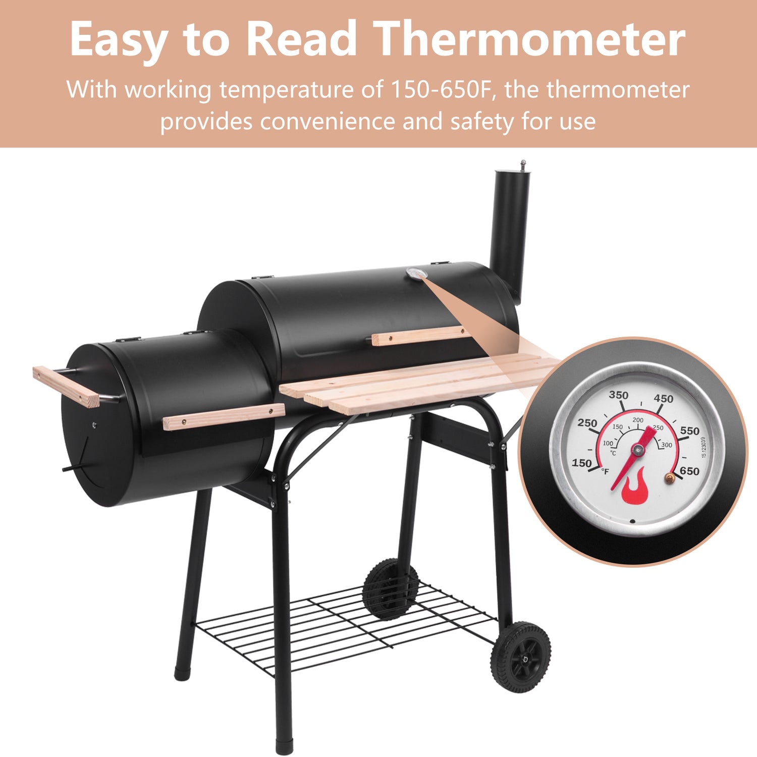 With a seamless combination of offset smoker, great heat and smoke circulation are guaranteed. The side door allows adding charcoal and cleaning ash easily. Open the air vent and stack, you can stock fire and transfer smoke effectively. This charcoal grill is easy to setup, easy to use and clean. And it can also provide additional grilling or smoking cooking space for small side dishes.