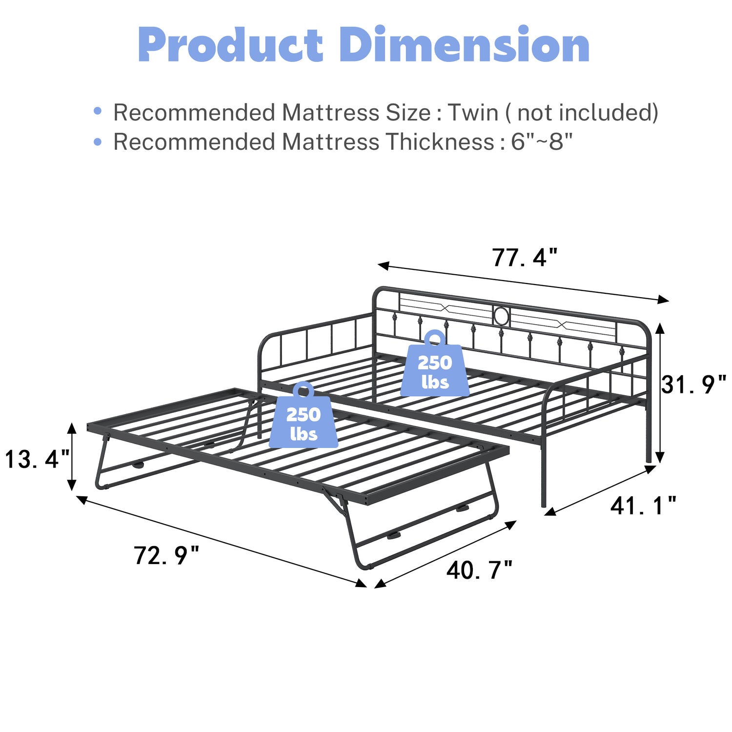 - Daybed Dimension: 77.4"L x 41.1"W x31.9"H