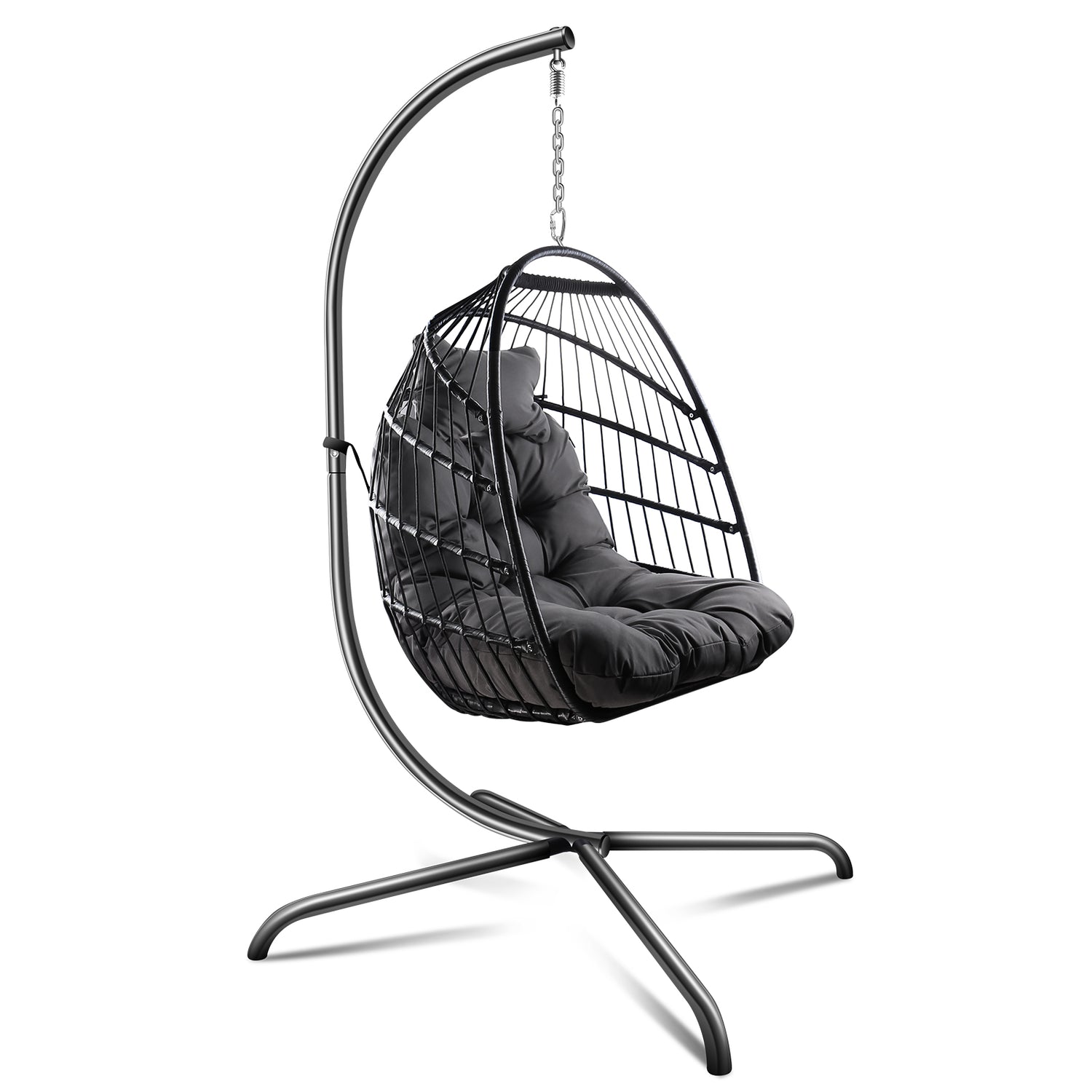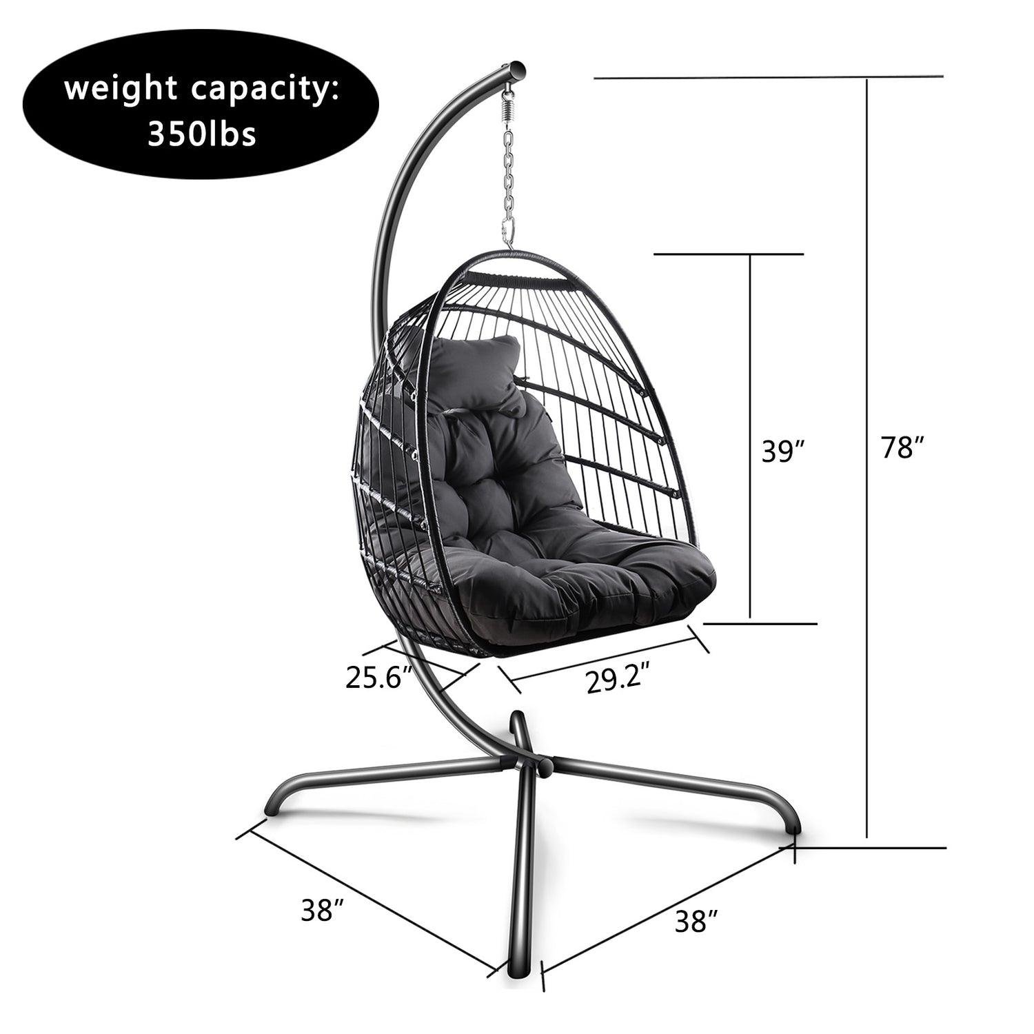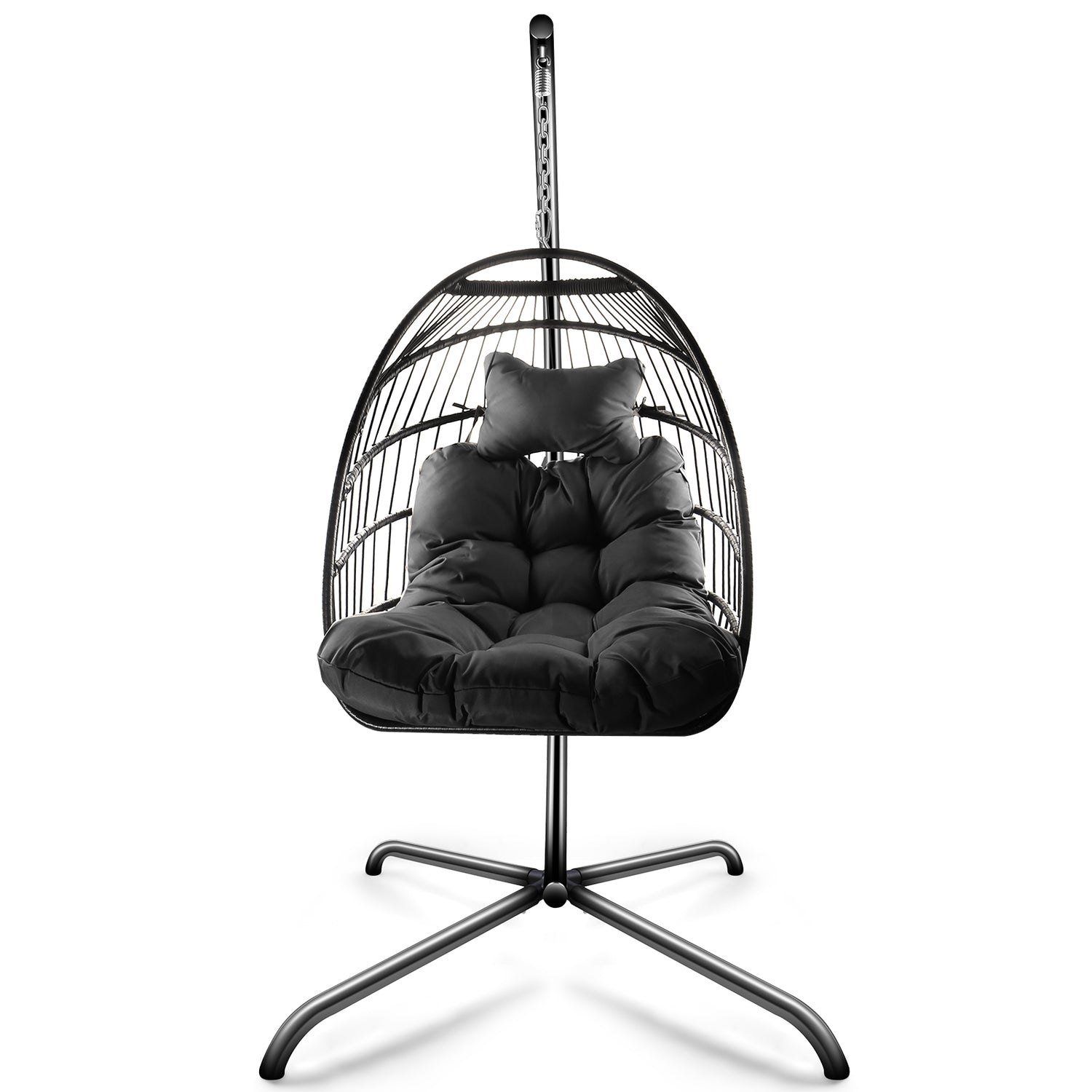[Easy to Assemble] - This swing chair with black basket and black cushions. The stand frame is easy to fix together with tools and accessories. And the hammock chair's height is adjustable for different needs. All in one Box including the chair, headrest pillow, seat cushion, and stand.