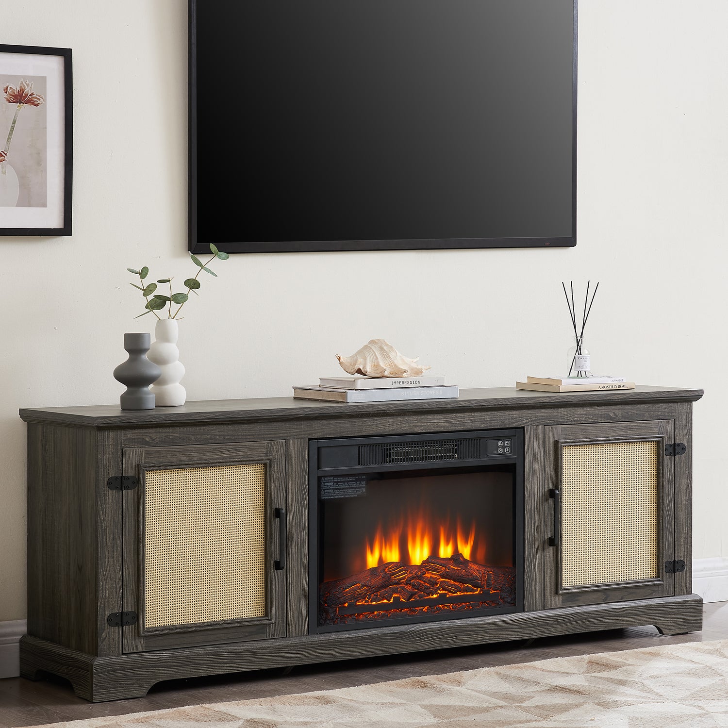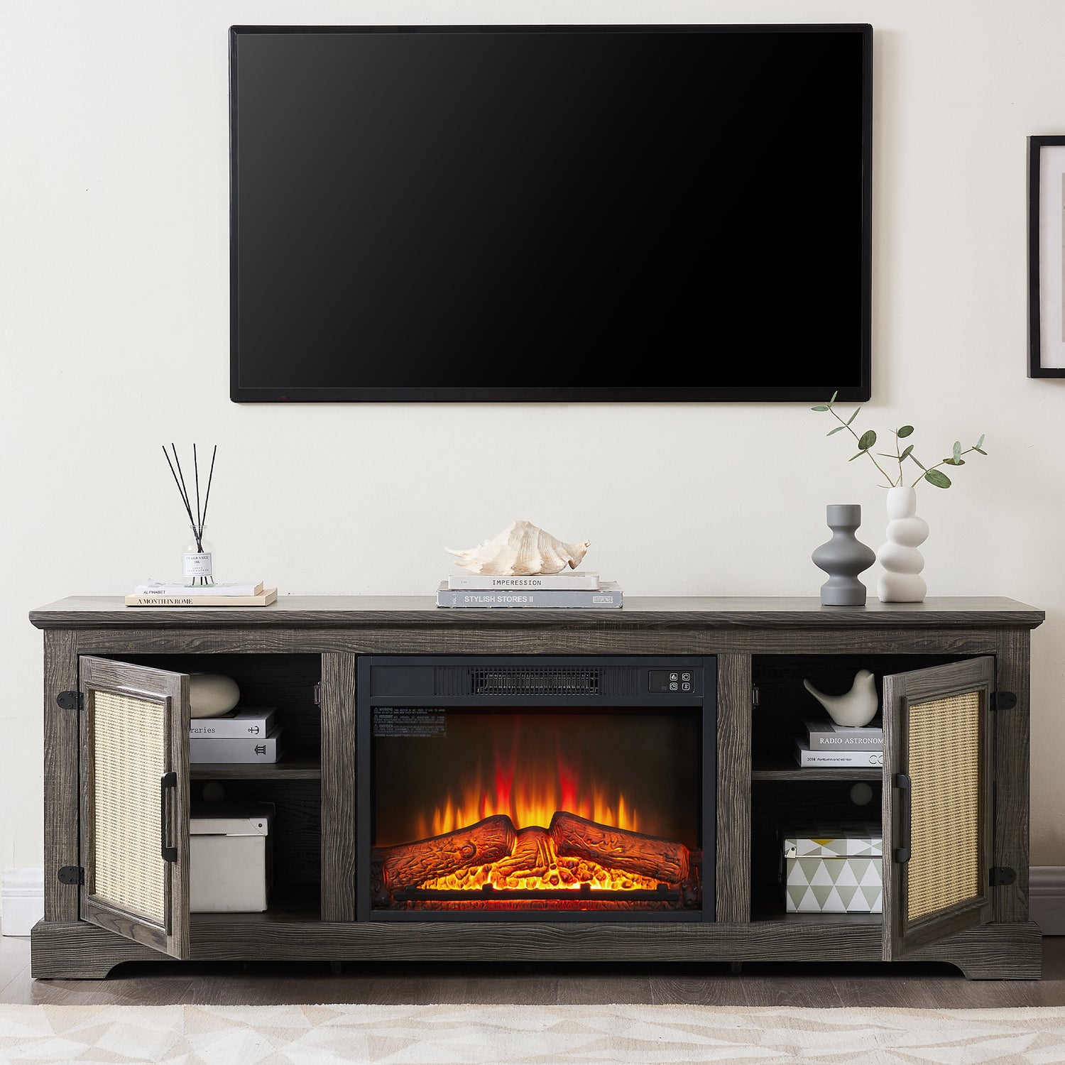 SYNGAR Electric Fireplace TV Stand for 70" TV, Farmhouse TV Stand Entertainment Center with Rattan Doors for Living Room, Wood TV Console with Adjustable Shelves, Remote Control, Gray