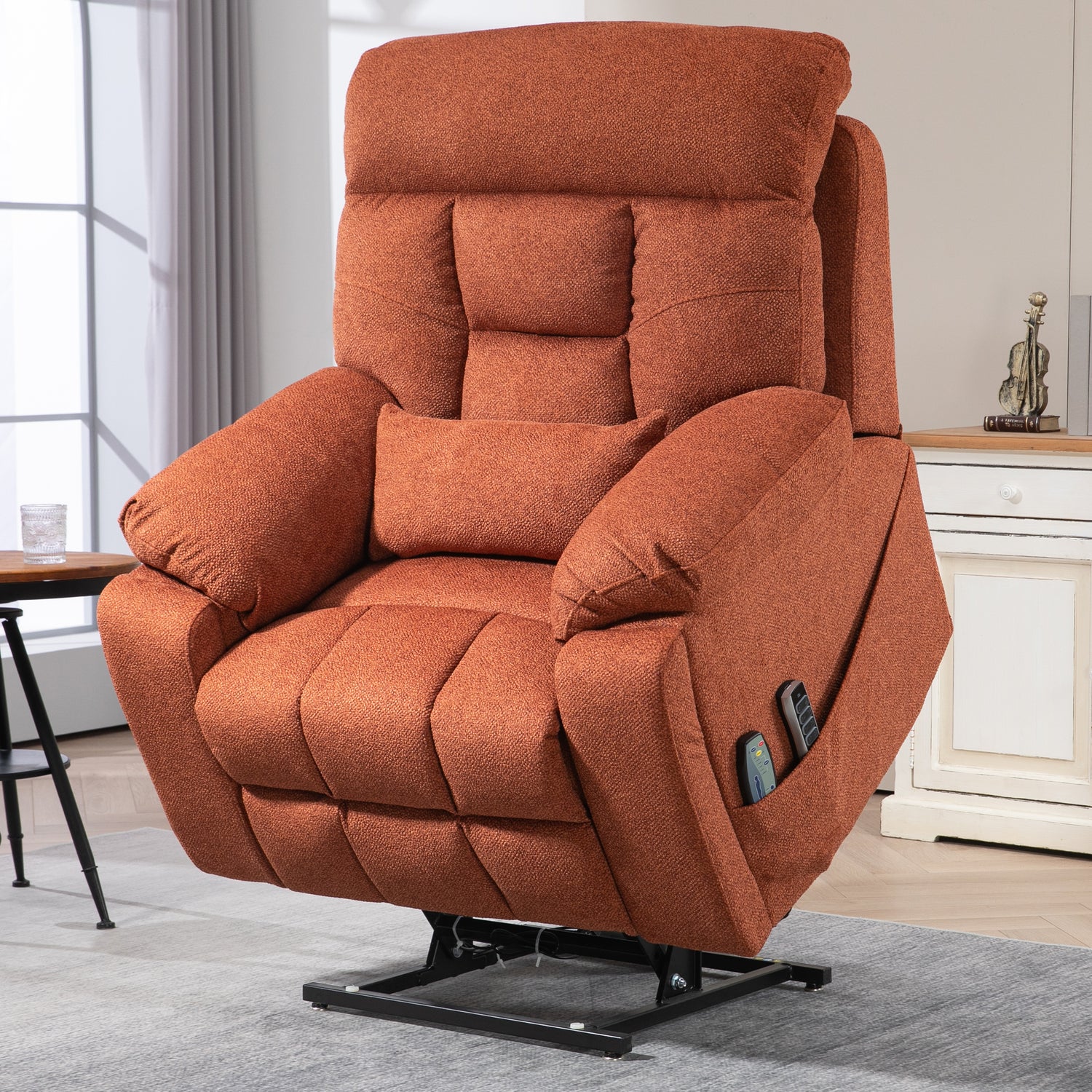 Upgrade your relaxation with the SYNGAR Recliner Chair, boasting a generous 26-inch wide seat and a 26.78-inch high backrest, perfect for heavy adults. Enjoy the full copper rotor and silent-bearing German OKIN motor, ensuring smooth operation and longevity. The goose-down fabric and padded sponge provide unmatched comfort, while the thickened alloy bracket ensures durability. This chair features 8 massage points with lumbar heating, 5 massage modes, and 2 intensity levels. The front concealed stainless steel cup holder adds convenience. Easy to assemble in just 10 minutes, this recliner is ideal for reading, sleeping, and standing with its single-button control for backrest and leg rests. Perfect for your living room, this power lift recliner is designed for large-weight individuals and the Elderly.