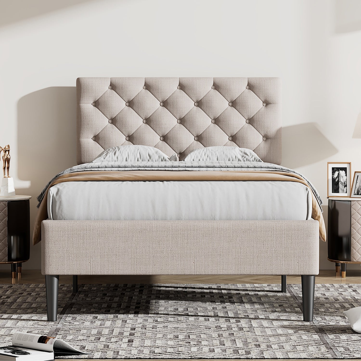 SYNGAR Upholstered Platform Bed with solid wood support combined to provide a solid foundation for a good night's sleep, with an elegant button tufted headboard design and linen upholstery for sturdy construction and durability. It is easy to assemble and its Super load-bearing capacity can stand the test of time.
