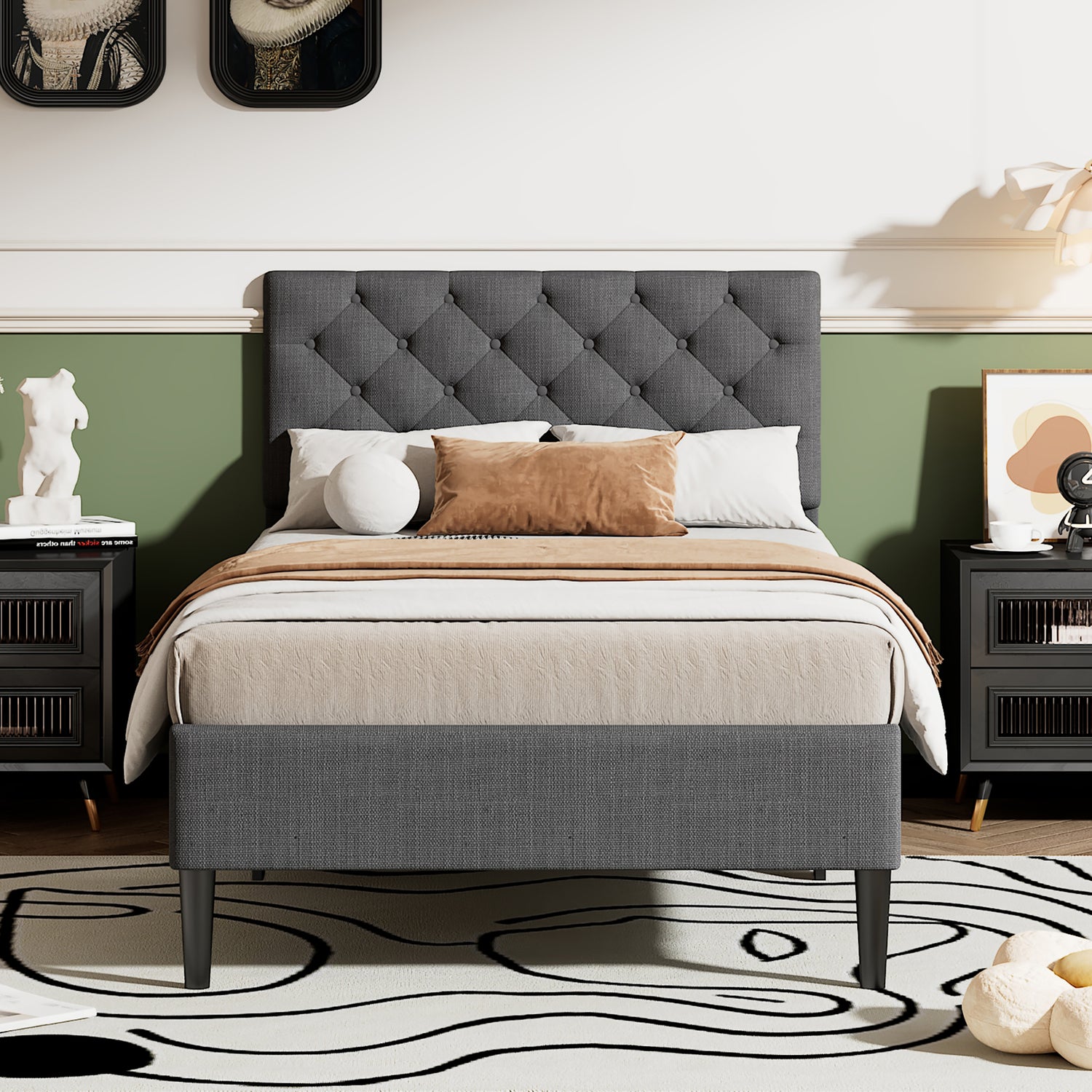 SYNGAR Full Size Platform Bed Frame with Linen Fabric Upholstered Button Tufted Headboard, Sturdy Sturdy Frame and Strong Wooden Slats, No Box Spring Needed, Gray