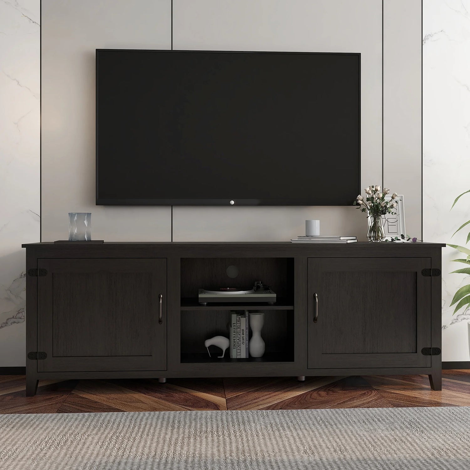 SYNGAR Farmhouse TV Stand for 70 inch TV, Wooden TV Cabinet Console Table with 2 Doors Cabinets and Storage Compartments, Entertainment Center for Living Room, Traditional Black, 70"L x 15"W x 25"H