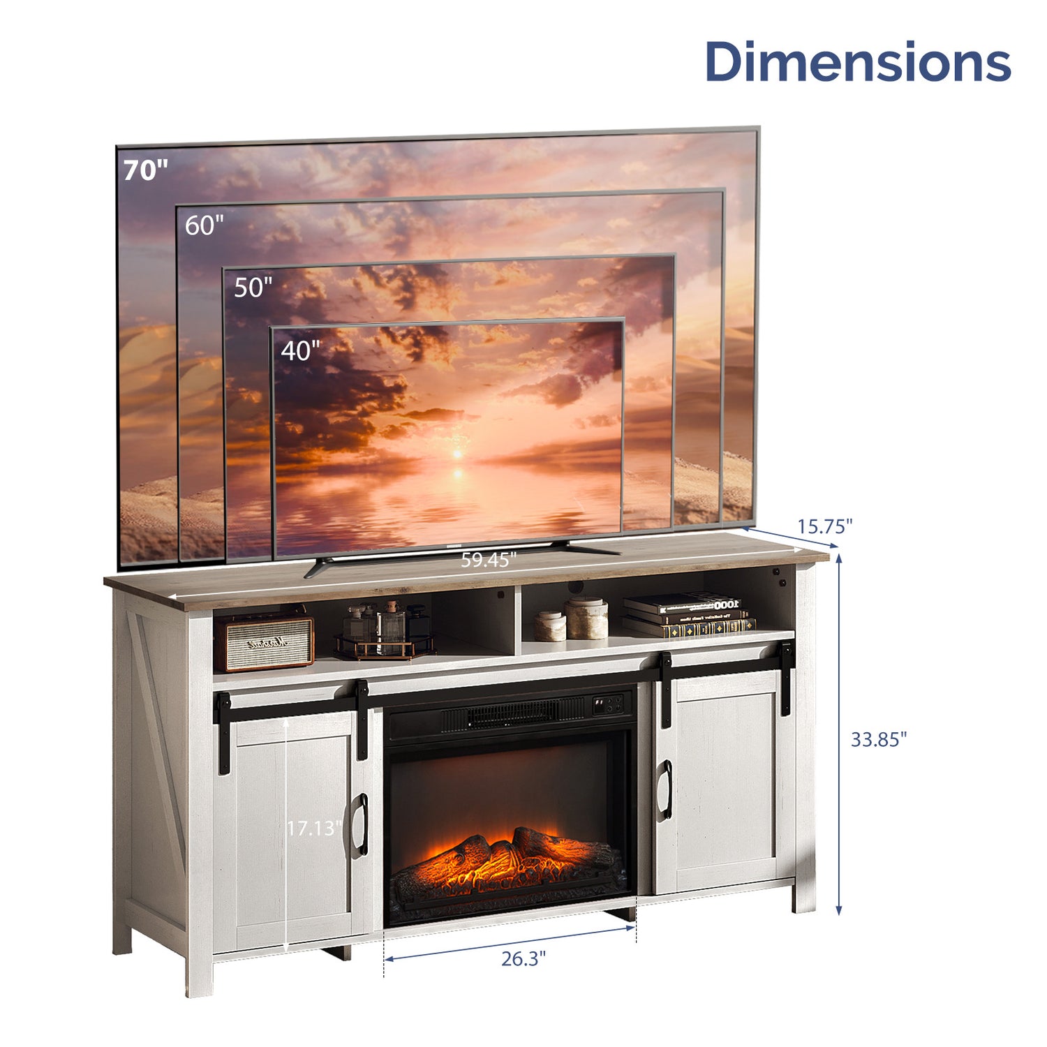 Transform your living space into a cozy, elegant retreat with this 58.1-inch Electric Fireplace TV Stand. Crafted with a rustic-modern two-tone design—Vintage Brown top and Washed White cabinet—this media console effortlessly blends ample storage and striking style. The ultra-thin electric fireplace insert (accommodates 23", not included) delivers powerful 1400W heating for rooms up to 200 sq.ft., paired with a mesmerizing realistic 3D flame effect that mimics the glow of a traditional fire without smoke, maintenance, or noise. Customize your ambiance with 6 flame colors and 7 brightness levels, all easily controlled via remote. The smooth-sliding barn doors reveal two fixed shelves, offering organized storage for gaming consoles, media players, and decor. Built from durable laminated particleboard, this TV stand with storage resists scratches and adds a furniture-grade focal point to your living room or bedroom . Easy to assemble and designed for daily use, it’s the perfect entertainment center for those seeking warmth, style, and functionality.