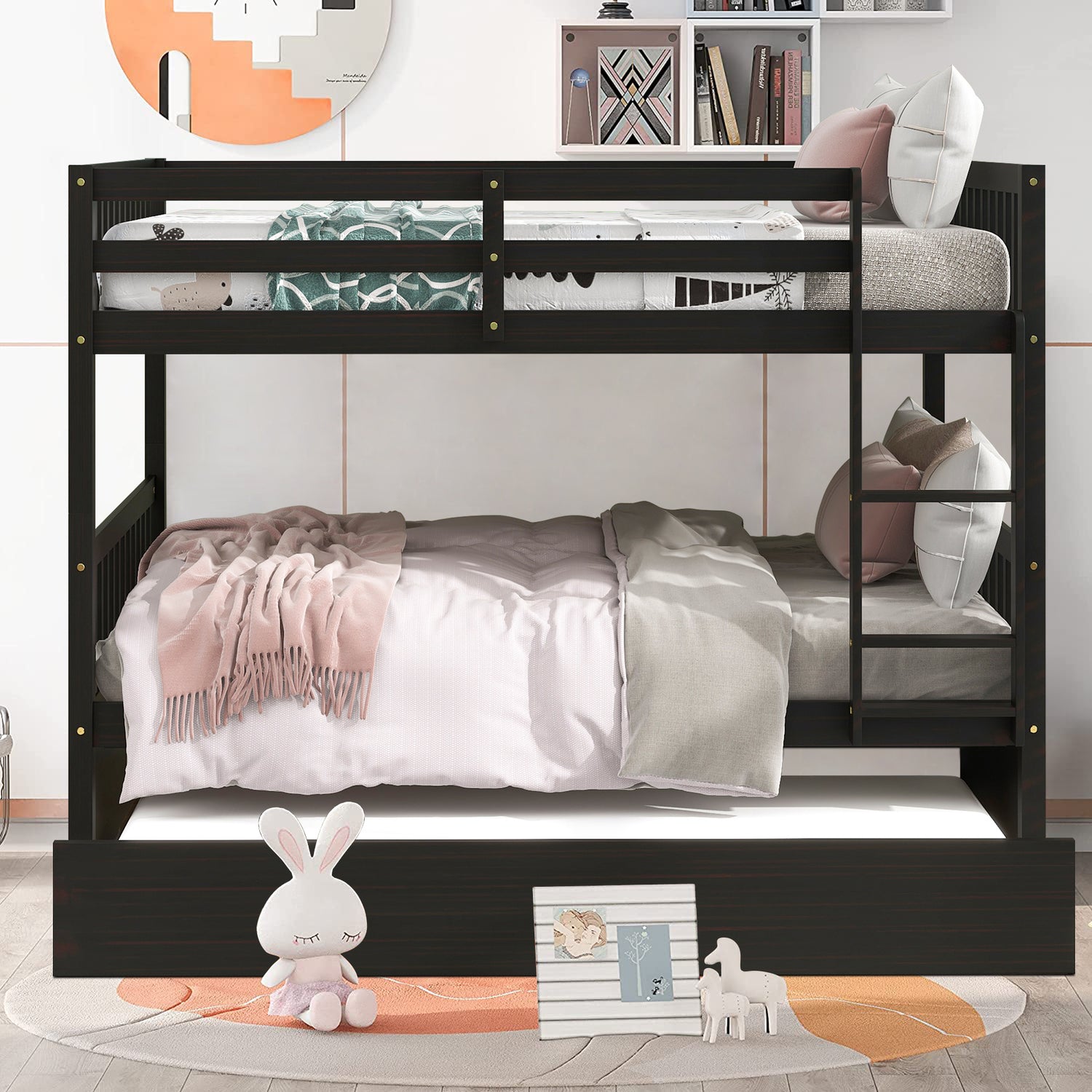 SYNGAR Full Over Full Bunk Bed with Trundle, Bunk Beds Convertible to 2 Platform Full Size Bed Frame with Guardrails and Ladder, Suitable for Kids, Teens, Adults, No Box Spring Needed, Espresso