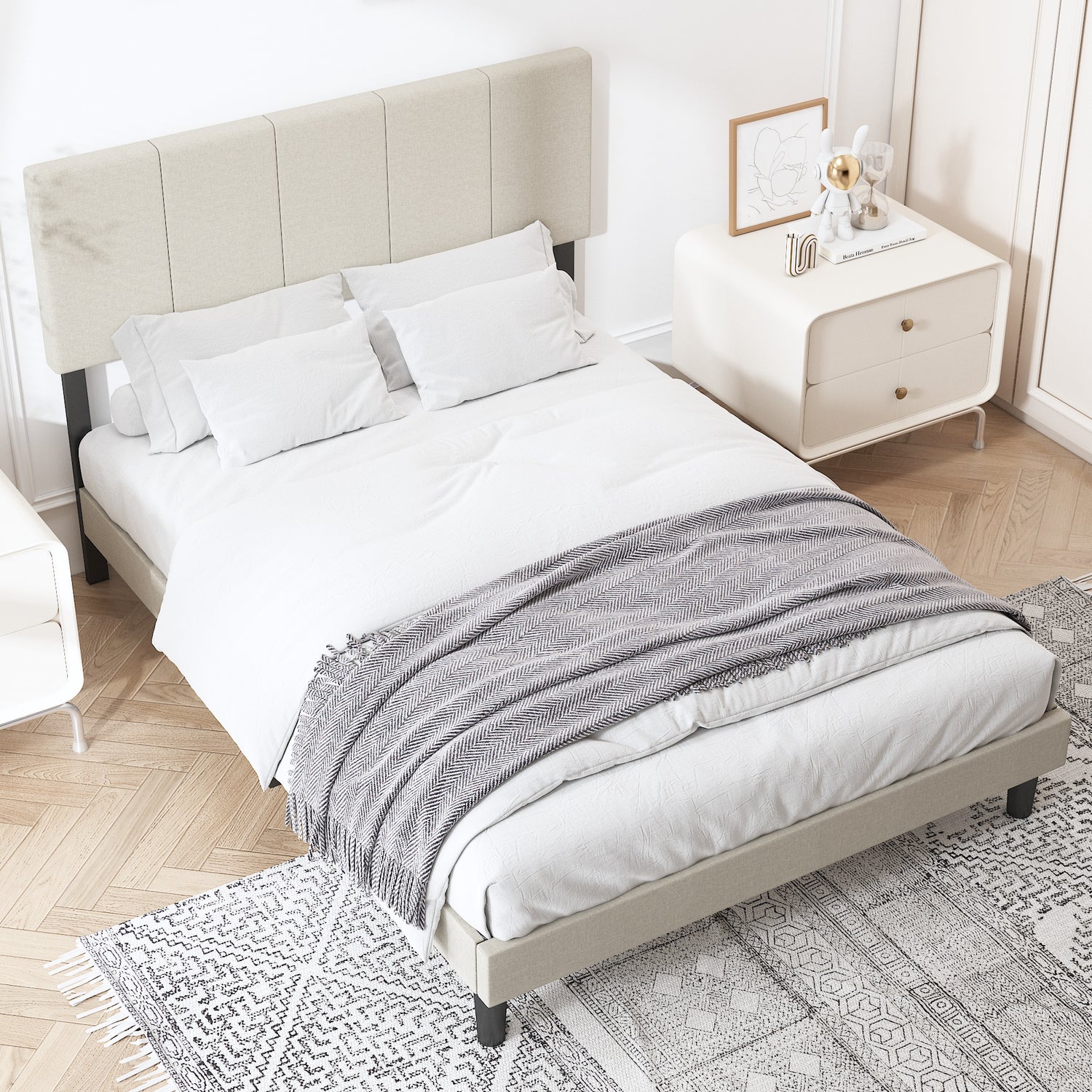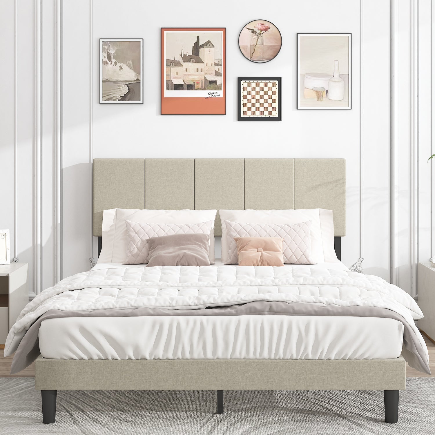 SYNGAR Full Size Platform Bed Frame with Fabric Upholstered Headboard, Sturdy Metal Frame and Strong Wooden Slats, No Box Spring Needed, Beige