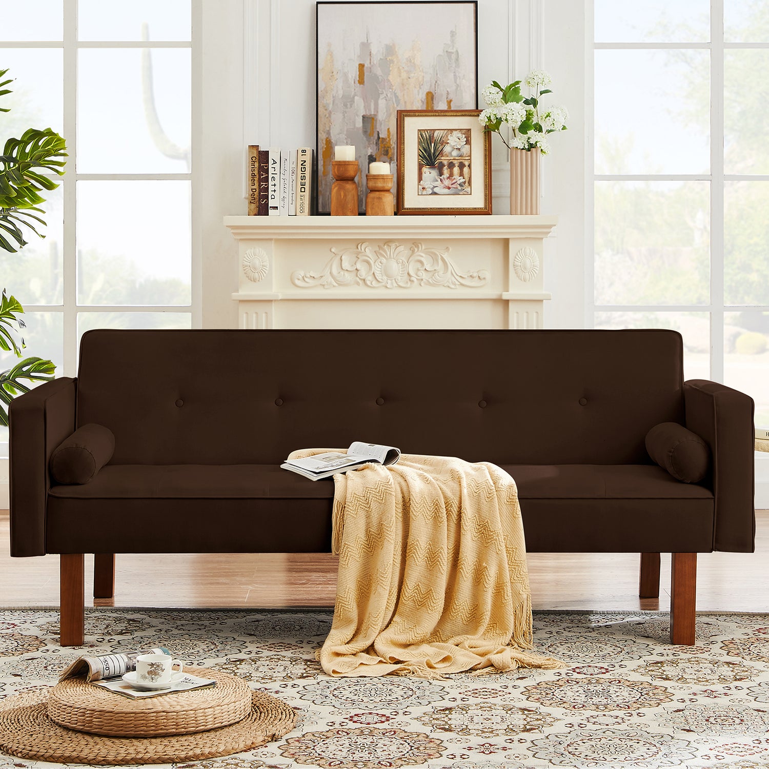 Made of durable velvet and solid wood frame, the SYNGAR futon sofa bed is simple and quick to assemble, modern in design, and affordable, very suitable for your beautiful living room or bedroom.
