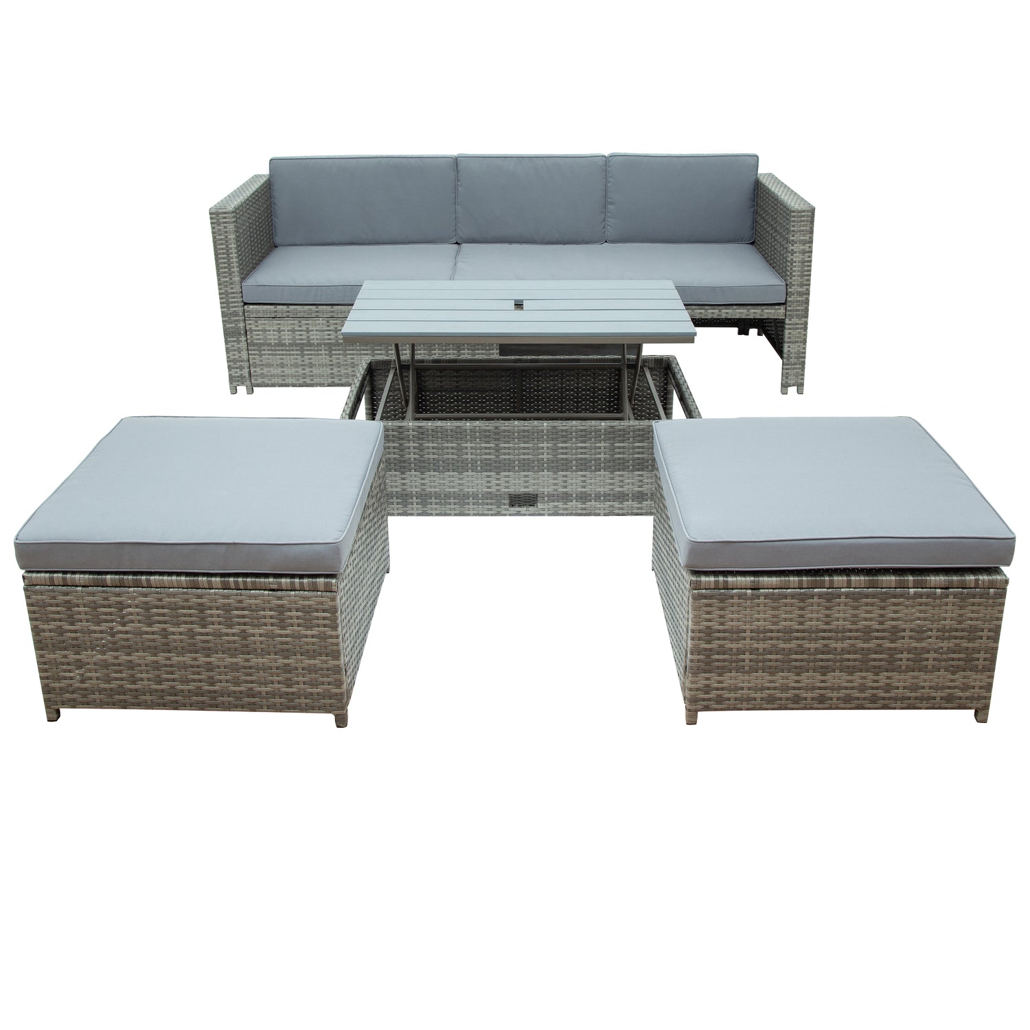 This sofa set includes a 3-seater sofa and 3 ottomans (one is a lift table). The tabletop of the multifunctional table has an opening, and the table can be easily raised and lowered by reaching in. And, our cushions for combined rattan furniture are up to 2.4 inches thick to give you a better experience. All parts of the outdoor sofa set are separate and can be freely combined for different purposes. This modern and classic patio set is designed to fit in limited spaces, The table can be placed under the 3-seater sofa to create a compact and convenient way to store the set.