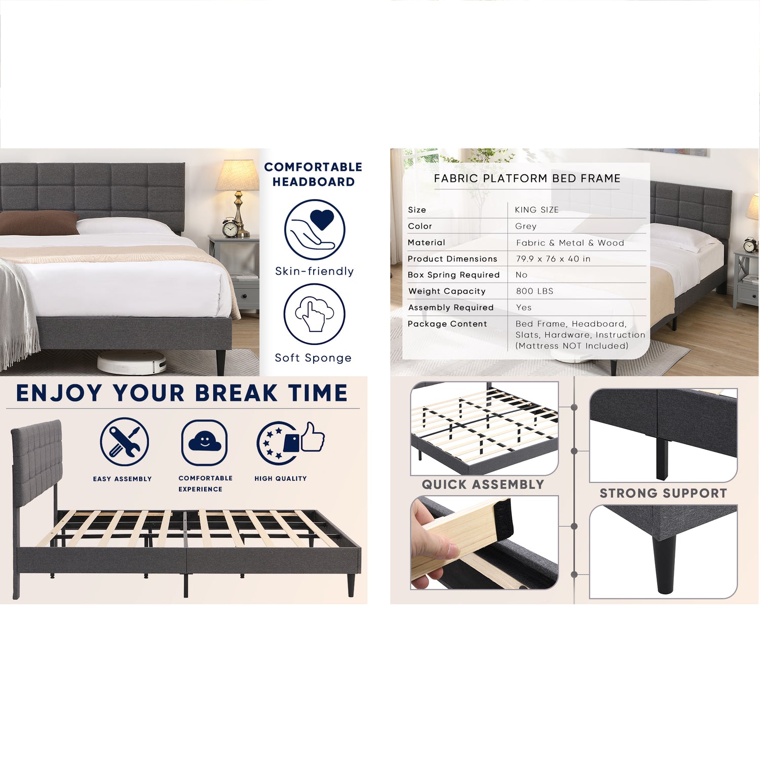 Includes a comfortable headboard, sturdy metal frame, strong wood slats, and support legs of the bed to support your memory foam, latex, or spring mattress (not included). Made of quality fabric upholstered, metal frame, and wood slats, this platform bed is very durable and sturdy and can serve your family for years.