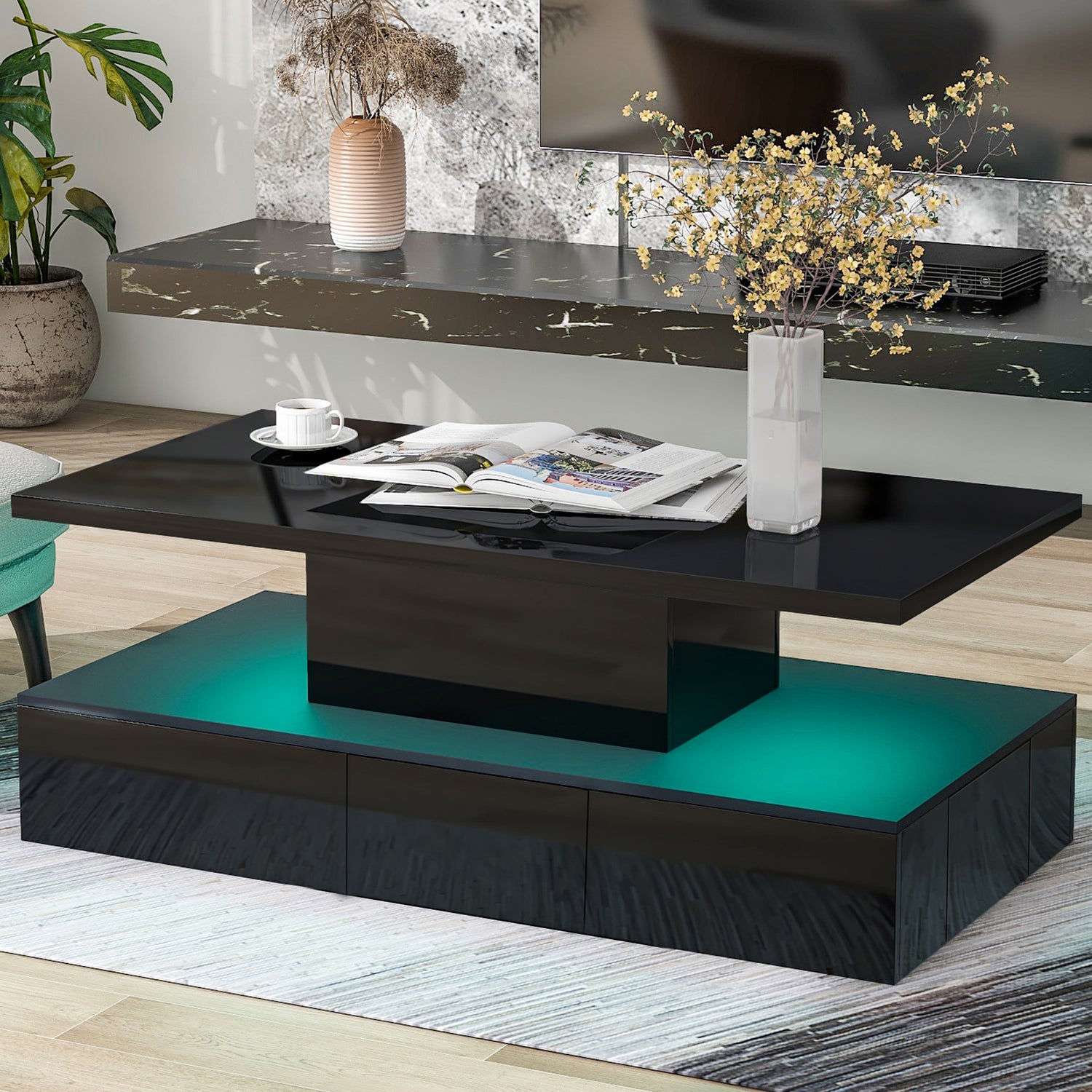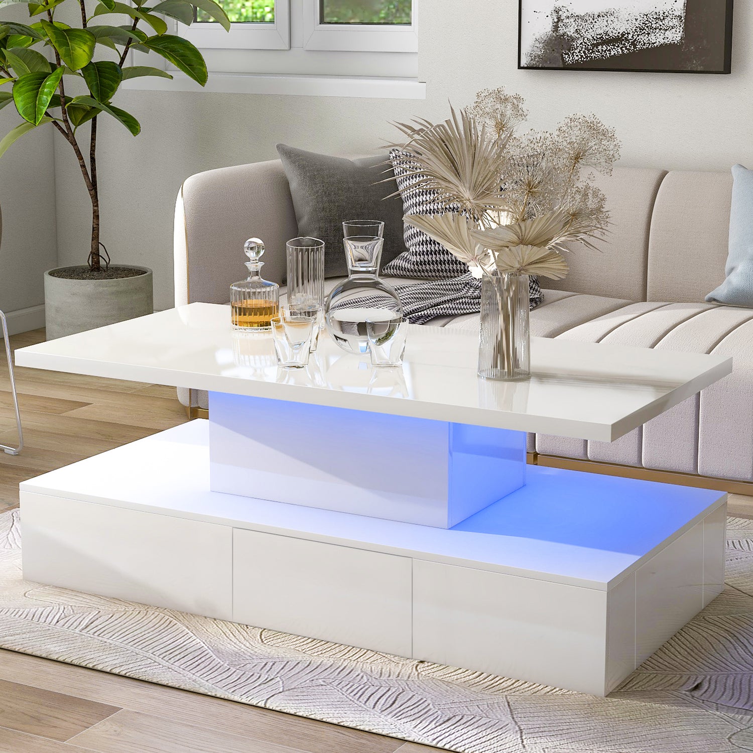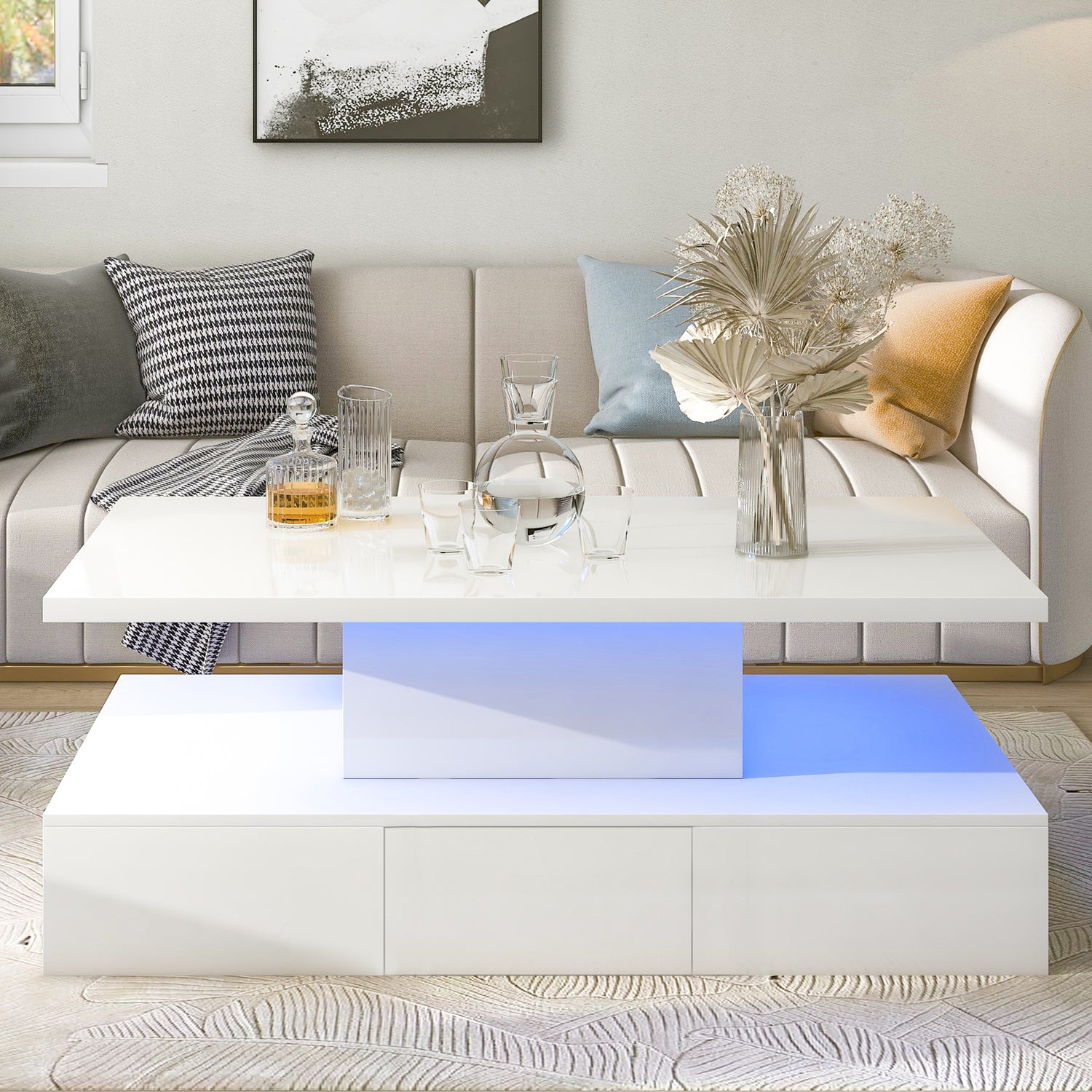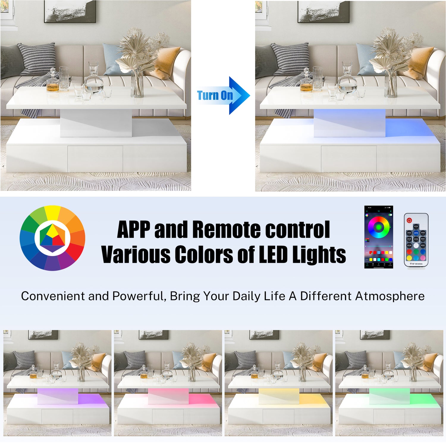 The bottom of the high-gloss coffee table is designed with multi-colored LED lights, which can be controlled by voice, remote control, or mobile APP. The fantastic design will provide an attractive visual experience, especially at night. Equipped with four drawers and smooth slides, it provides extra storage space to store daily necessities for easy access, keeping your living room organized.
