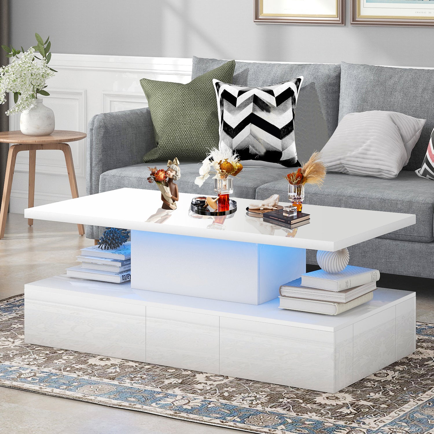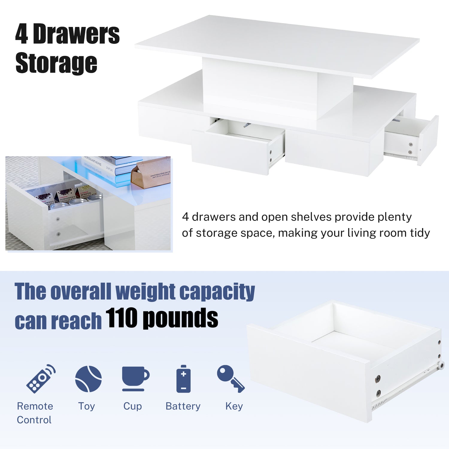 SYNGAR LED Coffee Table with 4 Storage Sliding Drawers and Open Shelves, Modern High Glossy Center Table Rectangular with Multiple Colors LED Lights for Living Room Bedroom, Easy Assembly, White