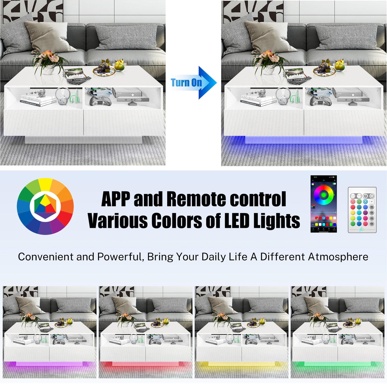 The bottom of the high-gloss coffee table is designed with multi-colored LED lights, which can be controlled by voice, remote control, or mobile APP. The fantastic design will provide an attractive visual experience, especially at night. Equipped with four drawers and smooth slides, it provides extra storage space to store daily necessities for easy access, keeping your living room organized.