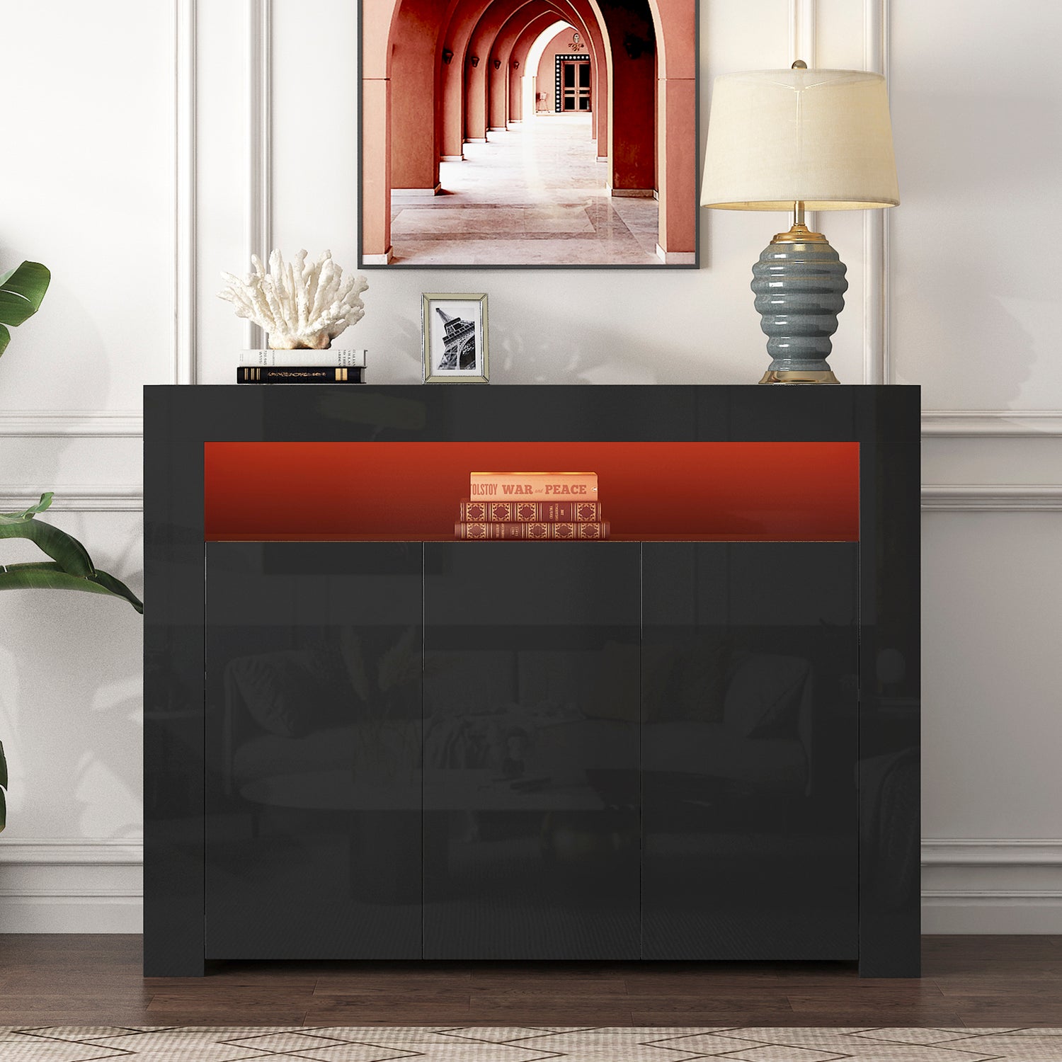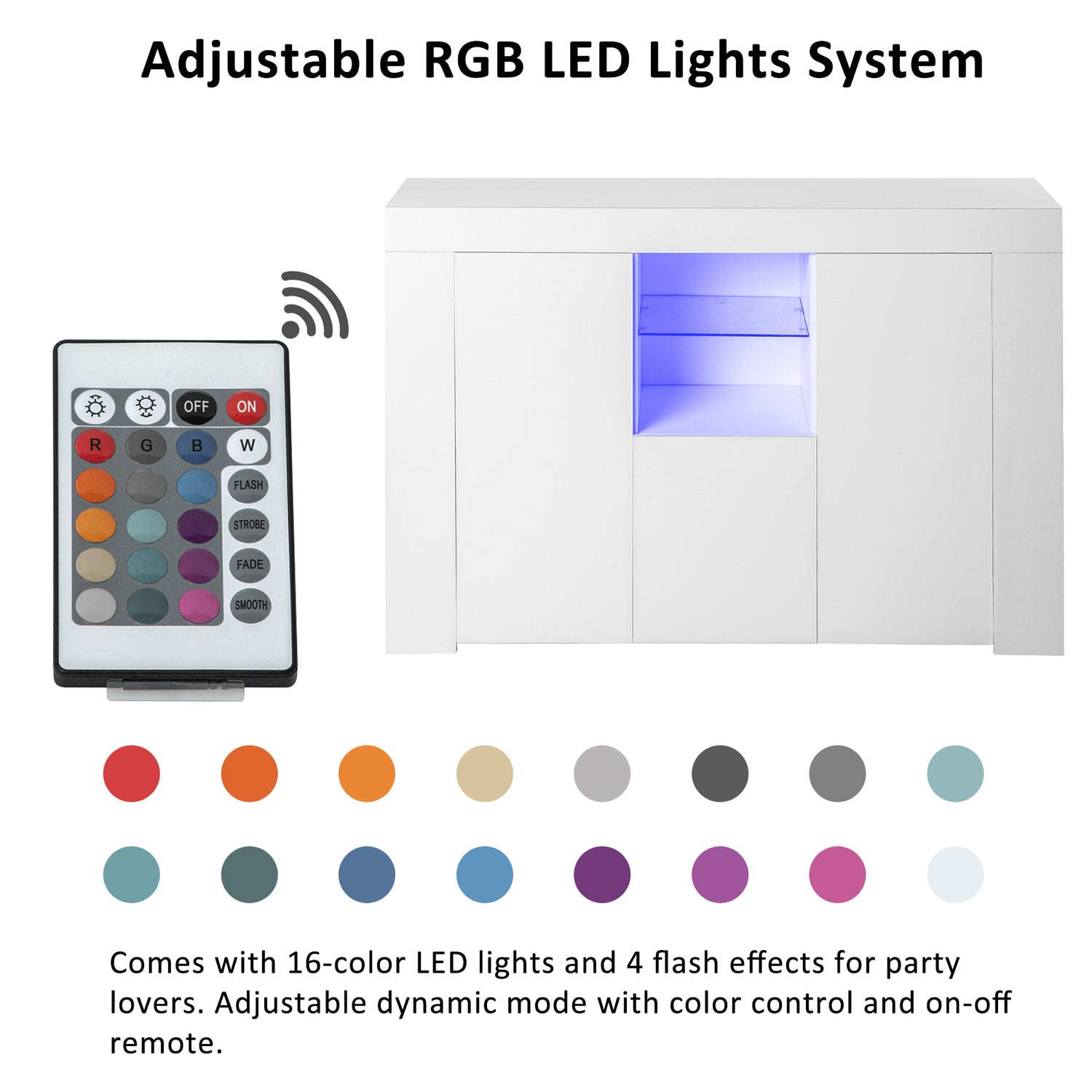 This Console Table is made of solid quality particleboard, the surface is smooth and easy to clean, and brings a fashionable feeling. And our sideboard cabinet with LED lights system, elegant enough for adding special charm to your house. And the 16 colors of LED lights of this console can be changed and adjusted remotely, which is very festive and warm. The modern entryway table is suitable for your living room, bedroom, kitchen, dining room, lounge room, entryway, and more places. And this buffet cabinet fits in well with most home decors, which is also an ideal solution for household storage.