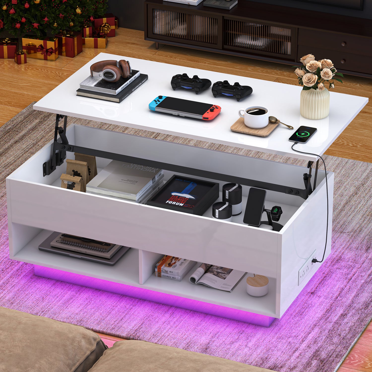 Enhance your living room with this Lift Top Coffee Table, featuring a large hidden storage compartment and modern open storage shelves. The high-gloss table top provides a sleek, contemporary feel, making it a perfect addition to your home decor. This versatile coffee table comes equipped with an LED light and a convenient charging station, ensuring your devices stay powered while adding a stylish touch to your space. Ideal for both functionality and aesthetics, this coffee table is a must-have for any modern living area.