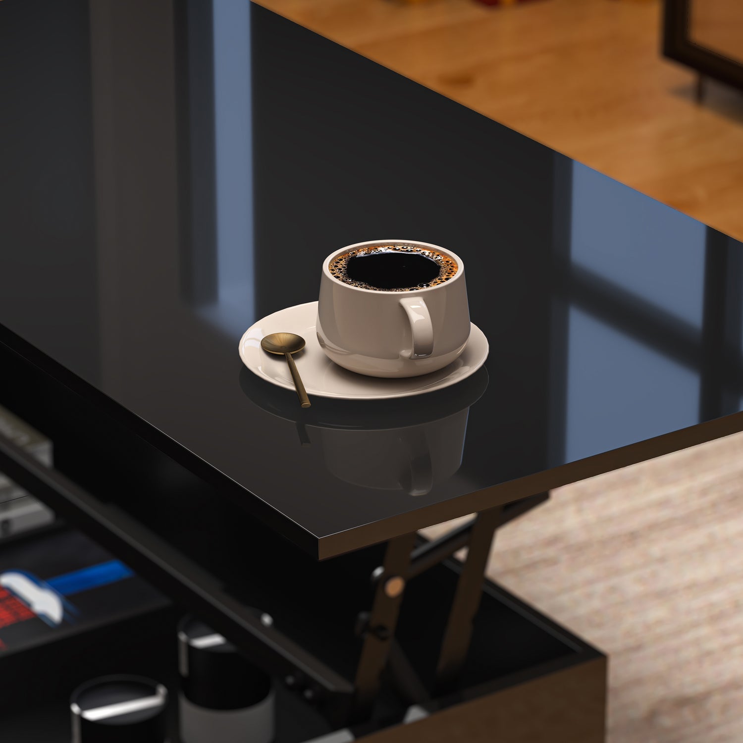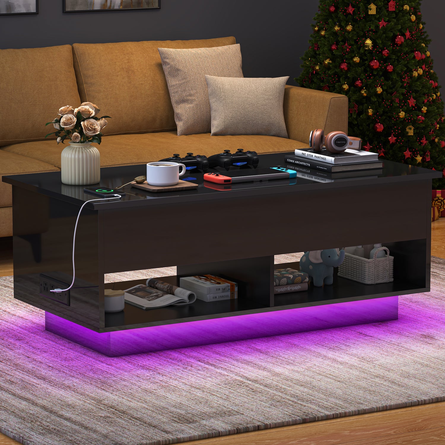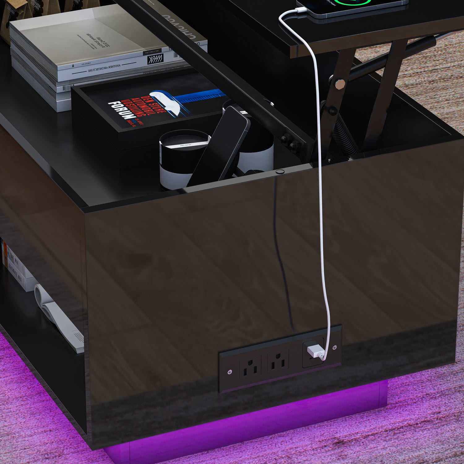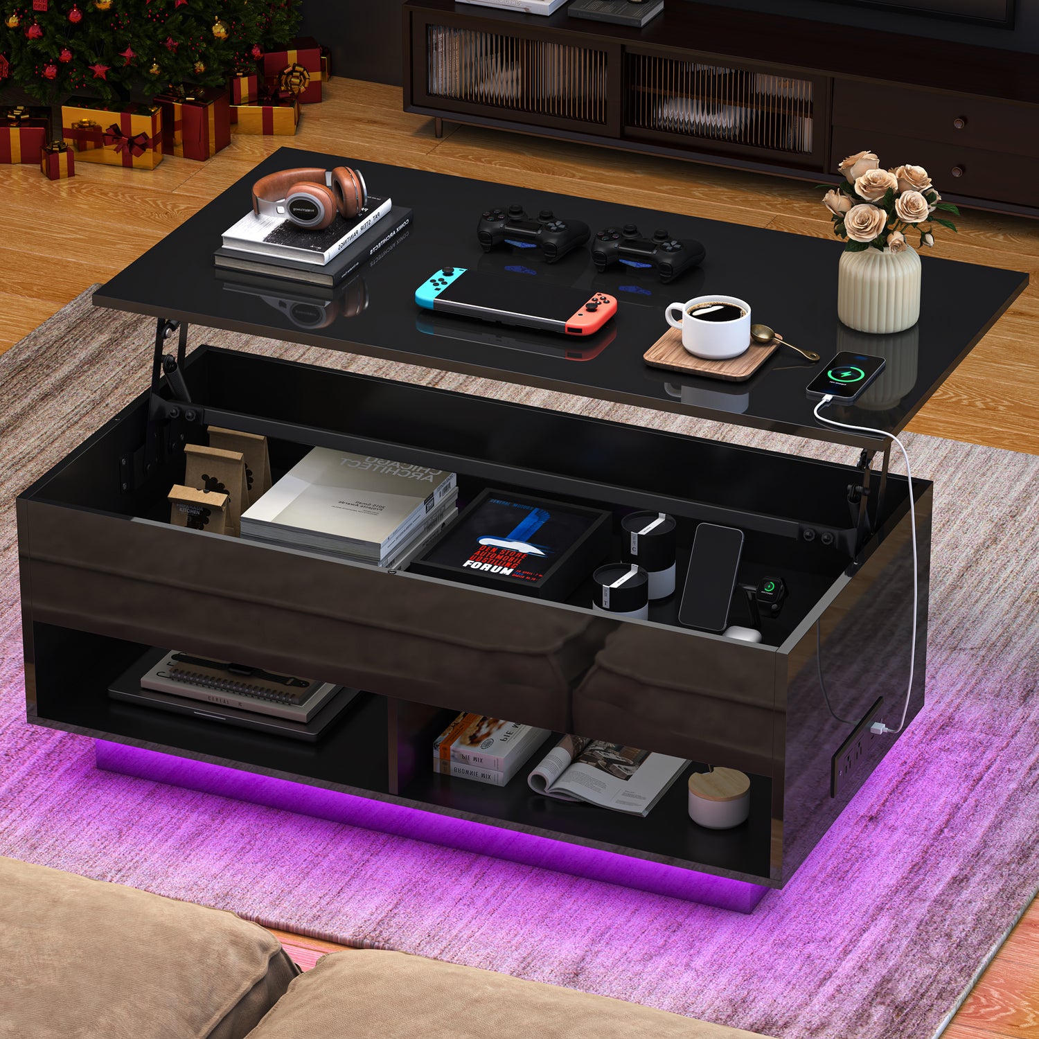 SYNGAR Lift Top Coffee Table for Living Room, Large Hidden Storage Lift Top Coffee Table with LED Light and Charging Station, Modern Coffee Table with Open Storage Shelves, Black