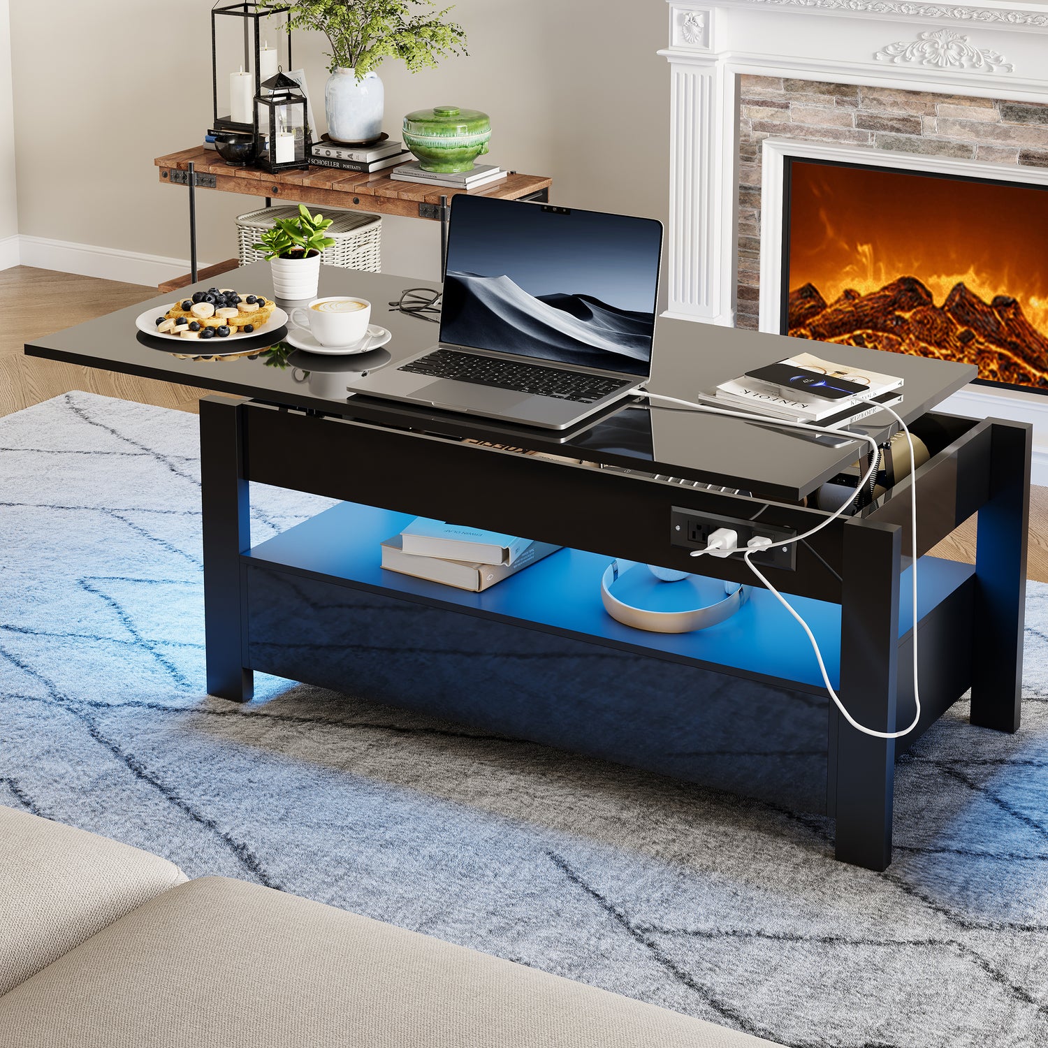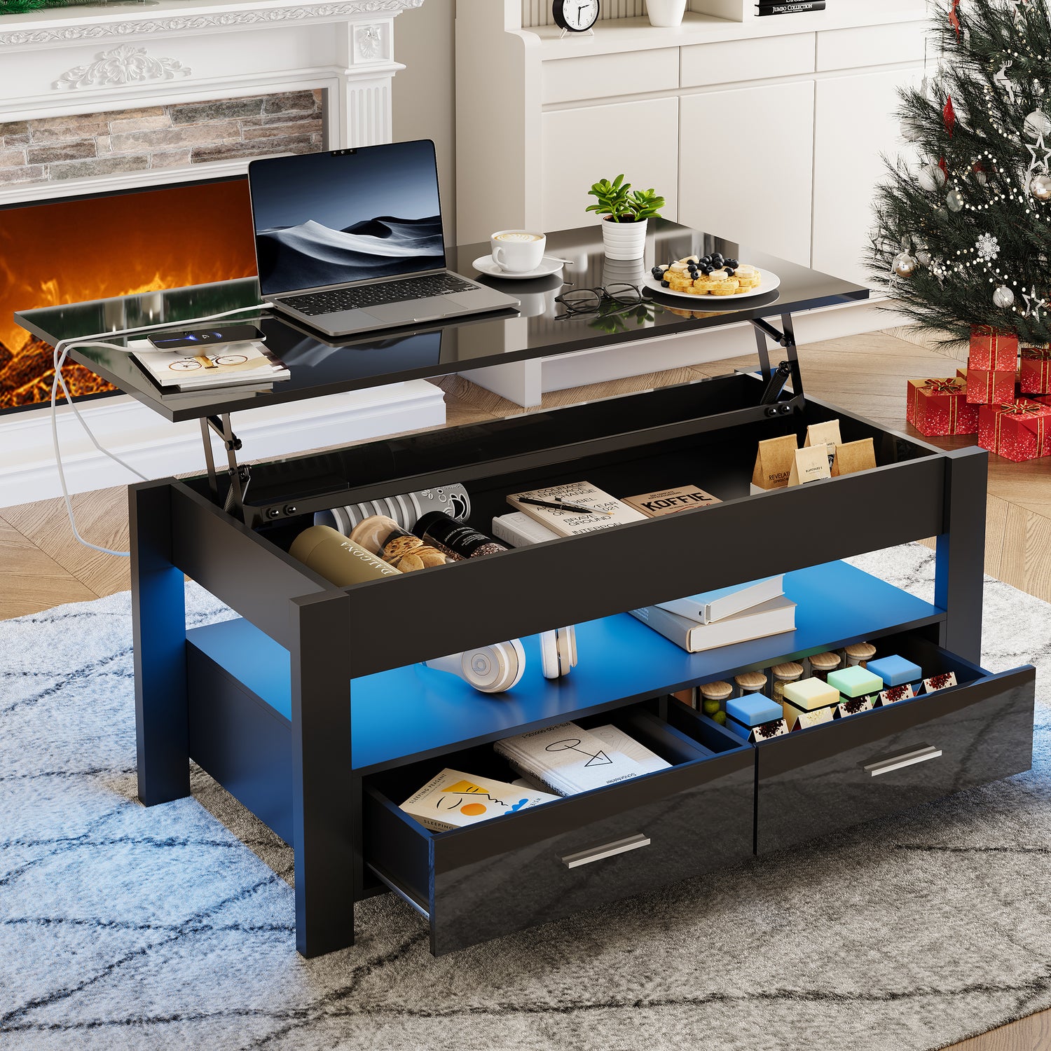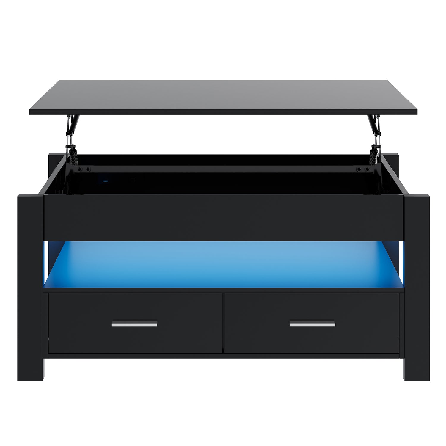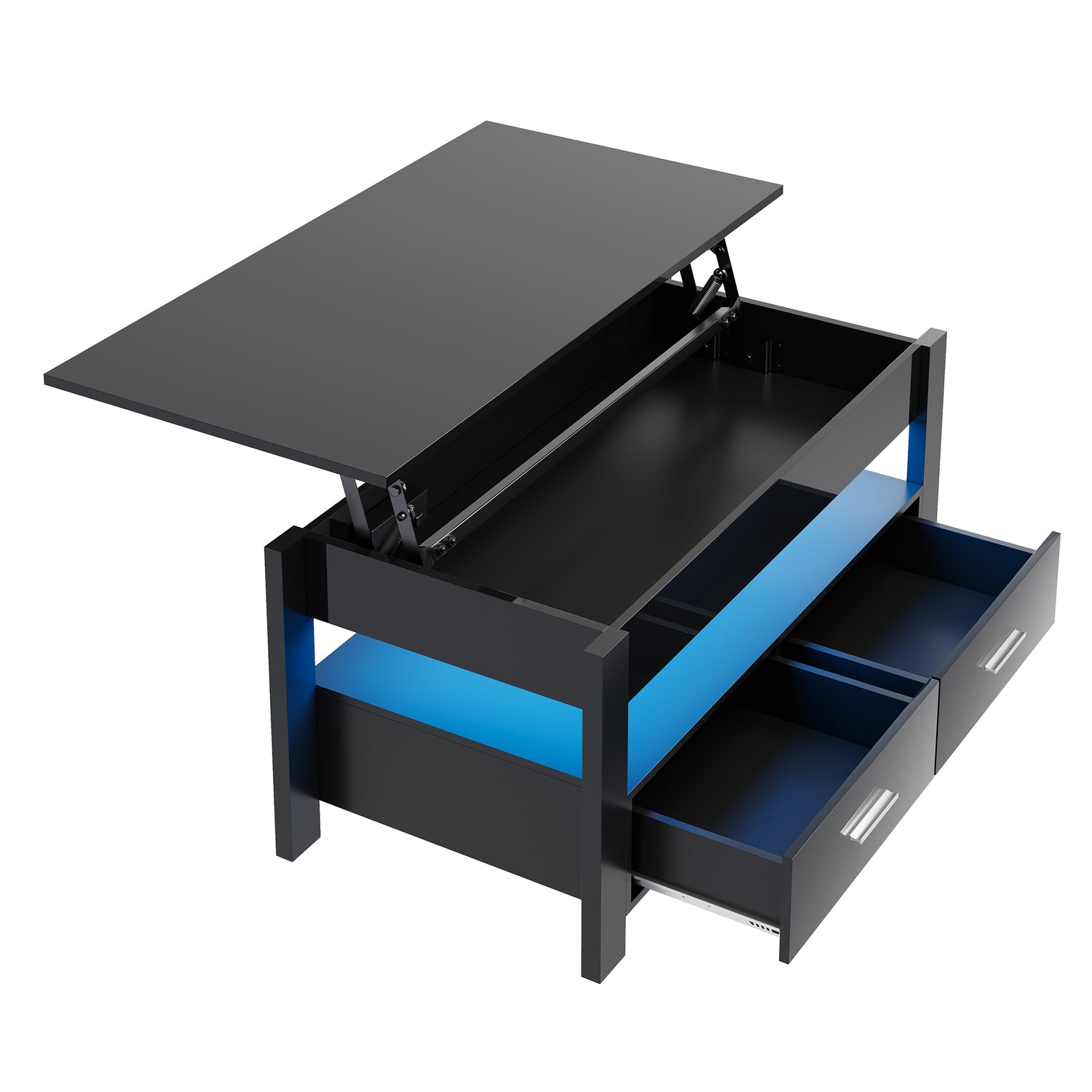 SYNGAR Lift Top Coffee Table with LED Light, Modern Coffee Table with Large Hidden Storage and Two Drawers, Wood Coffee Table with Lifting Top for Living Room, Black