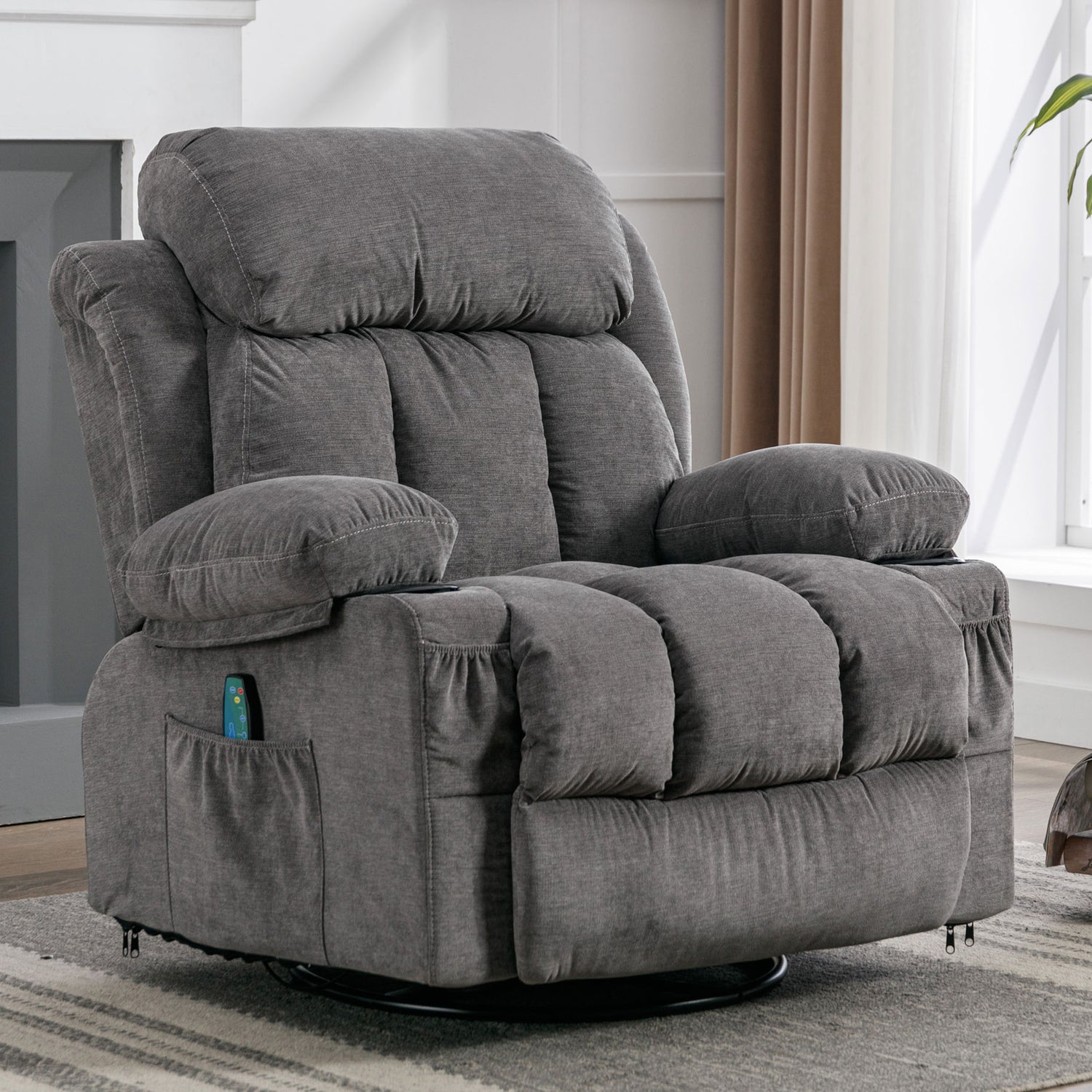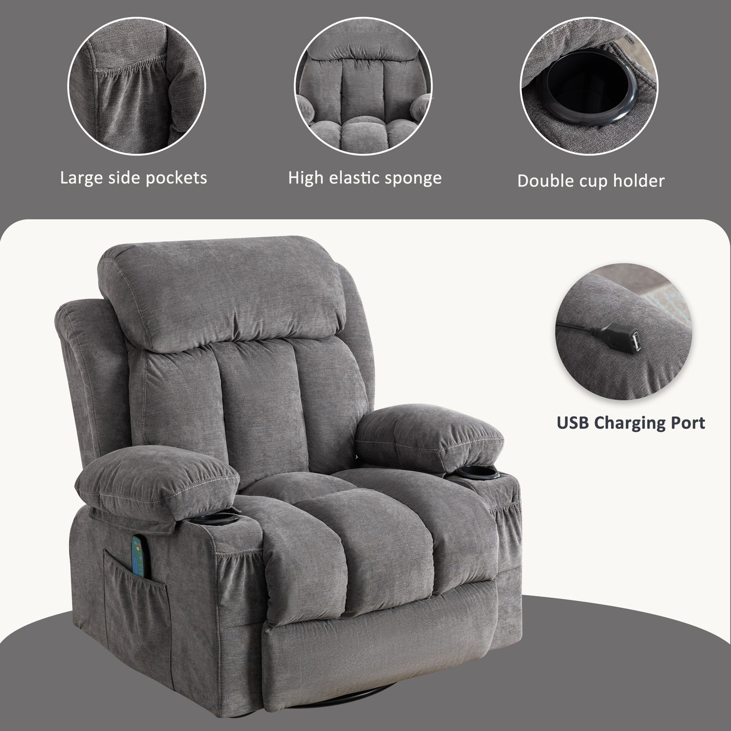 SYNGAR Manual Recliner Chair with Heat and Massage Function, USB and Cup Holders, Elderly Single Velvet Recliner Rocker Sofa Swivel Glider Chair for Nursery Living Room Home Theater Office, Gray