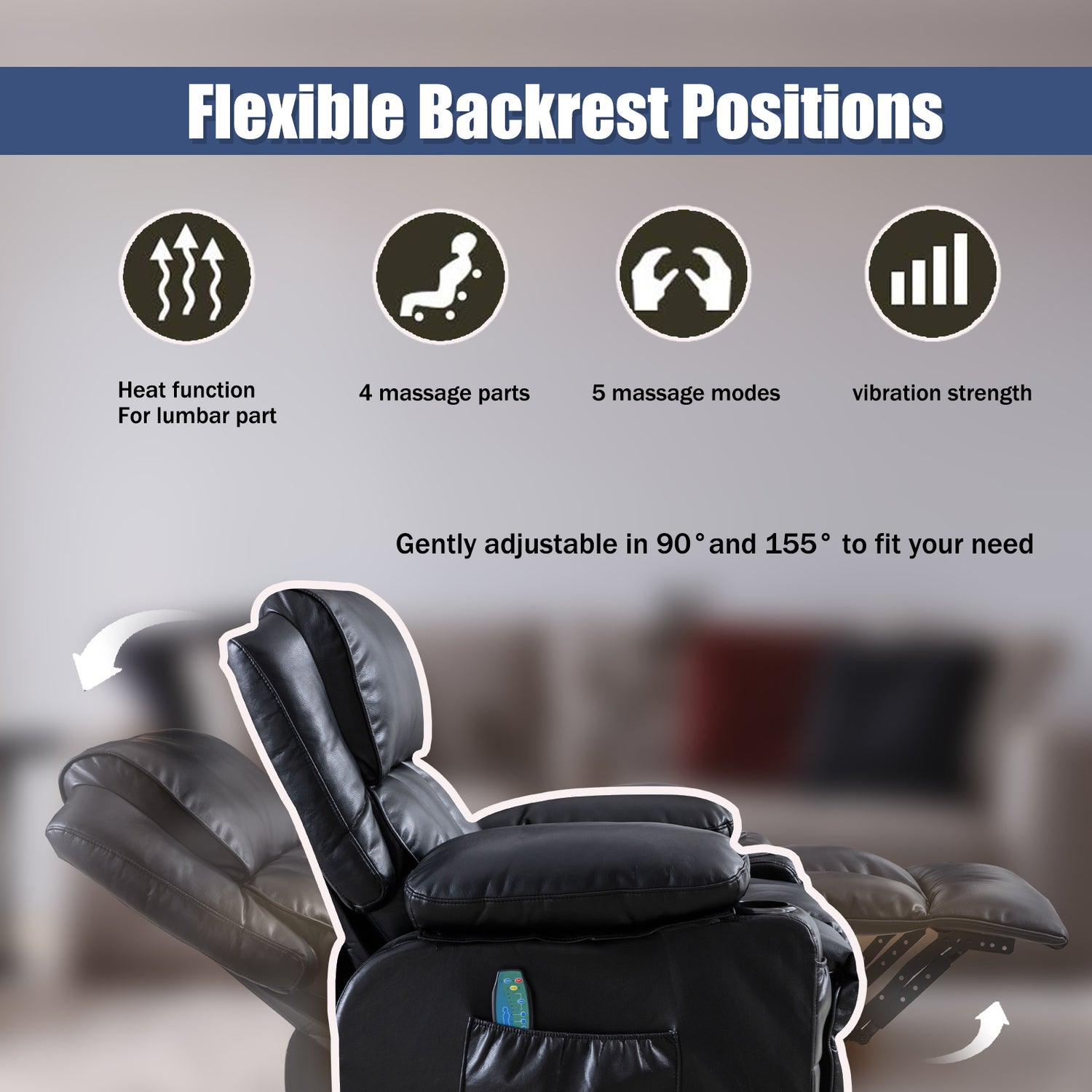 SYNGAR Manual Recliner Chair with Heat and Vibration Massage, Faux Leather Elderly Single Reclining Rocker Sofa with USB Charge Port, Cup Holders and Side Pocket for Bedroom Home Theater, Black