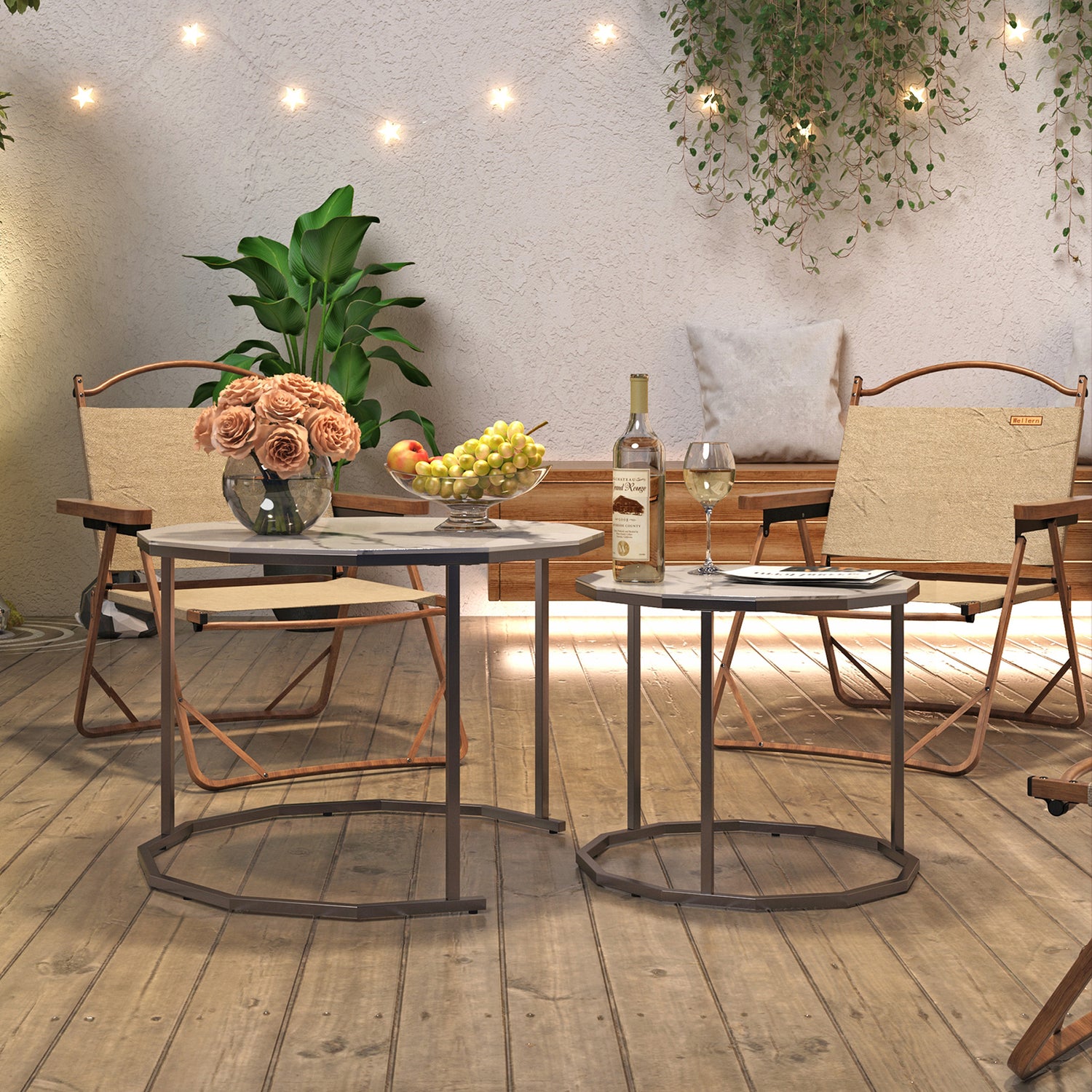 SYNGAR Lovely and stylish nesting coffee table top with artificial marble finish, smooth surface, comfortable hand feeling, overall waterproof, stain-proof and easy to clean, safe tabletop and base, avoid unnecessary collision and injury. And the semi-circular steel frame and the cleverly designed a 12-sided table top make the nesting table more beautiful, you can use them individually or stack them together as needed. You can indulge in the charm and convenience that this lovely table set brings to your living room.