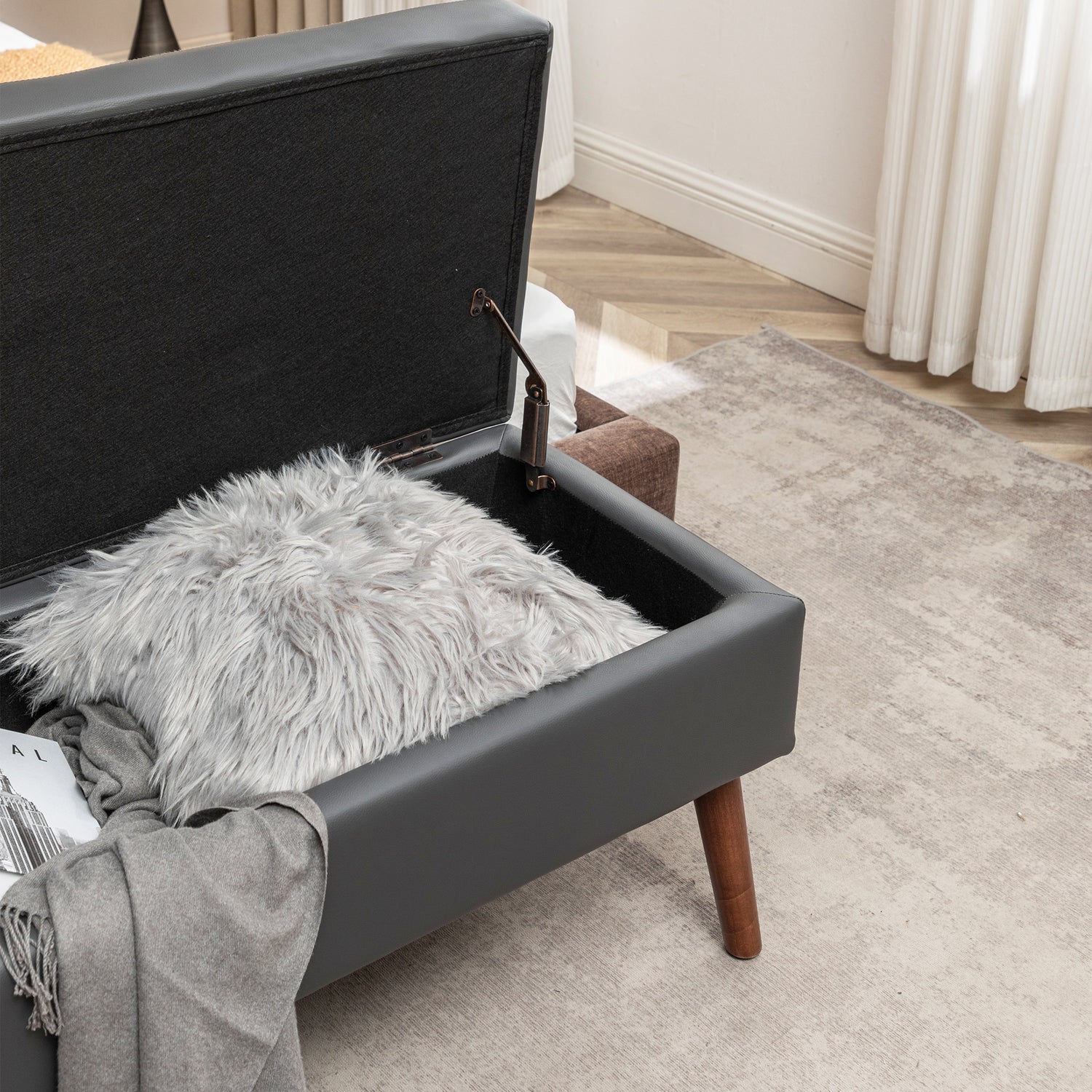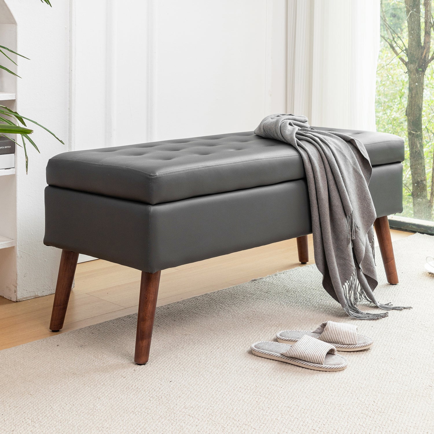 Syngar Modern Storage Bench, Upholstered Storage Ottoman with Wood Leg, PU Leather Entryway Bench with Storage for Living room, Bedroom, and Shop, Capacity of 300lbs, Easy Assemble