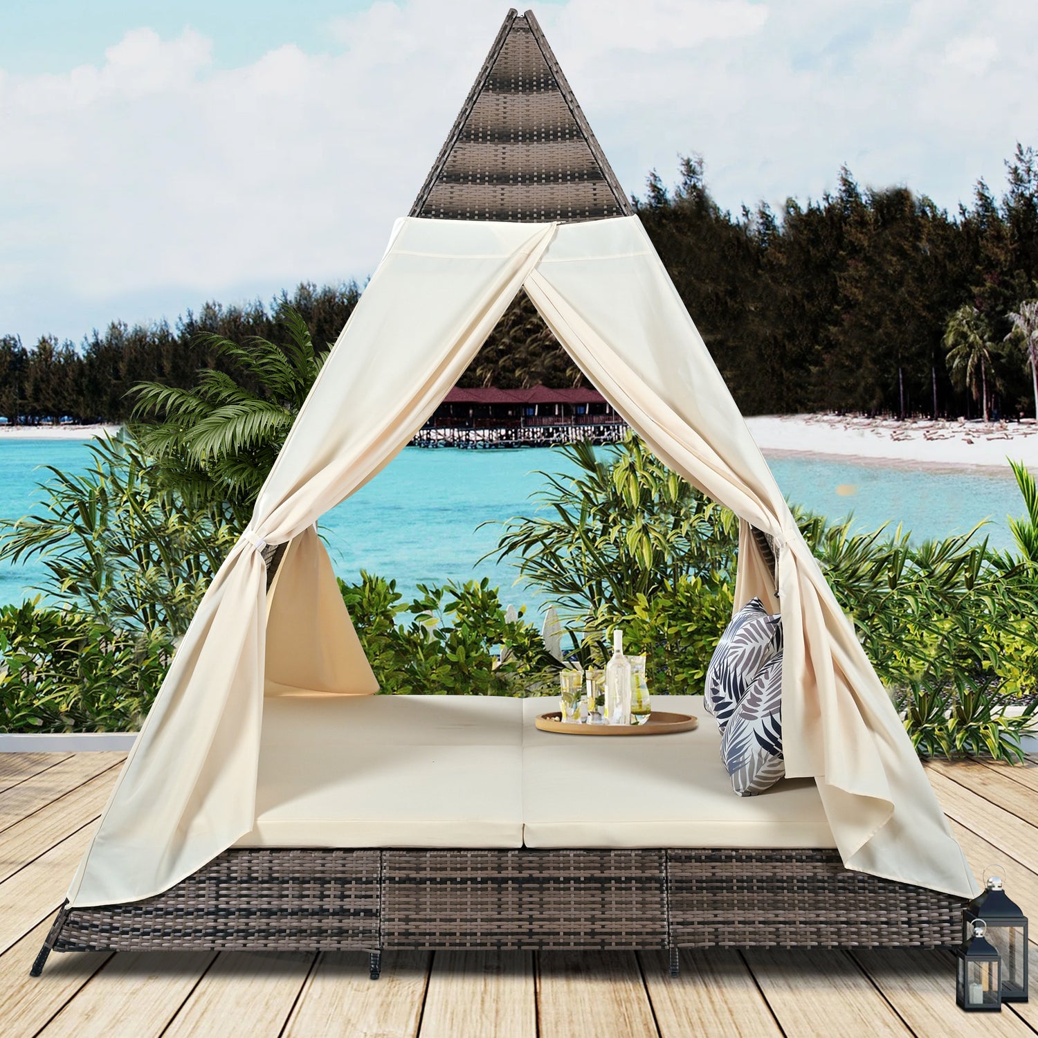 Syngar Outdoor Patio Sunbed with Removable Curtain, All Weather PE Wicker Tent-Shaped Daybed with Beige Cushions and Colorful Pillows, Patio Furniture Set for Garden Porch Deck Poolside