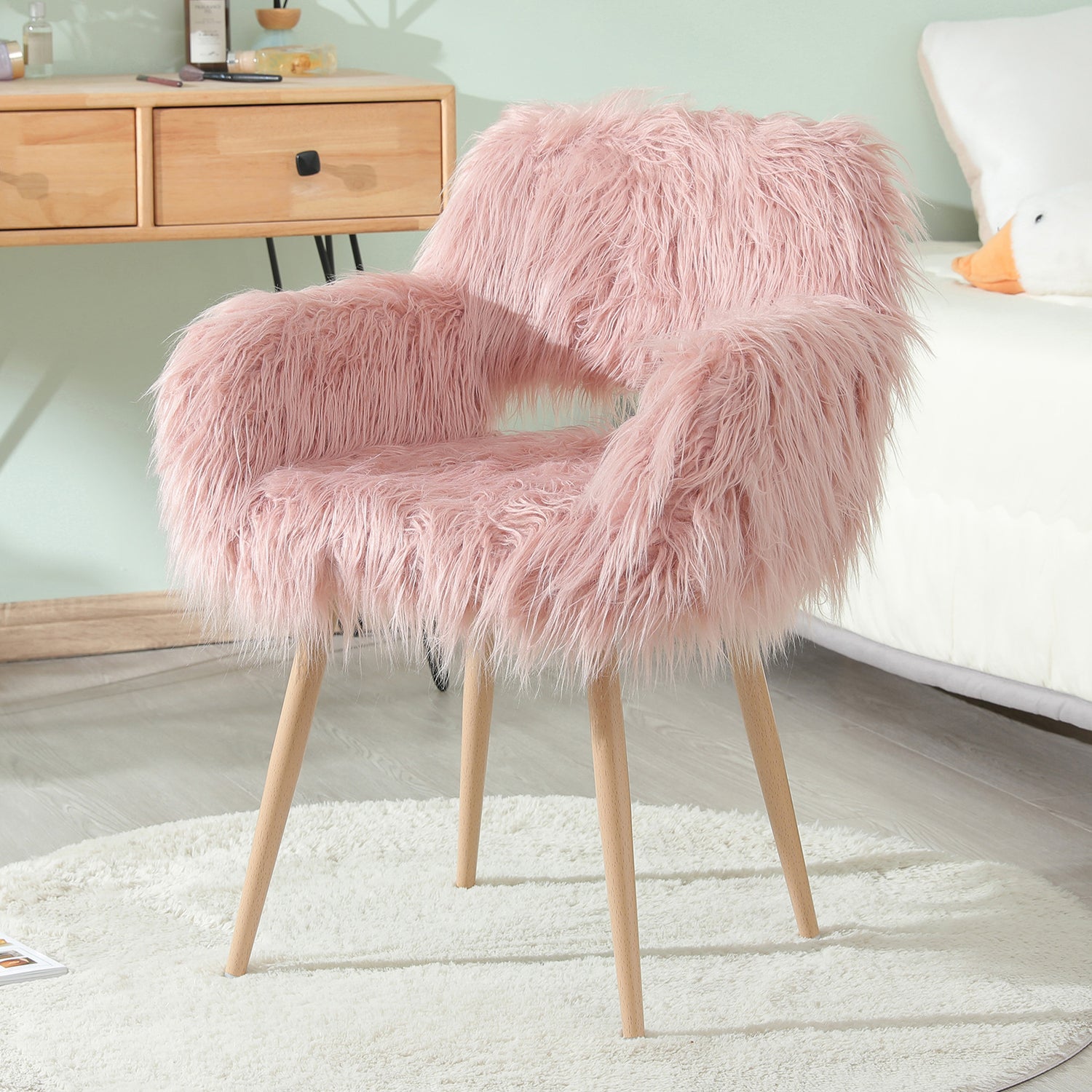 SYNGAR Pink Faux Fur Upholstered Chair for Bedroom, Cute Desk Chair with Backrest and Armrest, Elegant Makeup Vanity Chair with Wood Style Metal Leg for Living Room, Easy Assemble