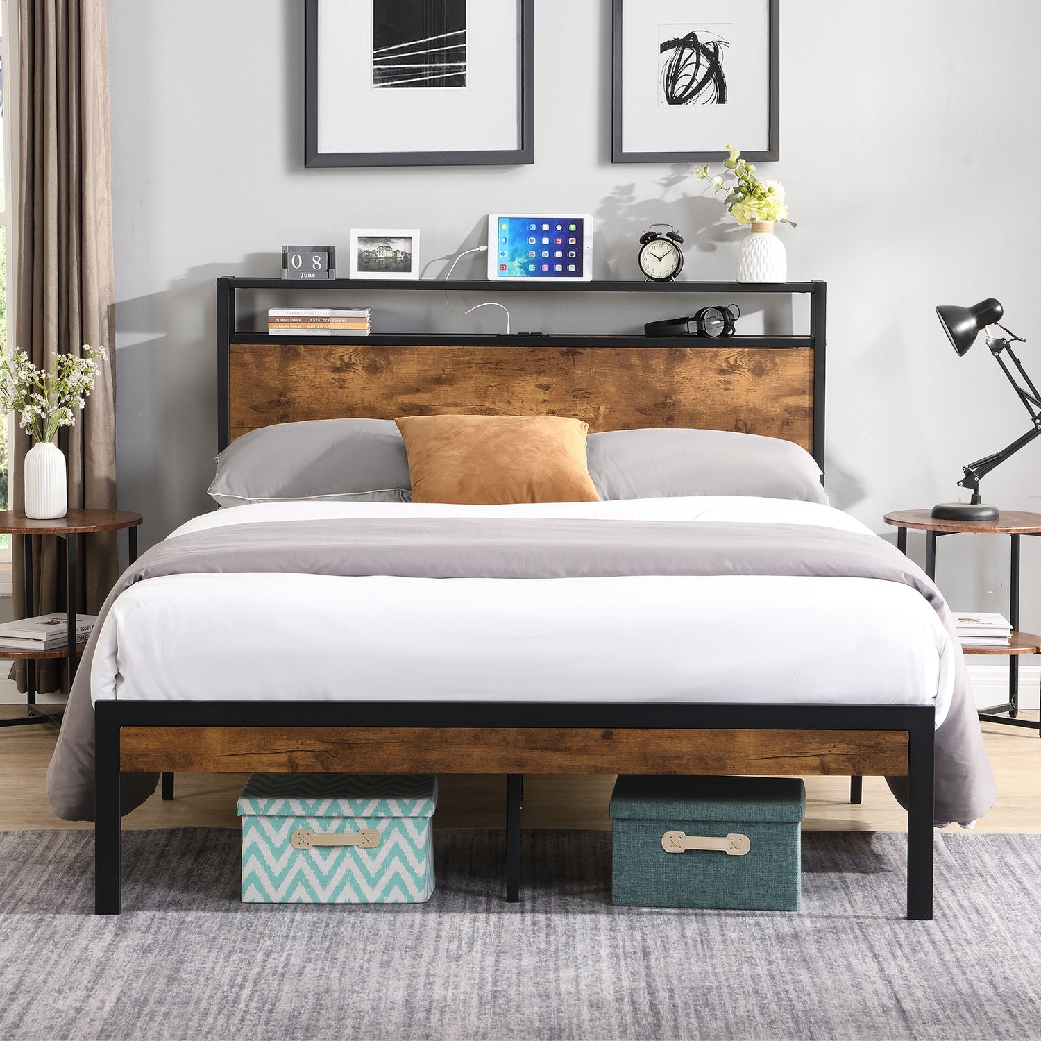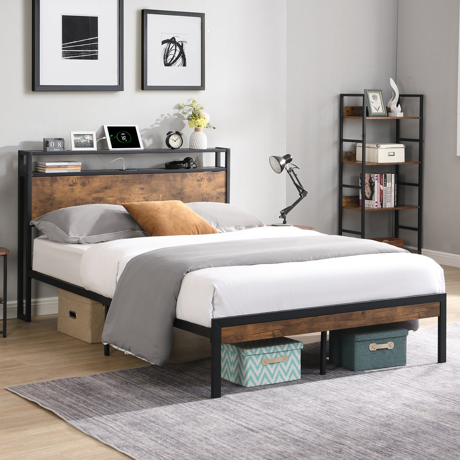 Metal Bed with Storage Headboard