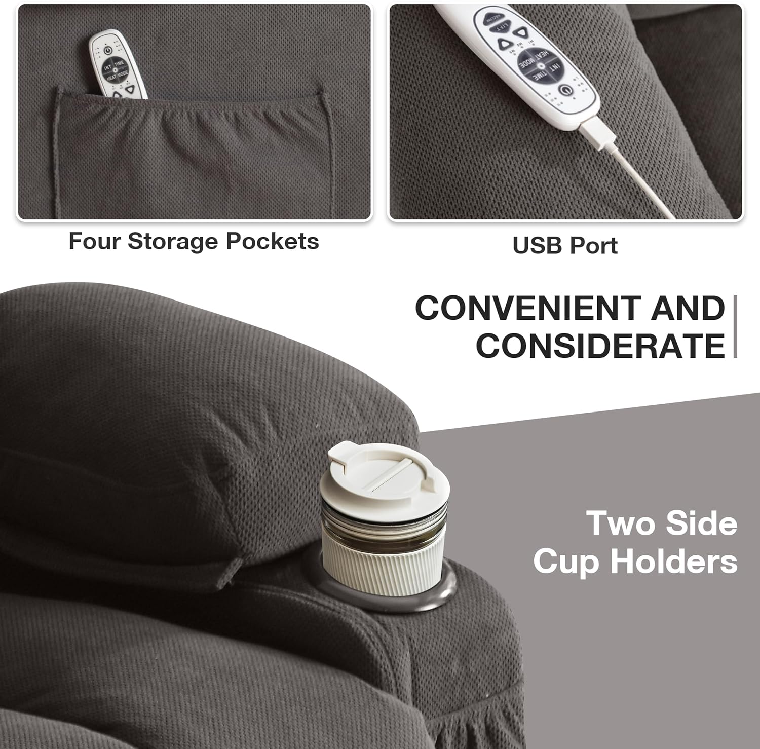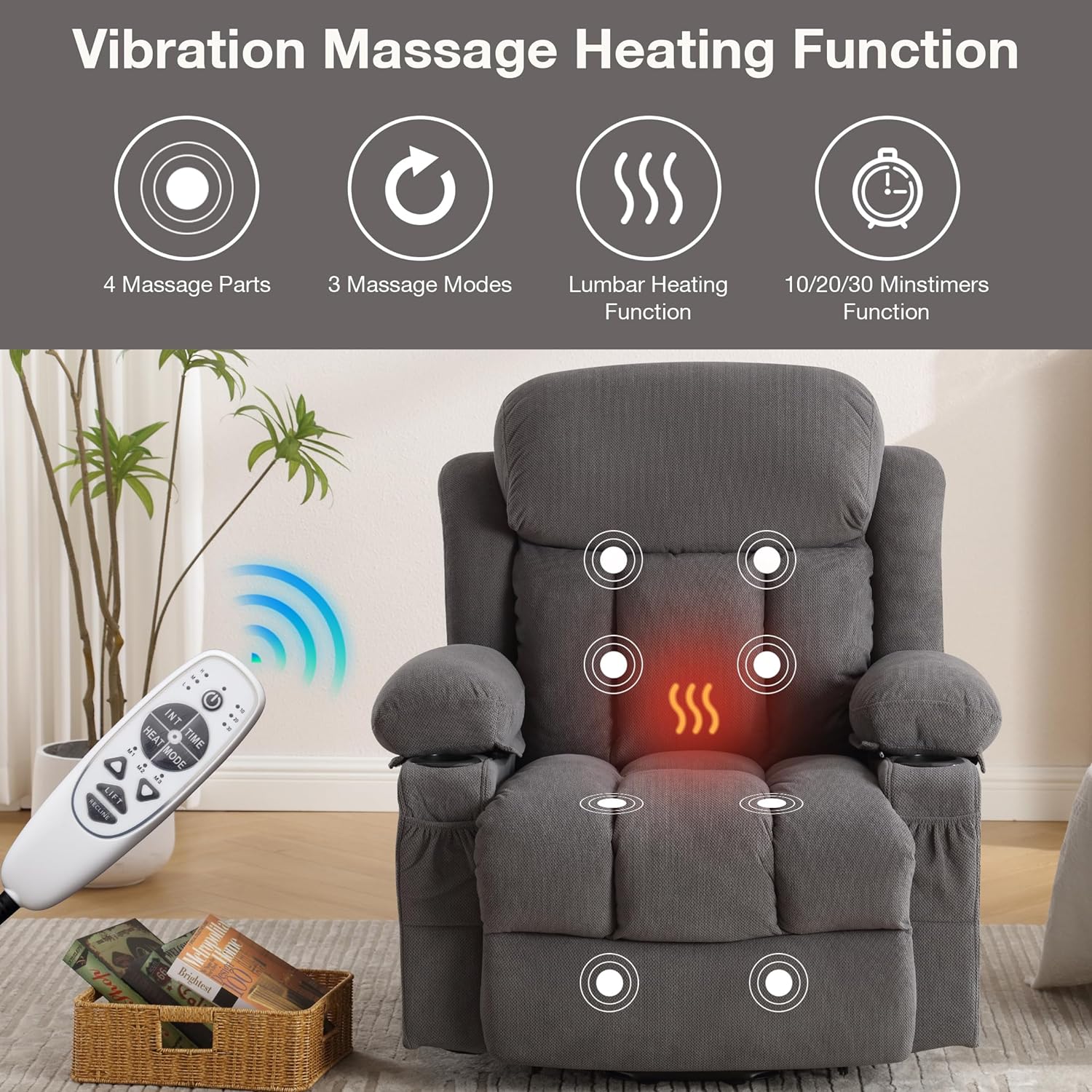 Whether reading a book, watching a movie, or taking a nap, a comfortable recliner chair can ease the stress of a busy day. Wide armrest for support and comfort with a high back, thick cushion, and high-grade antiskid upholstery, provide a very comfortable sitting feel and enhance safety. The 8 points vibration massage and heat function offers you a full body massage at home. 2 cup holders keep your thermos close at hand, and there are large side pockets or front pockets for magazines and cell phones.