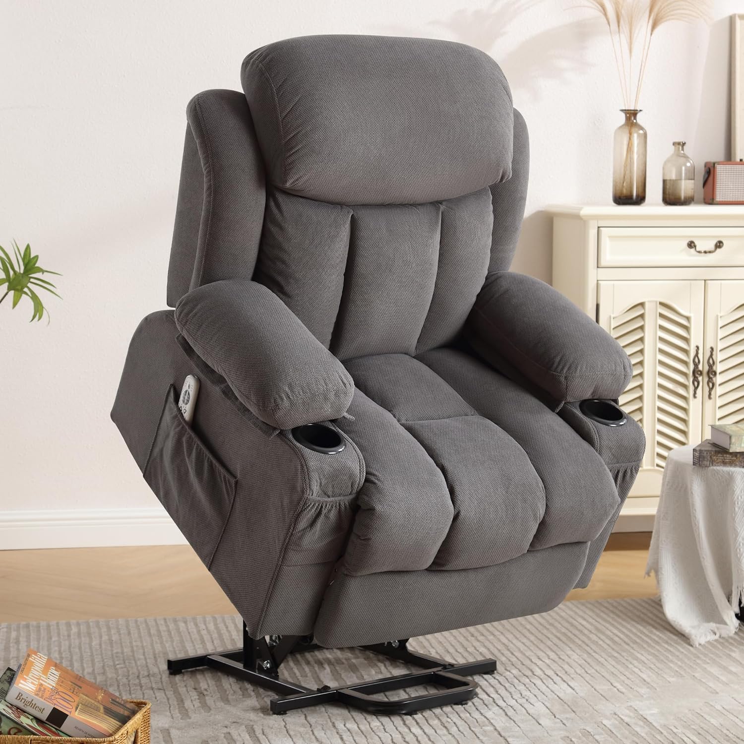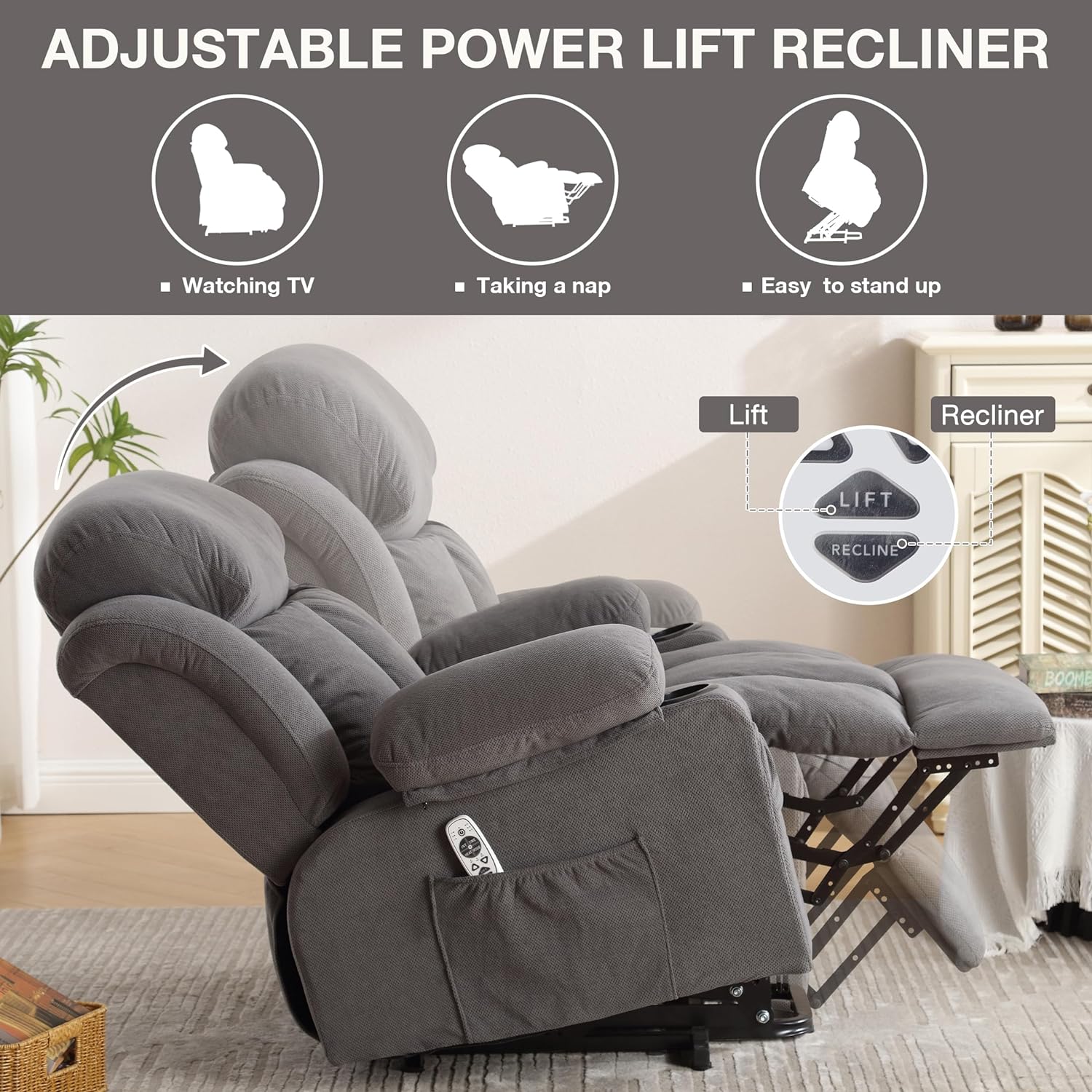SYNGAR Power Lift Recliner Chair for Living Room, Electric Recliner Chair with Heat and Massage Function, USB Charge Port and Cup Holders, Oversized Velvet Reclining Sofa for Home Theater, Gray