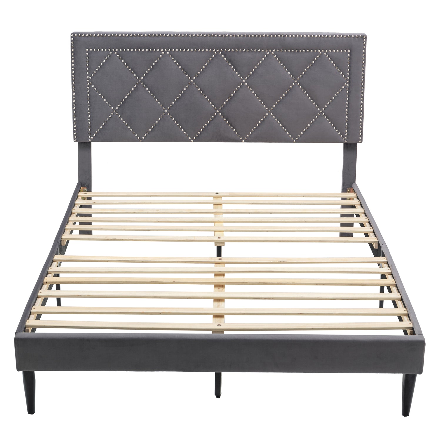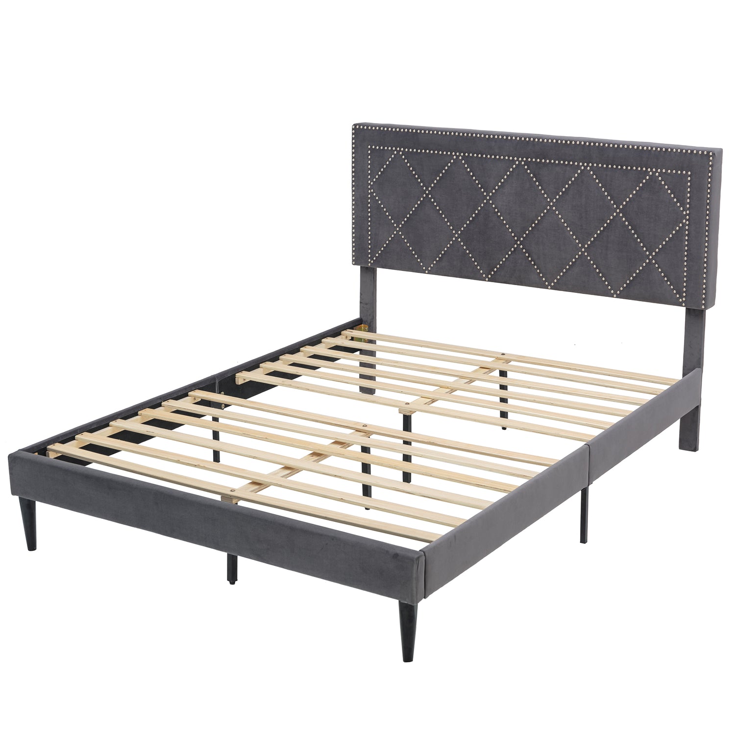 SYNGAR Queen Fabric Upholstered Bed Frame with Nailhead Trim Headboard, Platform Bed Frame Queen Size Bedroom Furniture for Teens Adults, No Box Spring Needed, Gray