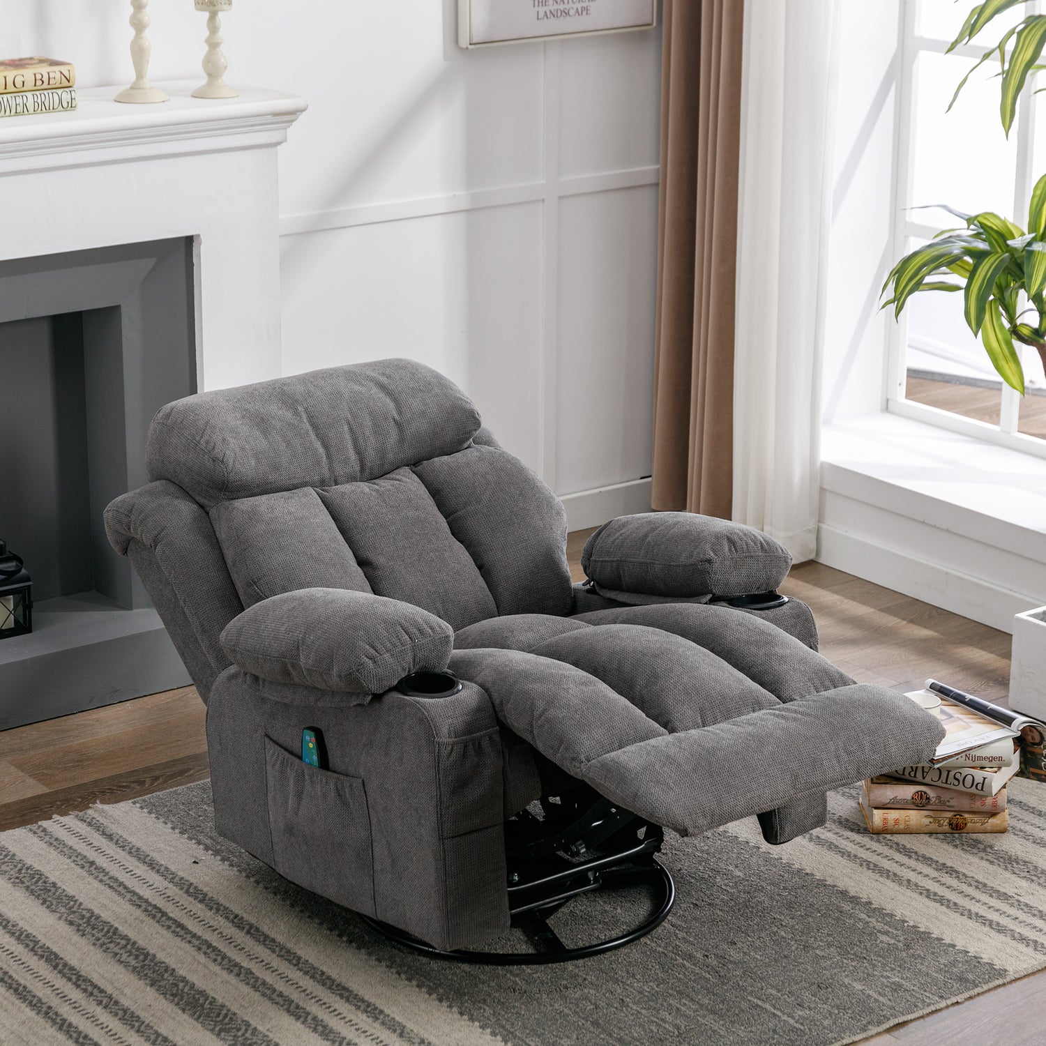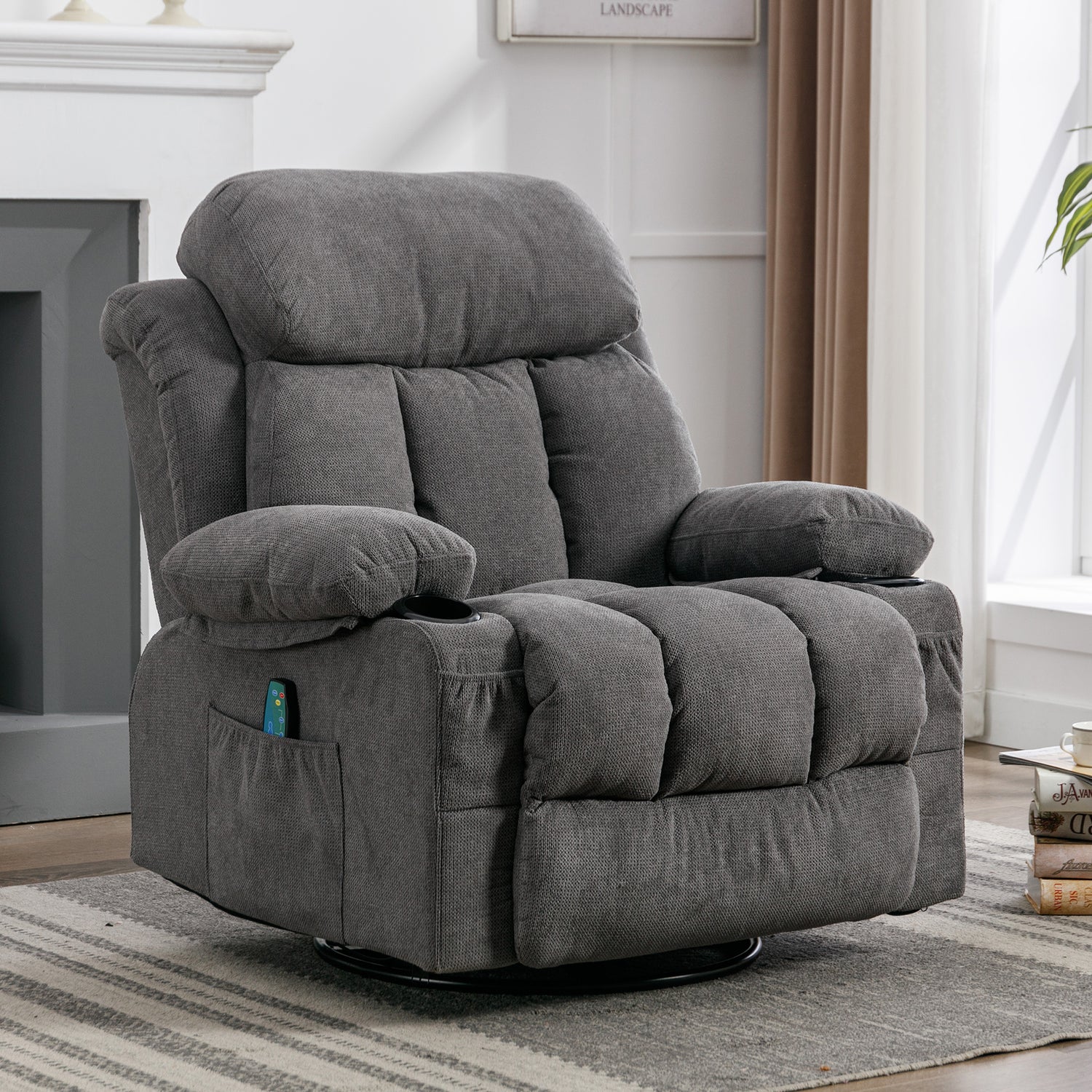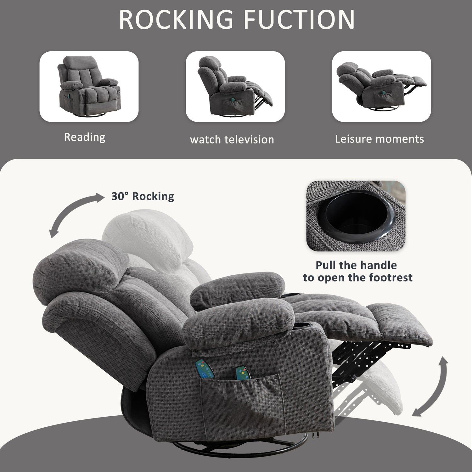 Whether reading a book, watching a movie, or taking a nap, a comfortable recliner chair can ease the stress from a busy day. Armrest for support and comfort with a high back, thick cushion, and high-grade antiskid upholstery, provides a very comfortable sitting feel and enhances safety. 2 cup holders, large pockets on both sides and two small pockets in front of the cup holders provide super convenience for your daily leisure and entertainment. The 360-degree swivel base of the glider rocker chair provides you with fun in your life and allows you to lull your babe to sleep gently.