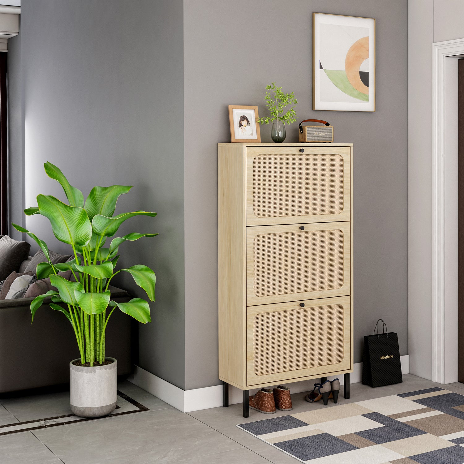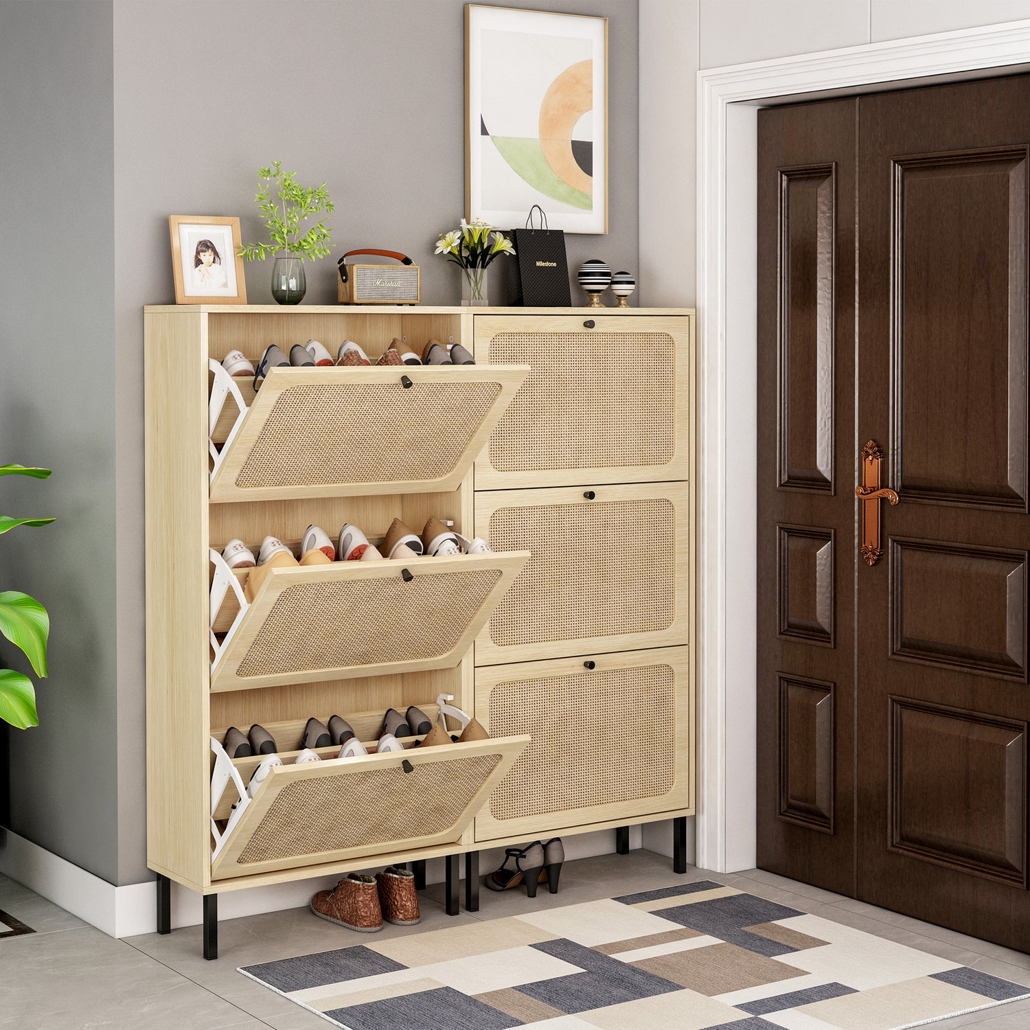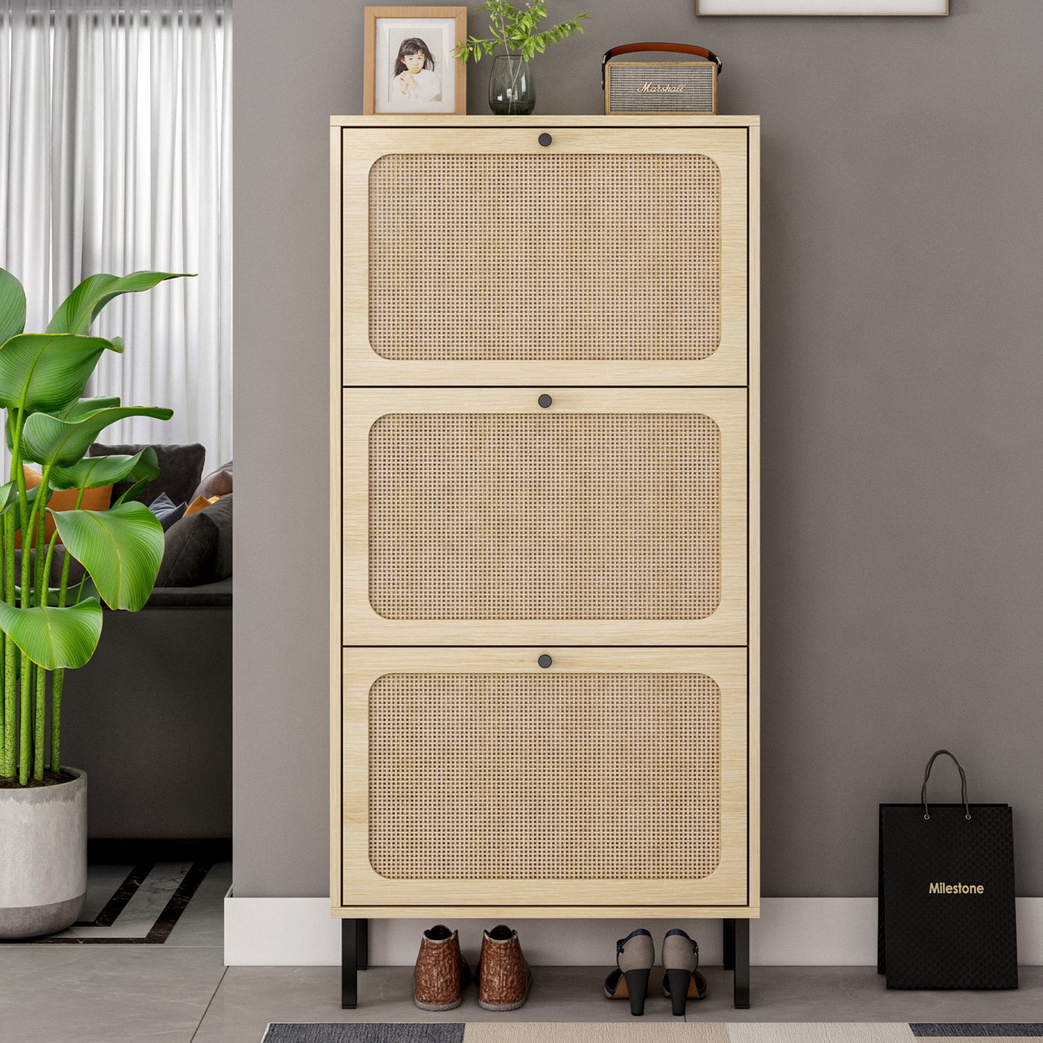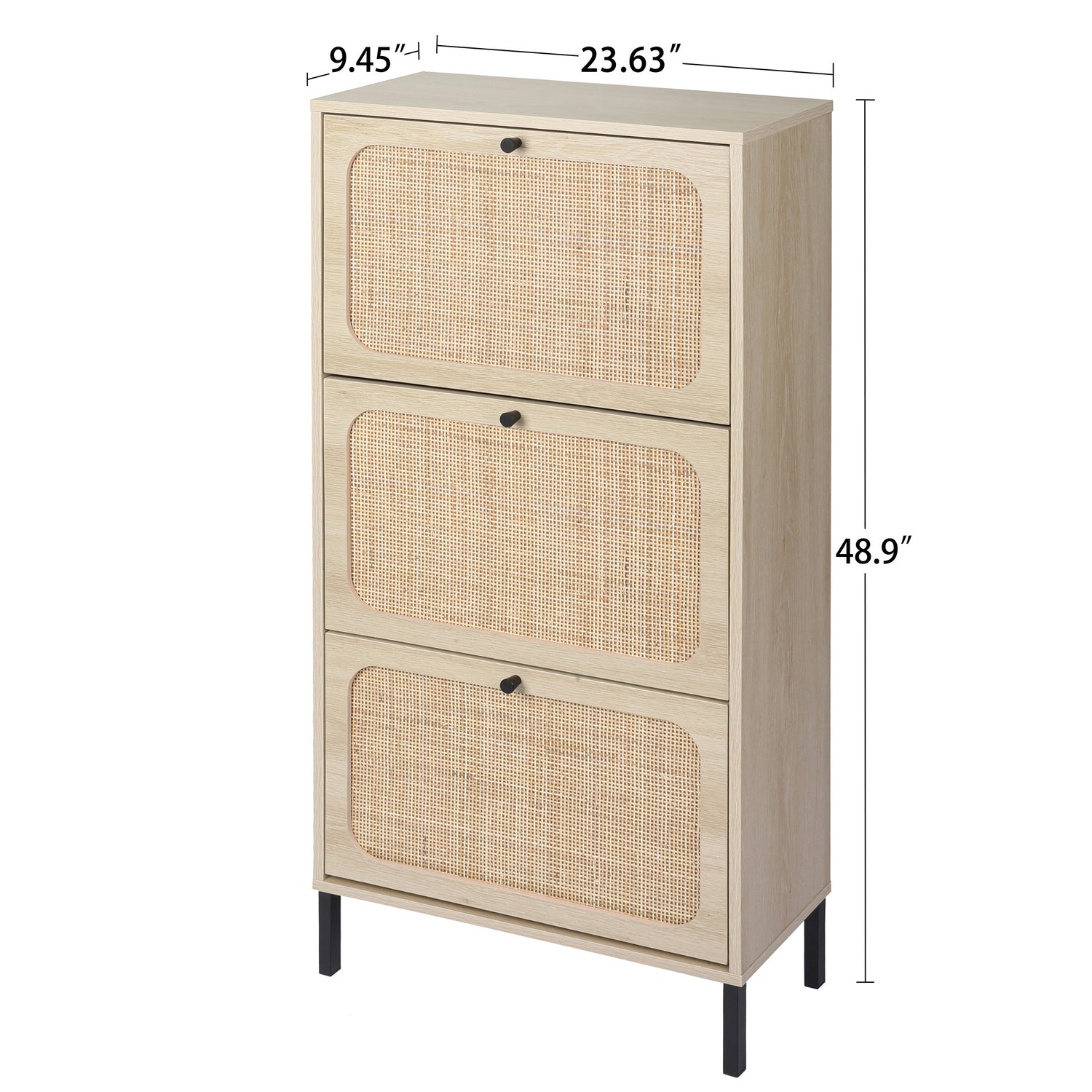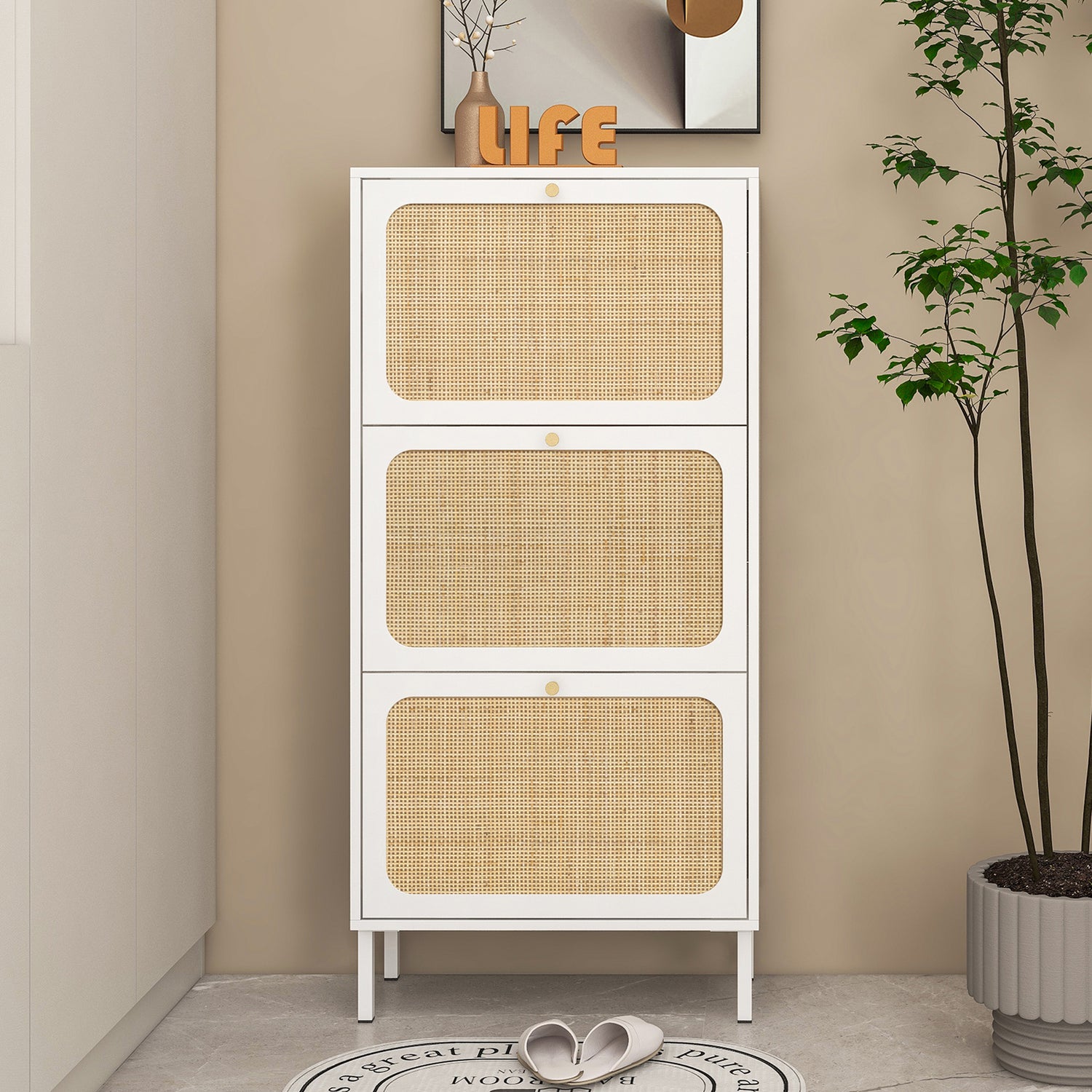 Transform your living space with the elegant and functional SYNGAR Entryway Shoe Storage. This modern shoe storage solution features three flip drawers with double shelves, providing ample space to keep your footwear neatly organized. The storage cabinet with drawers is adorned with stylish golden round handles and a rattan design, adding a touch of sophistication to any room. Supported by sturdy metal legs, this shoe organizer is both durable and chic. Whether placed in the living room, study, or entryway, the white SYNGAR shoe cabinet storage for the entryway seamlessly blends with your décor while offering a practical storage solution. Say goodbye to clutter and hello to a beautifully organized home.