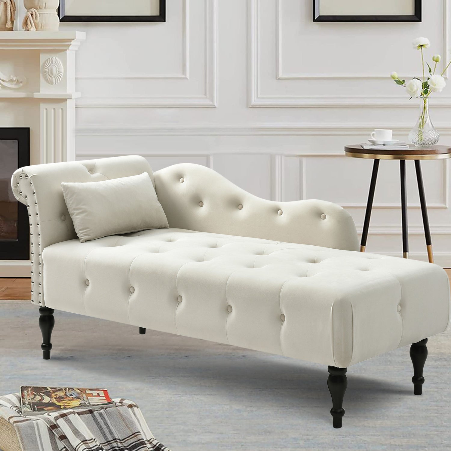 With soft velvet upholstery, tufted buttons, nailhead trim, solid wood legs, and tossed pillows, this chaise lounge has an elegant and classic feel. Solid wood frame construction and seat filling with high-density foam provide superior quality and comfort. Perfect for living room, reading room, bedroom, or office.