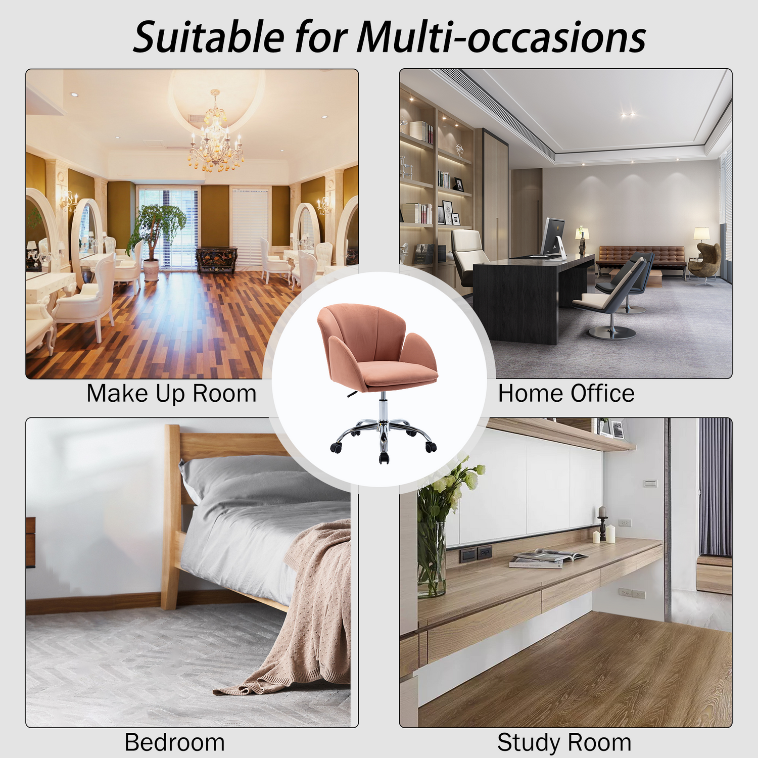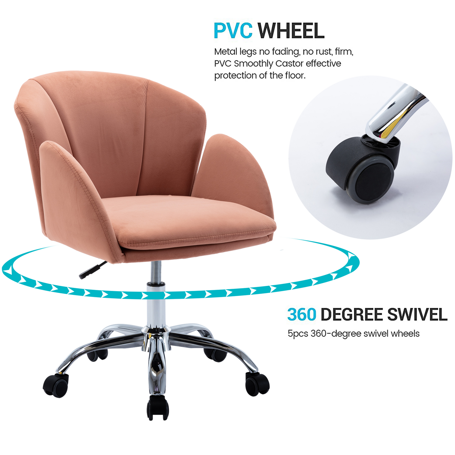 The clean design of velvet accent chair with chrome accents creates a professional atmosphere in your makeup room/living room/office, etc. The velvet upholstery adds a luxurious feel while the padding underneath provides comfort. With its pneumatic gas system, the vanity chair allows for smooth adjustments to a variety of desk heights. Move about easily and efficiently due to the five castors at the base of the chair.