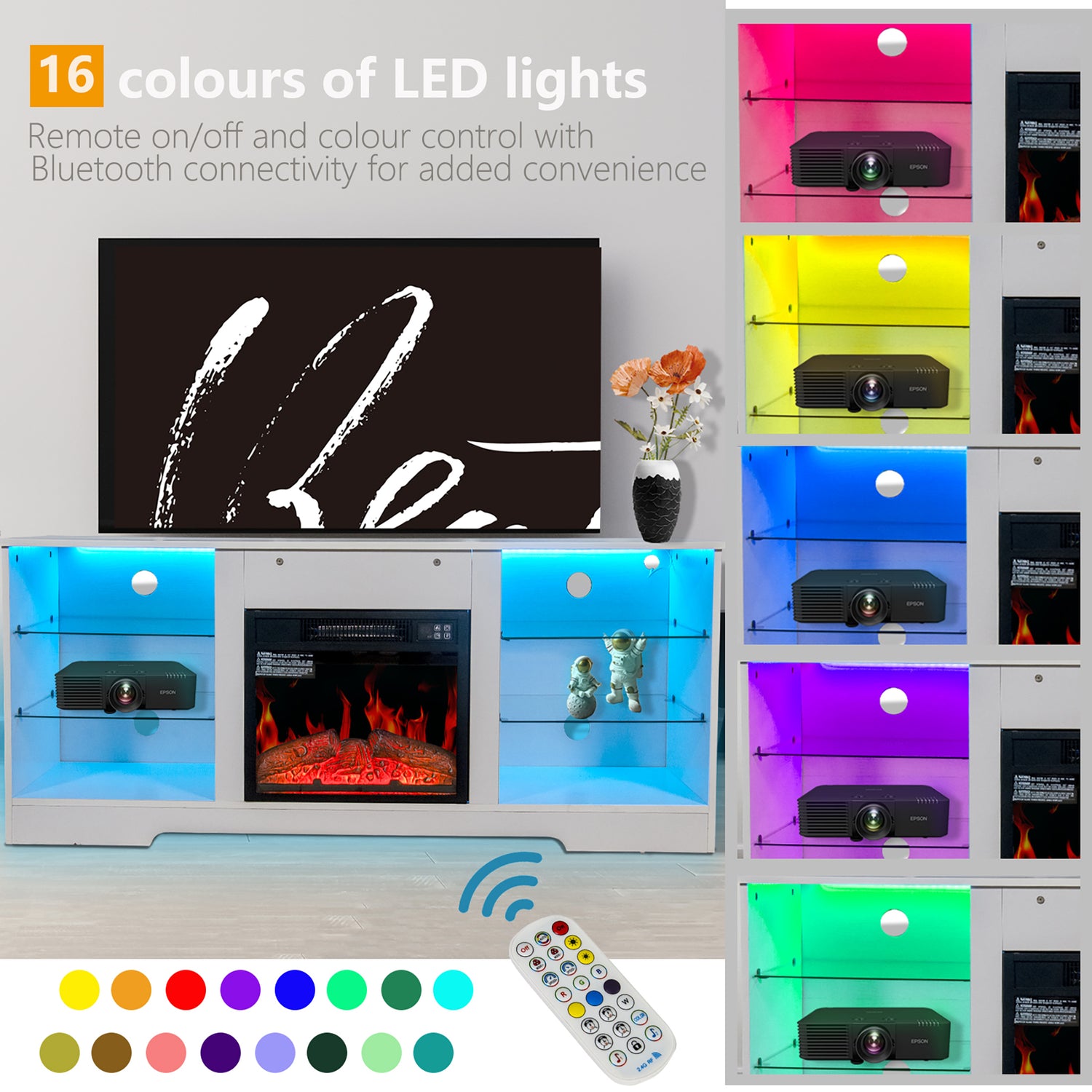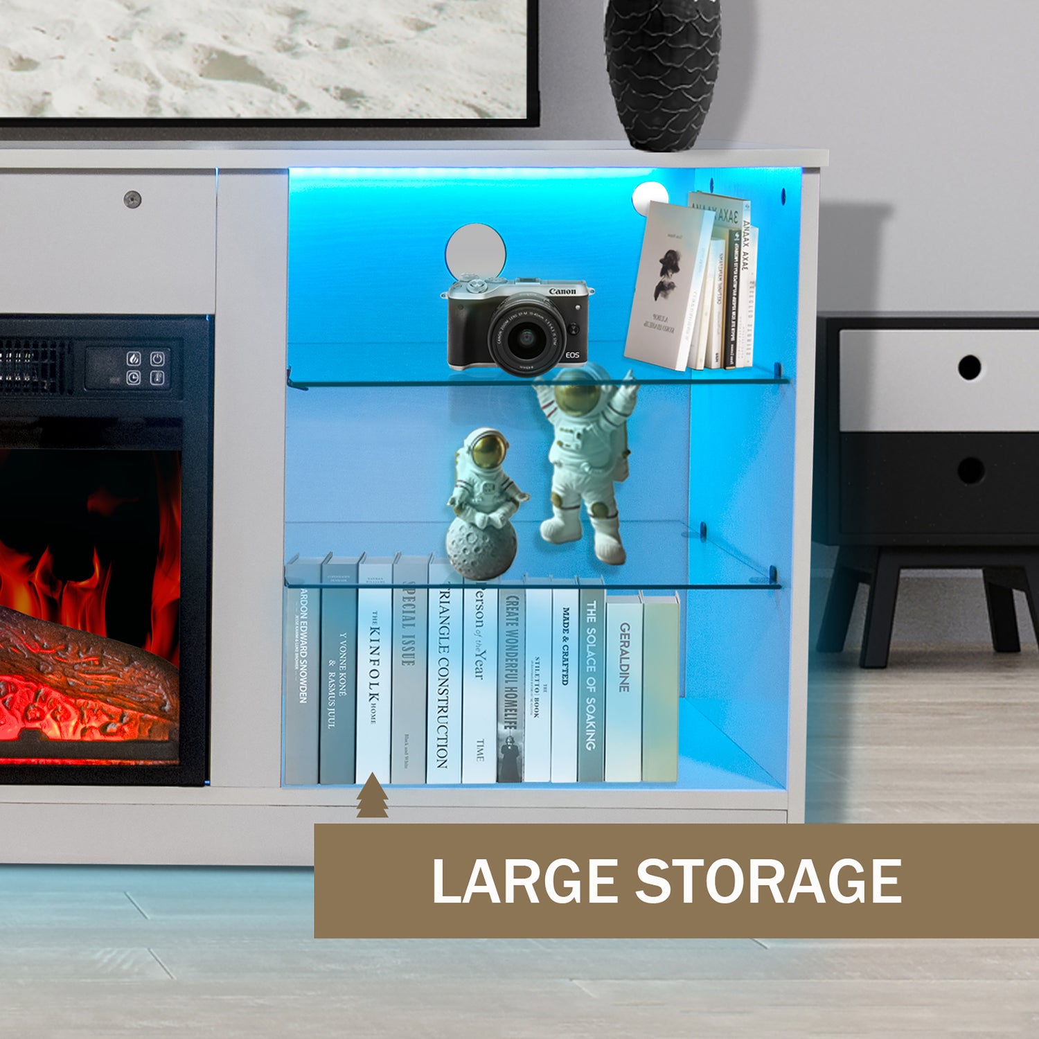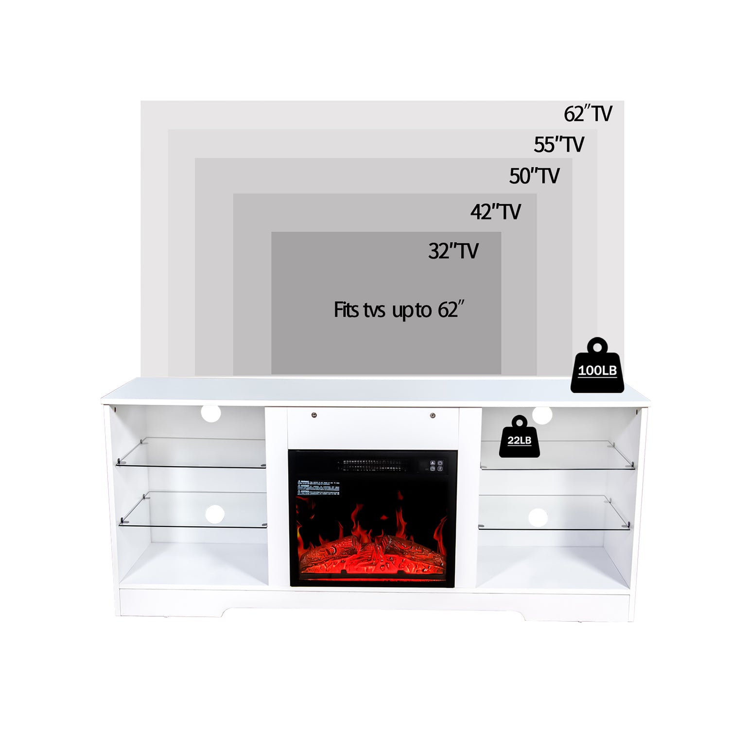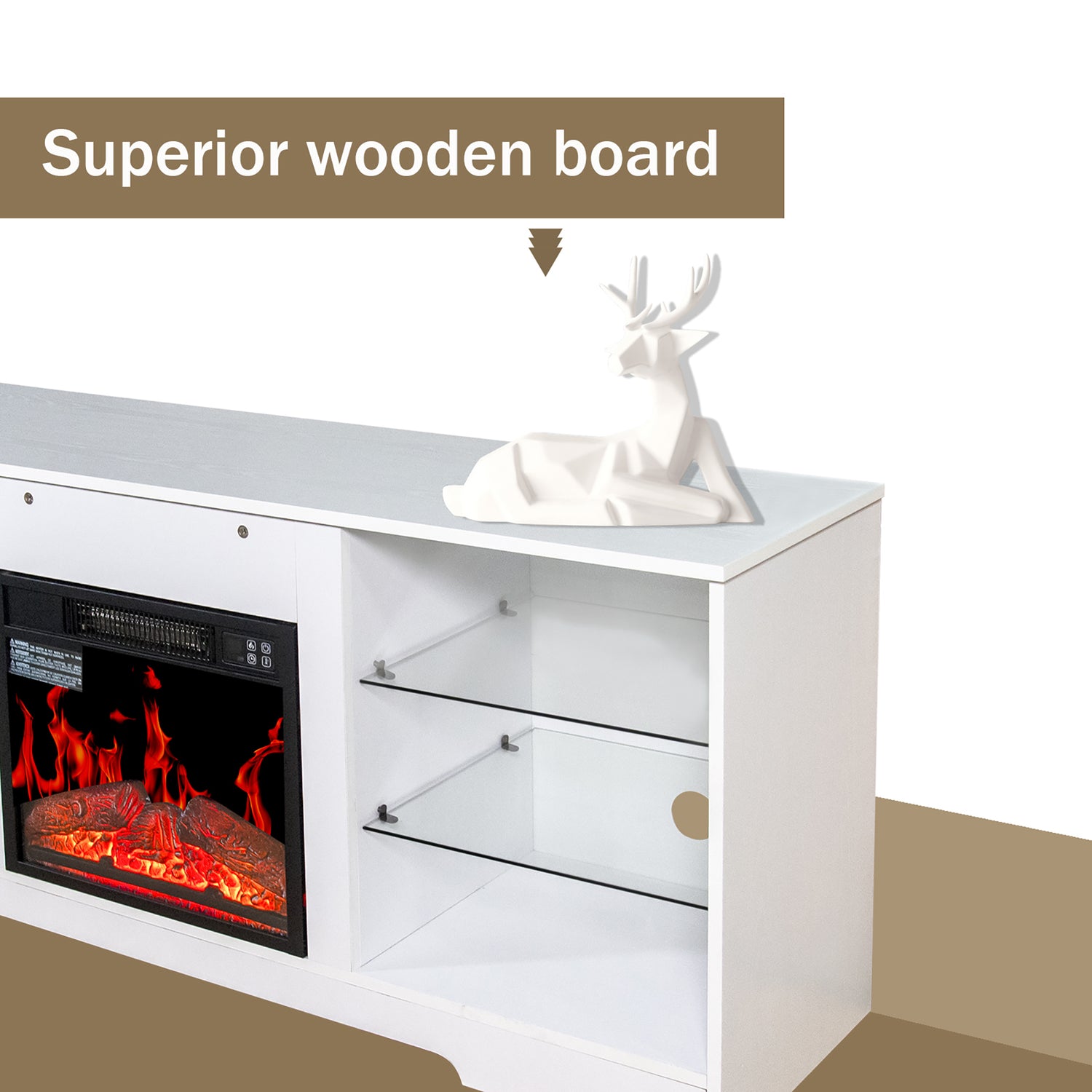 SYNGAR TV Stand with Fireplace for 60" TV, Contemporary Wooden Entertainment Center with LED Light for Living Room, TV Cabinet with Glass Shelves, TV Console with 18" Fireplace, White