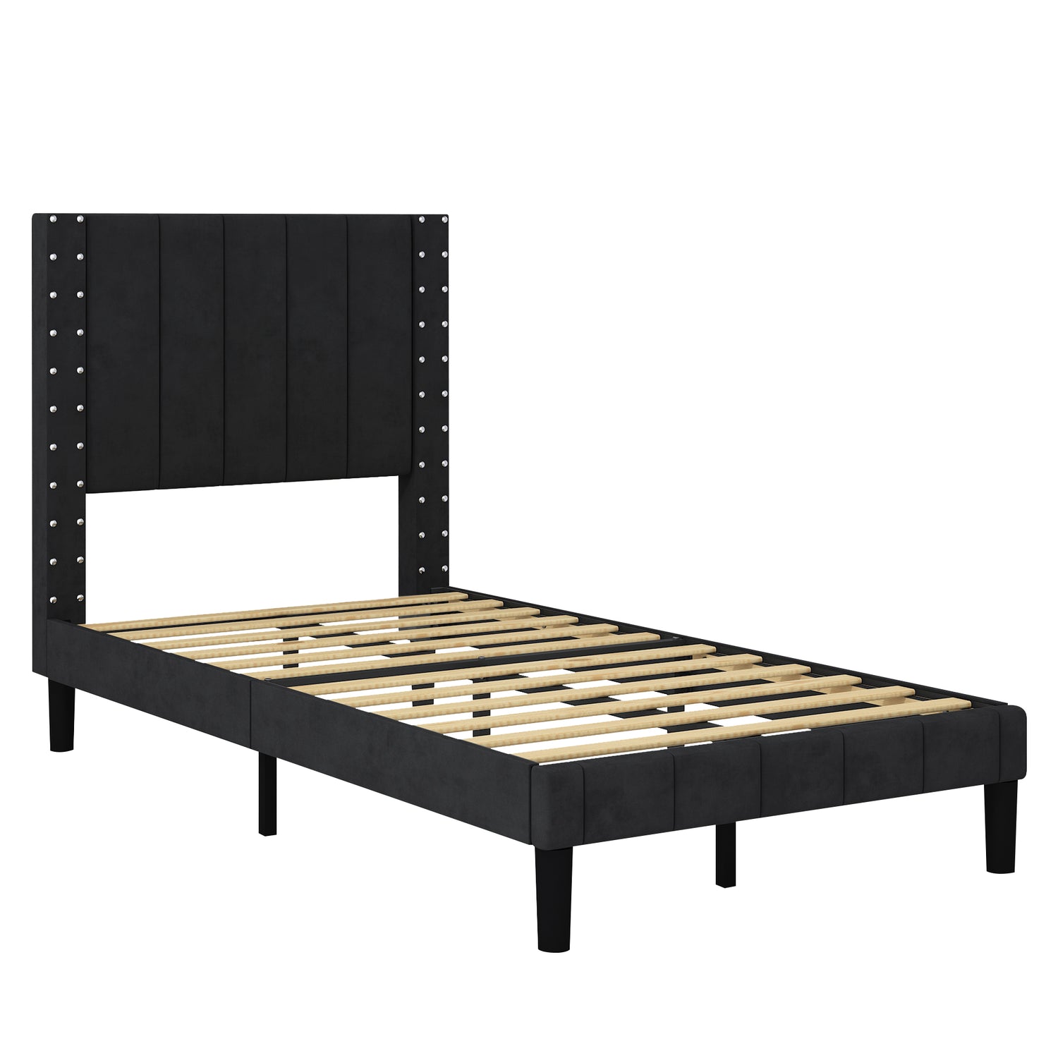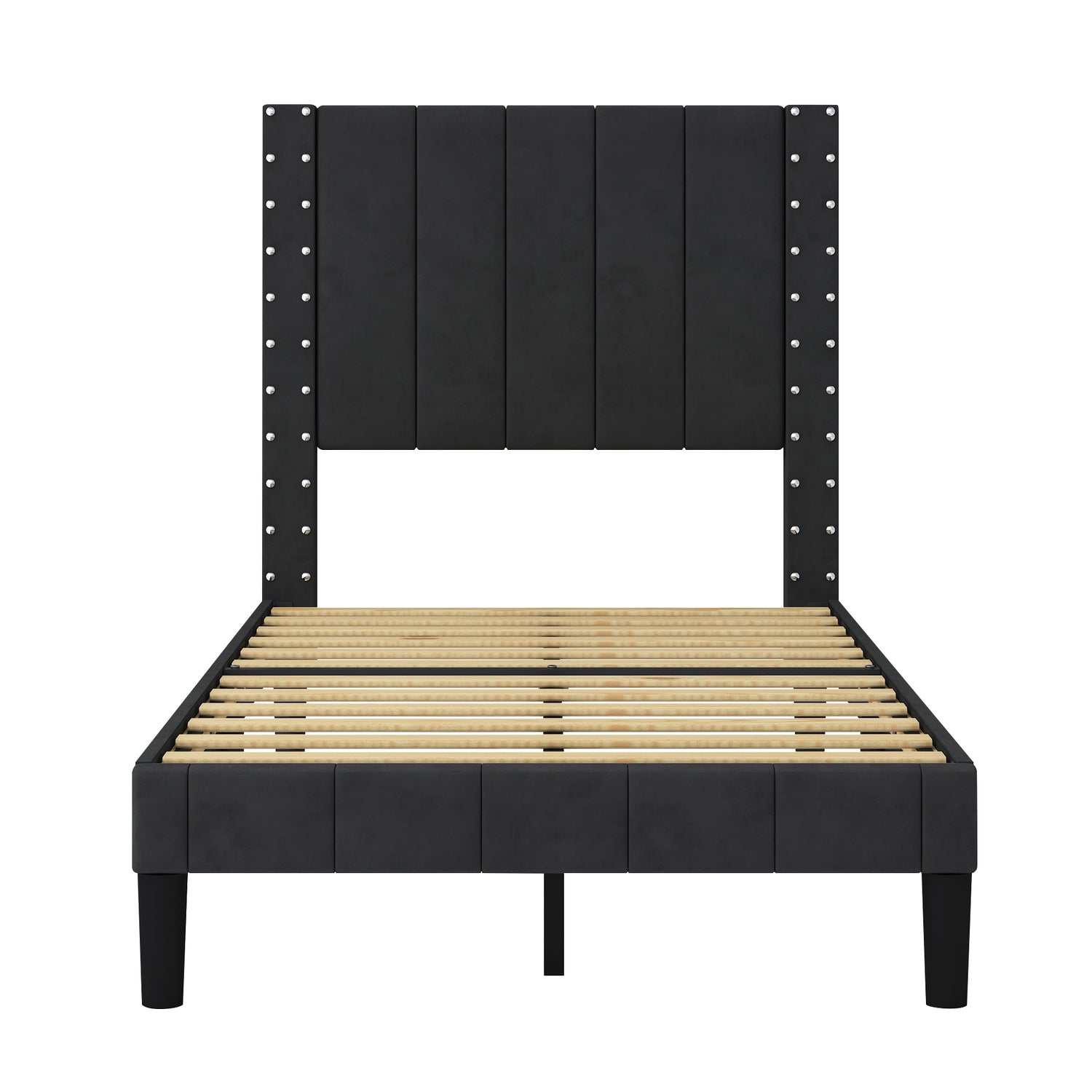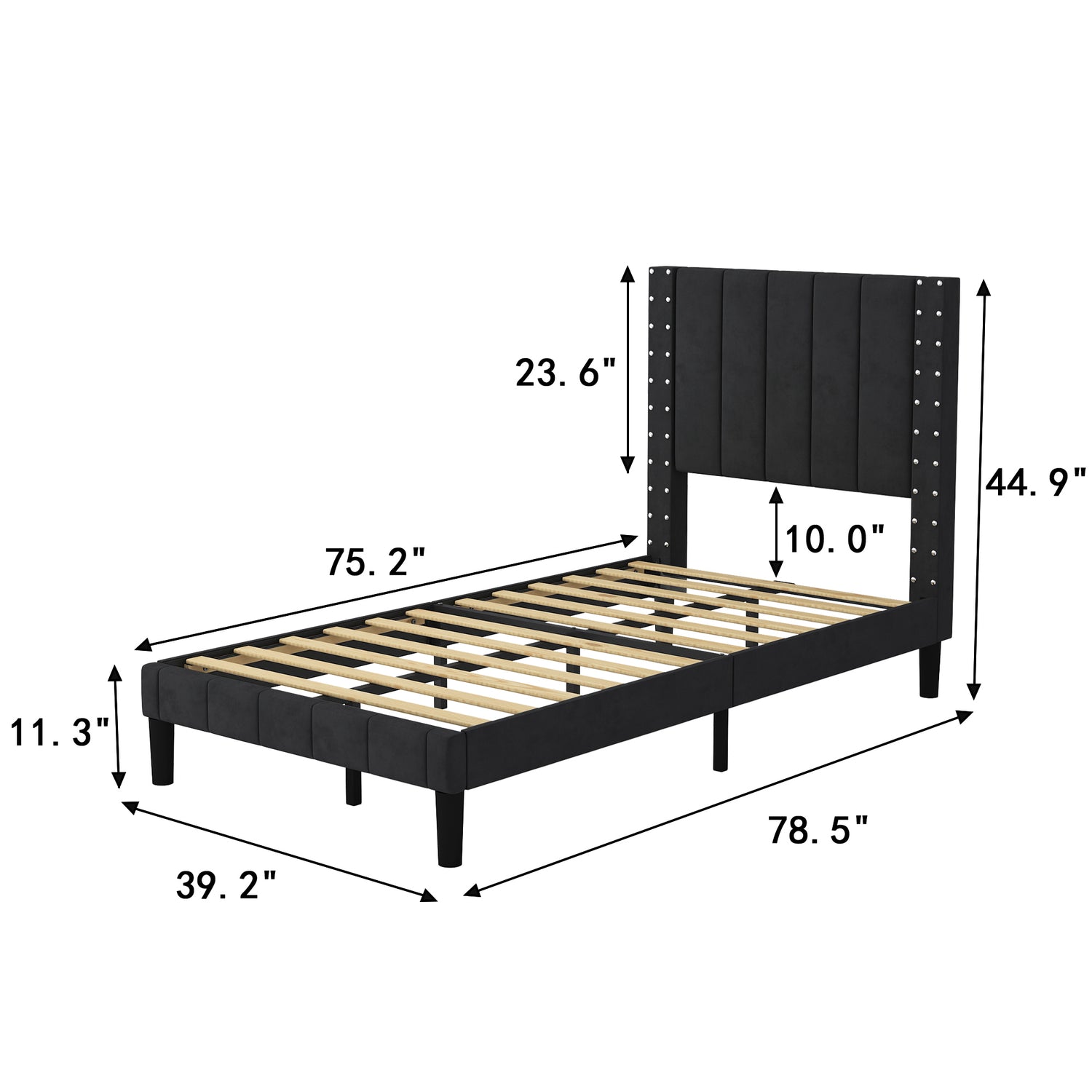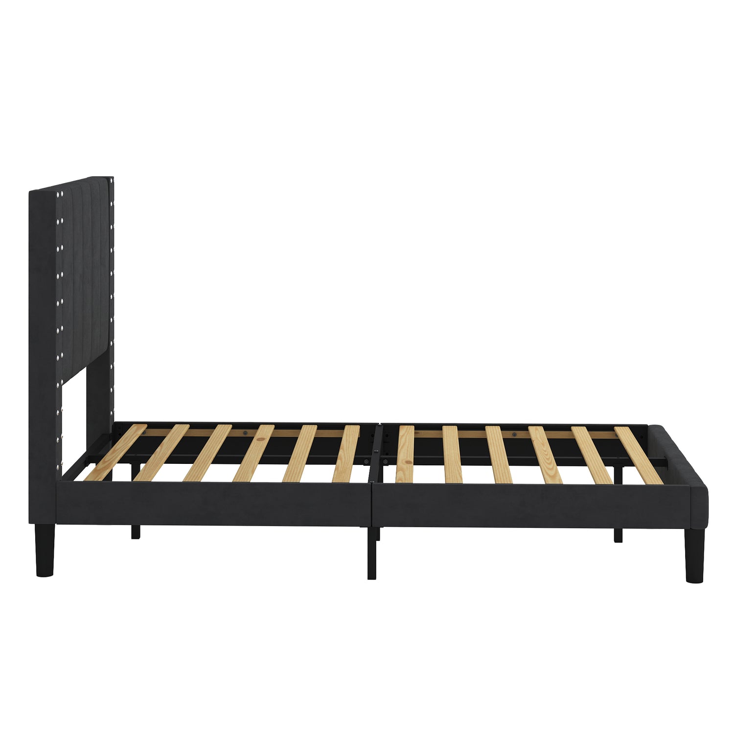 SYNGAR Upholstered Platform Bed with a metal frame and solid wood slats support combined to provide a solid foundation for a good night's sleep. With an elegant upholstered vertical channel design with rivets decor headboard for sturdy construction and durability. Includes a comfortable headboard, sturdy metal frame, strong wood slats, and support legs of the bed to support your memory foam, latex, or spring mattress (not included). Made of quality fabric upholstered, metal frame, and wood slats, this platform bed is durable and sturdy and can serve your family for years.