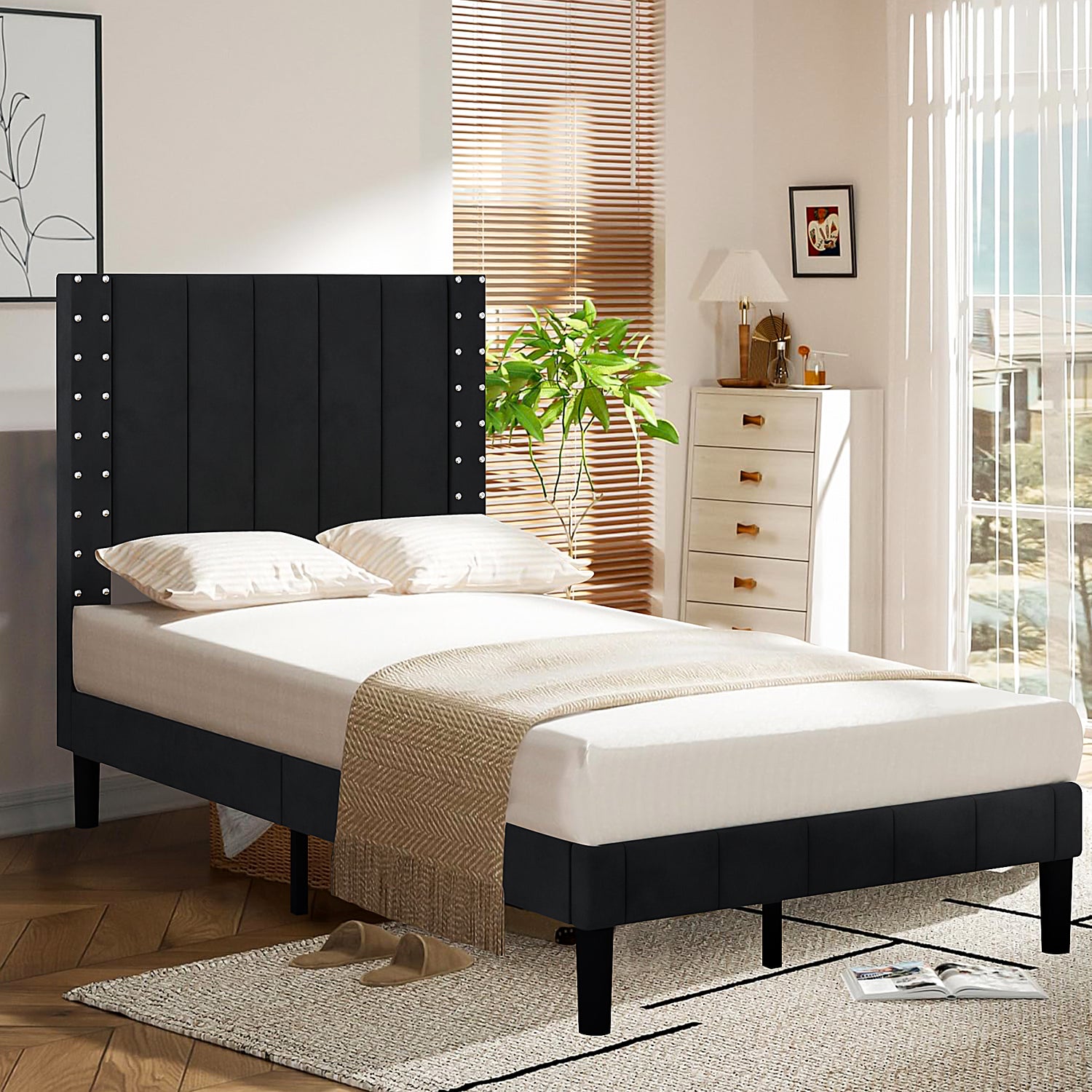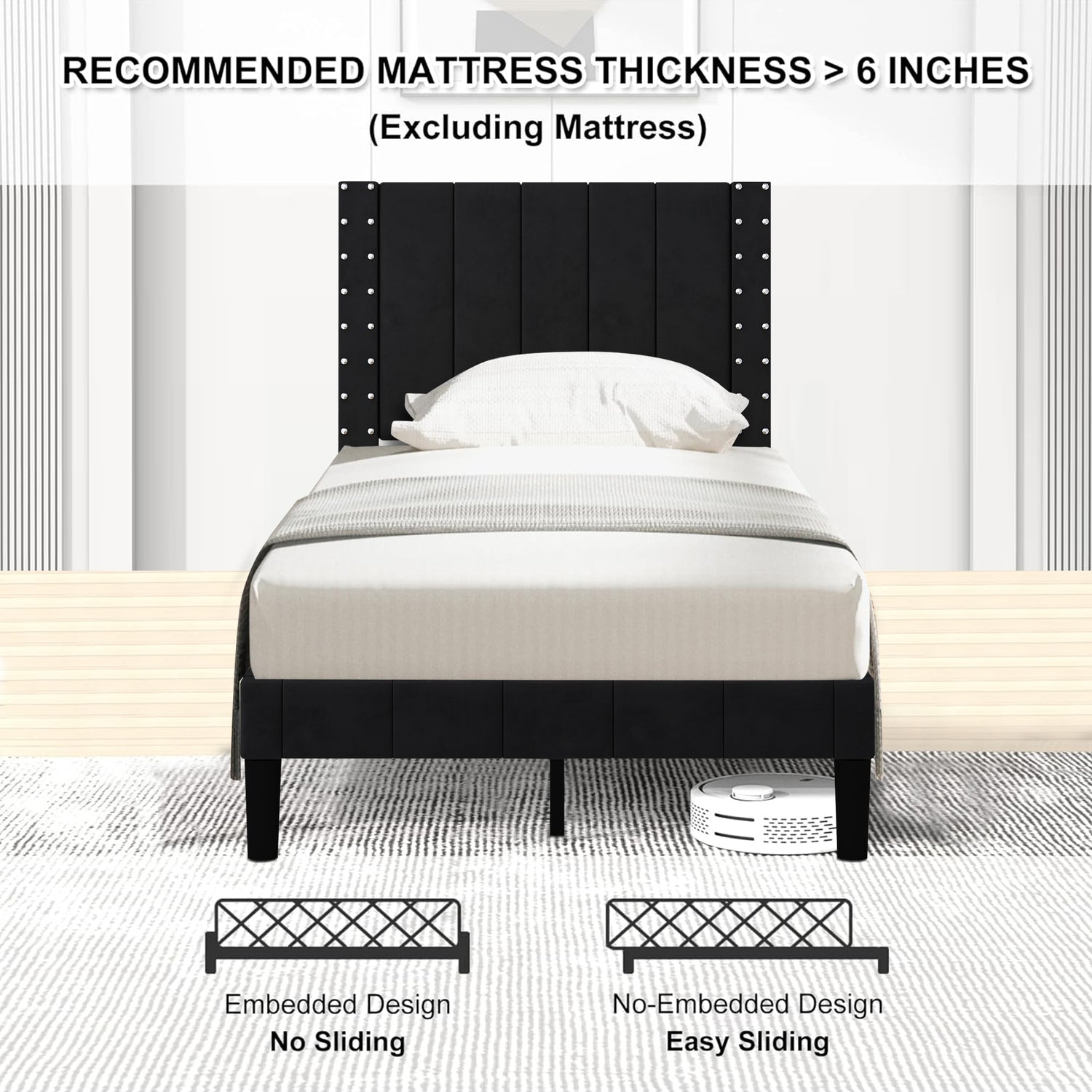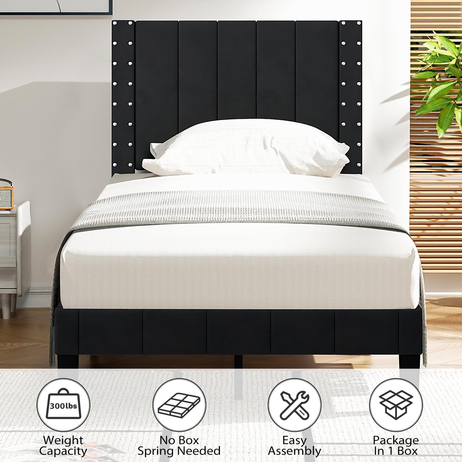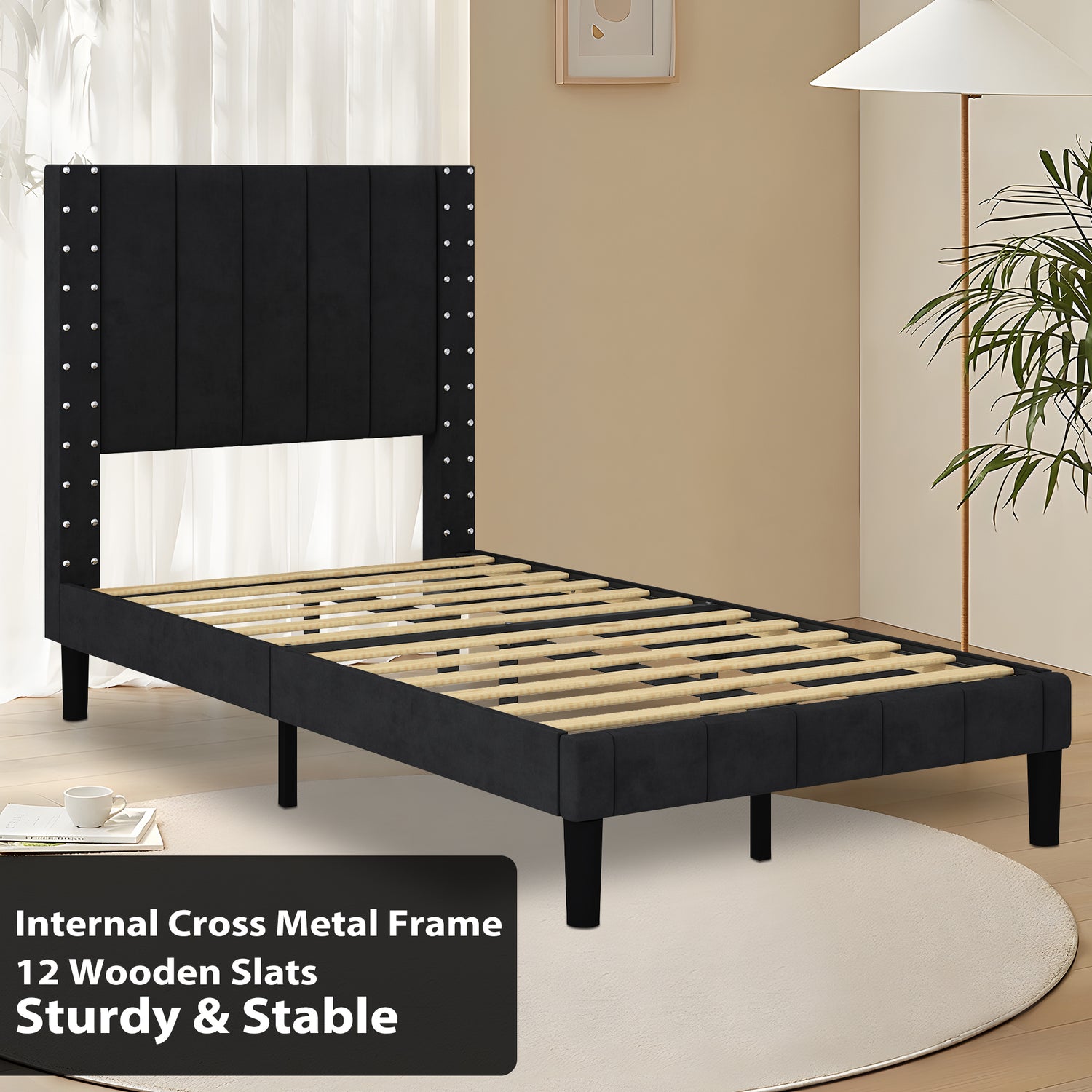 SYNGAR Upholstered Platform Bed with a metal frame and solid wood slats support combined to provide a solid foundation for a good night's sleep. With an elegant upholstered vertical channel design with rivets decor headboard for sturdy construction and durability. Includes a comfortable headboard, sturdy metal frame, strong wood slats, and support legs of the bed to support your memory foam, latex, or spring mattress (not included). Made of quality fabric upholstered, metal frame, and wood slats, this platform bed is durable and sturdy and can serve your family for years.
