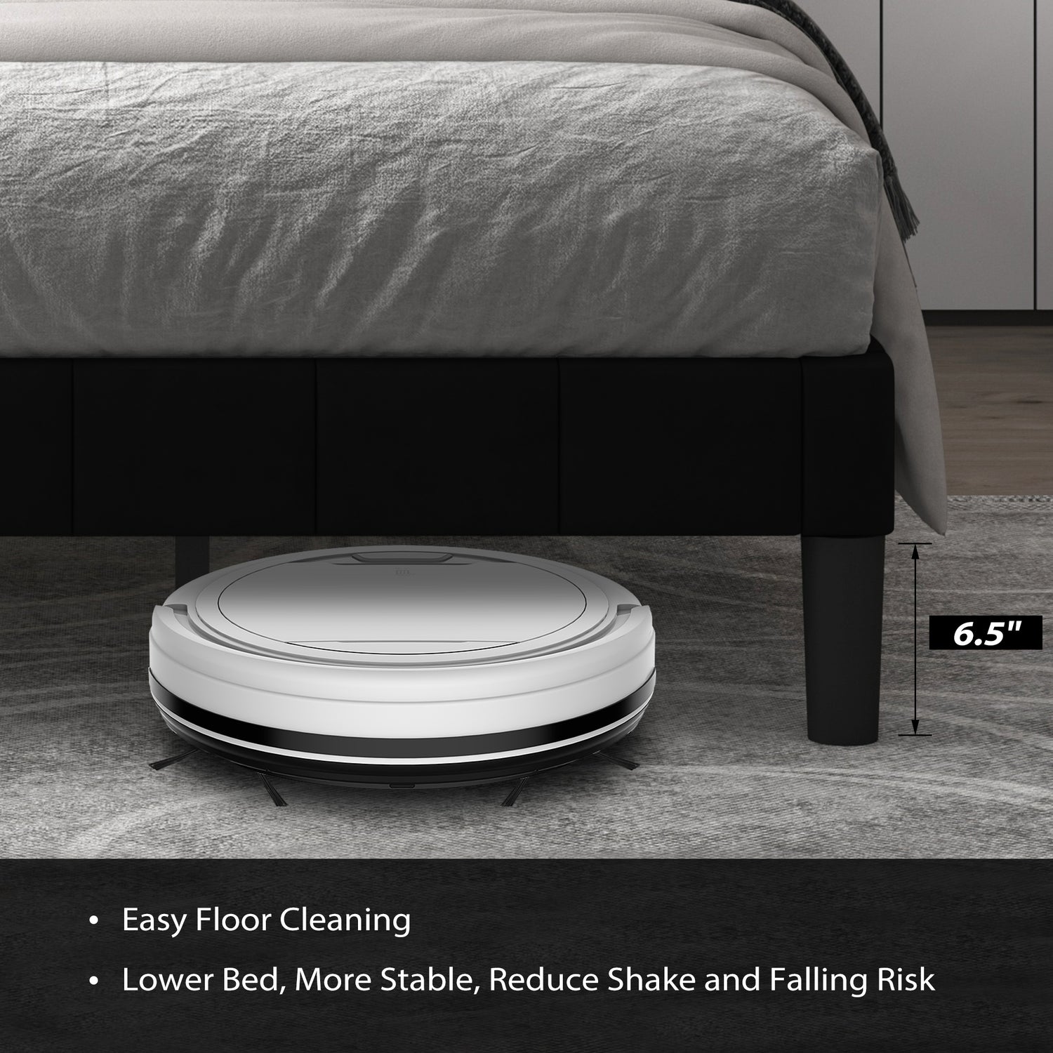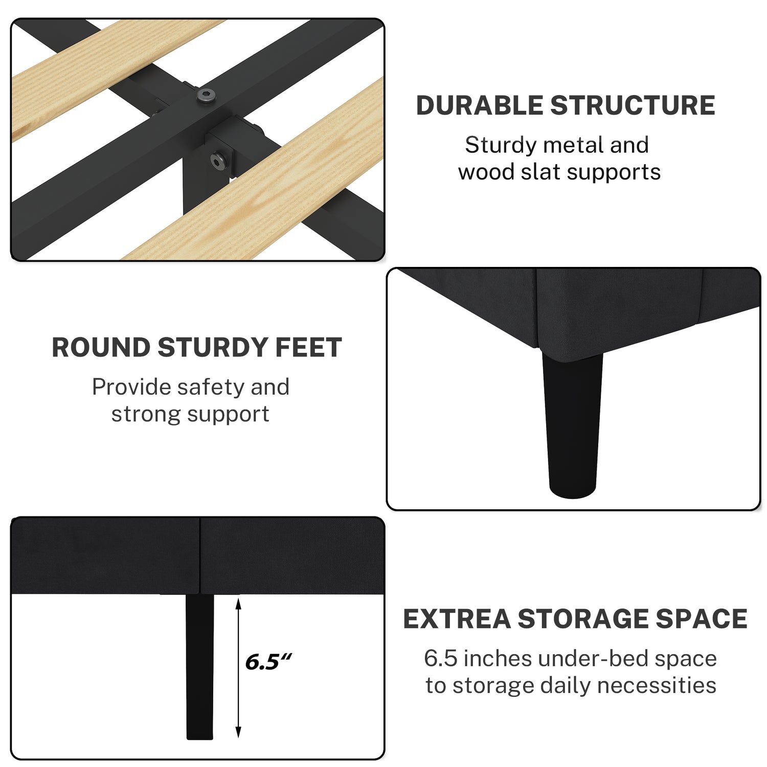 Heavy Duty Metal and Wood Bed Frame - This upholstered platform bed wood frame is made of sturdy metal construction and solid wood slats, and center support legs blend naturally into the already sturdy frame to provide dense and strong support for up to 300 lbs. The bed frame provides your family with a safe and comfortable sleep environment.
