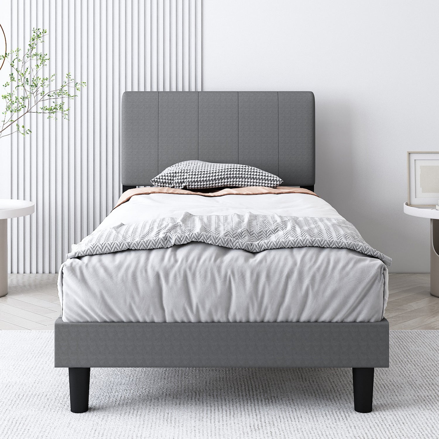 Upgrade your bedroom with our modern twin bed frame, featuring a button-designed, adjustable height headboard that is perfect for any style. This sleek platform bed frame is upholstered in high-quality Fabric, adding a touch of luxury to your space. The sturdy wood slats provide excellent support, eliminating the need for a box spring and ensuring a restful night's sleep. Designed with convenience in mind, this bed frame offers easy assembly, so you'll have your new bed set up in no time. Ideal for both kids and adults, it's the perfect blend of style, comfort, and functionality.