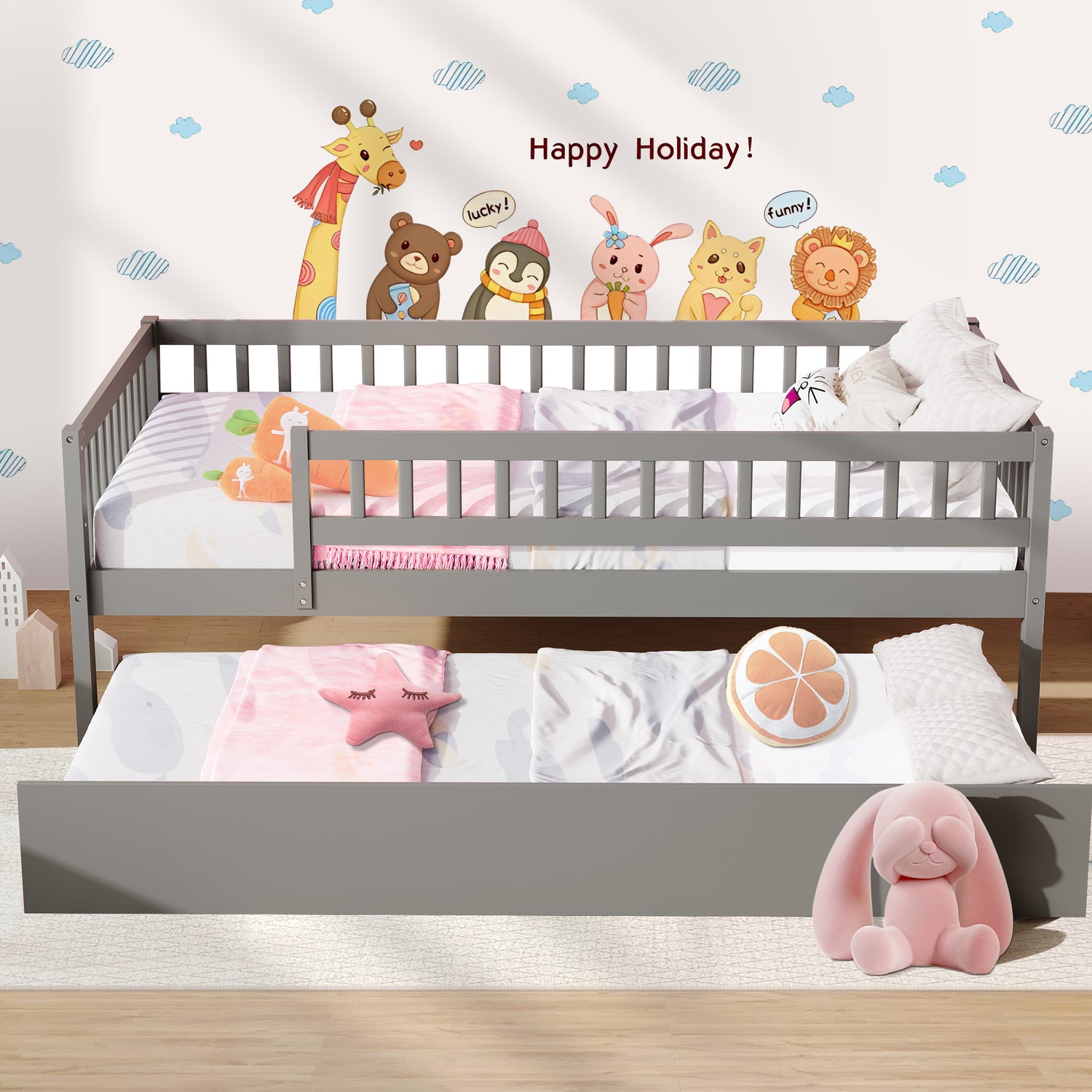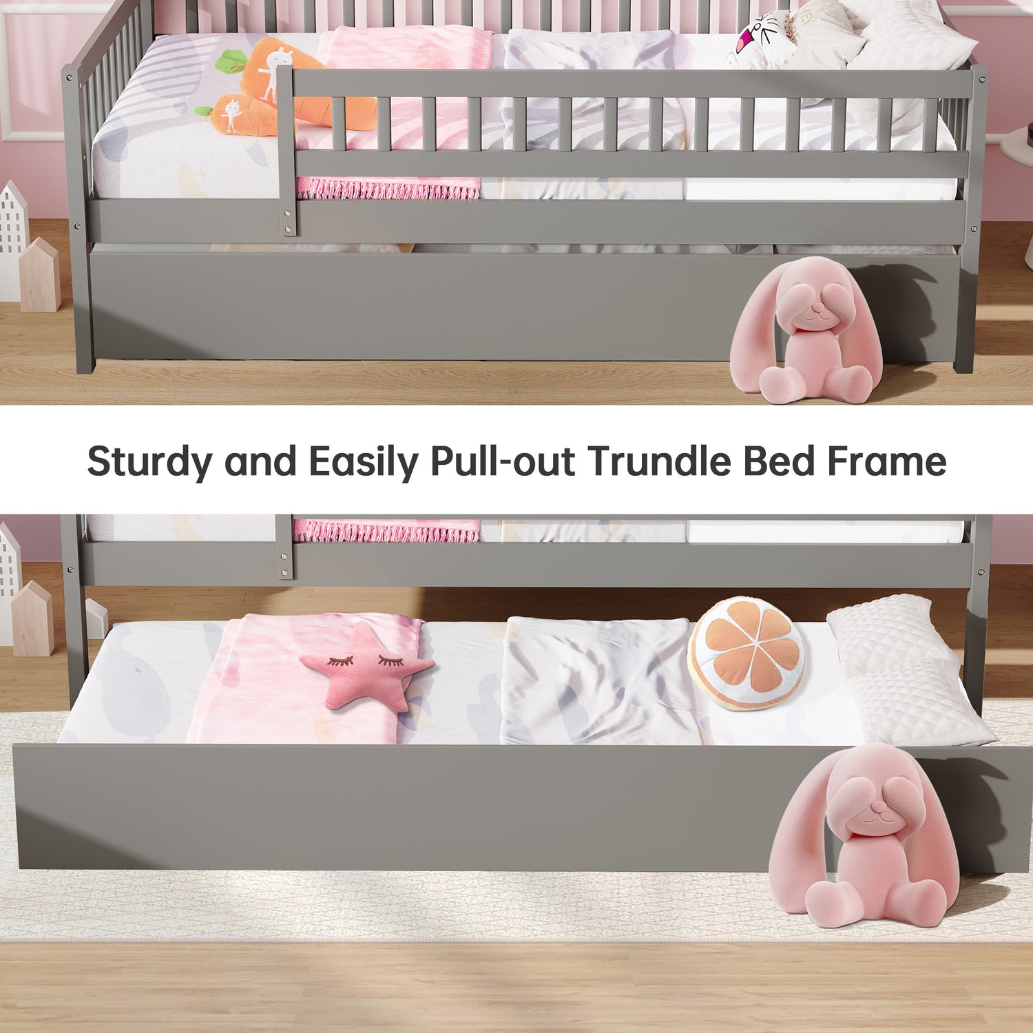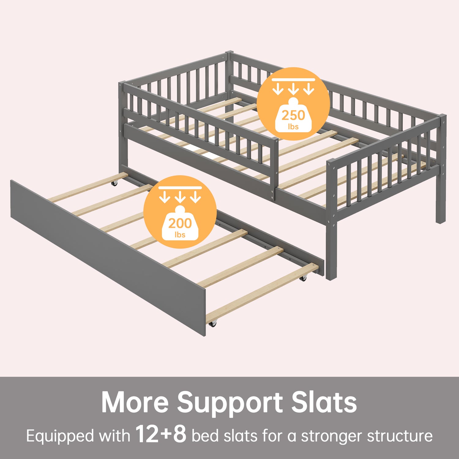 SYNGAR Twin Bed With Pull Out Trundle for Kids, Wooden Twin Size Bed Frames with Guardrails for Kid's Room, Bedroom, Trundle Bed Frame, No Box Spring Needed, Wood Slat Support, Gary
