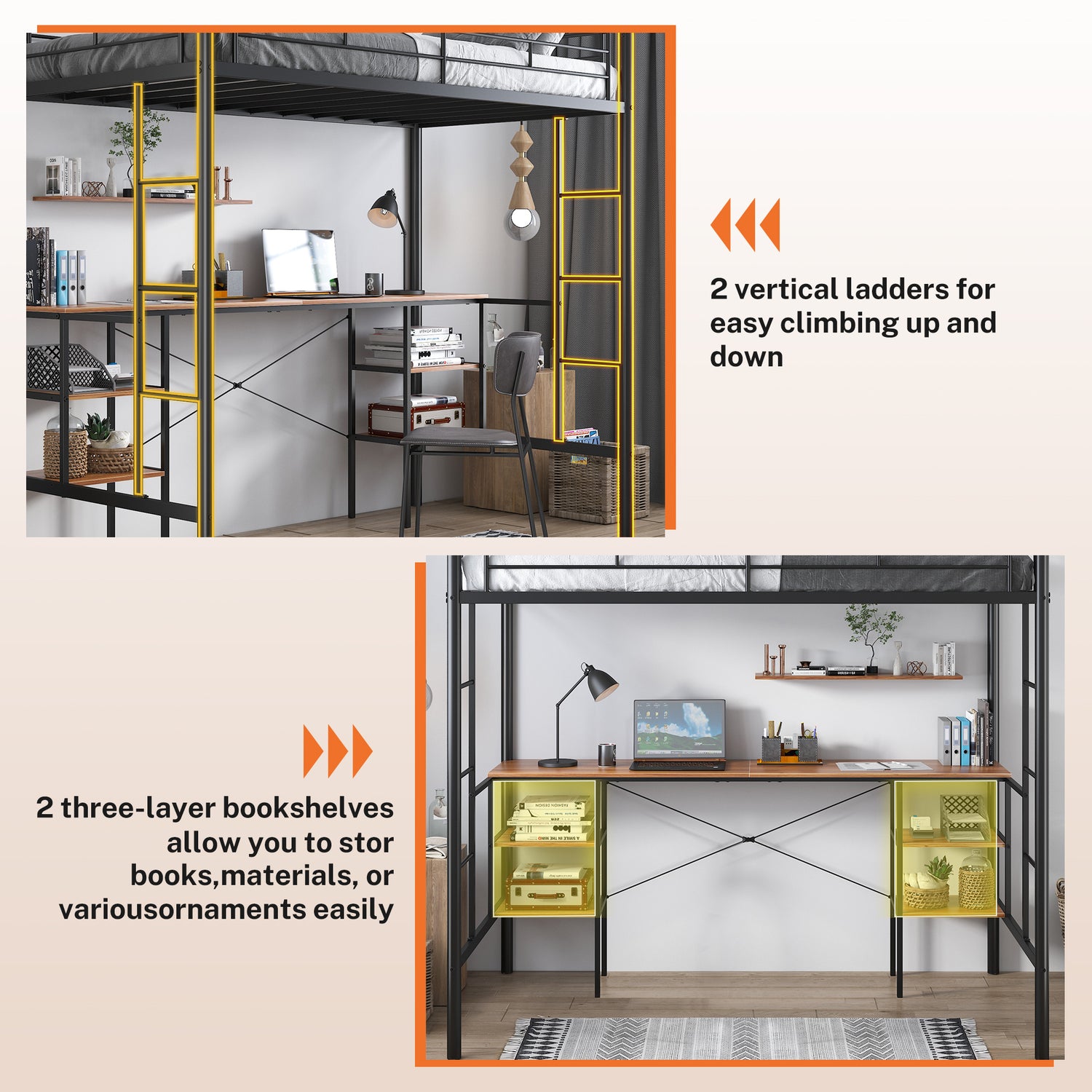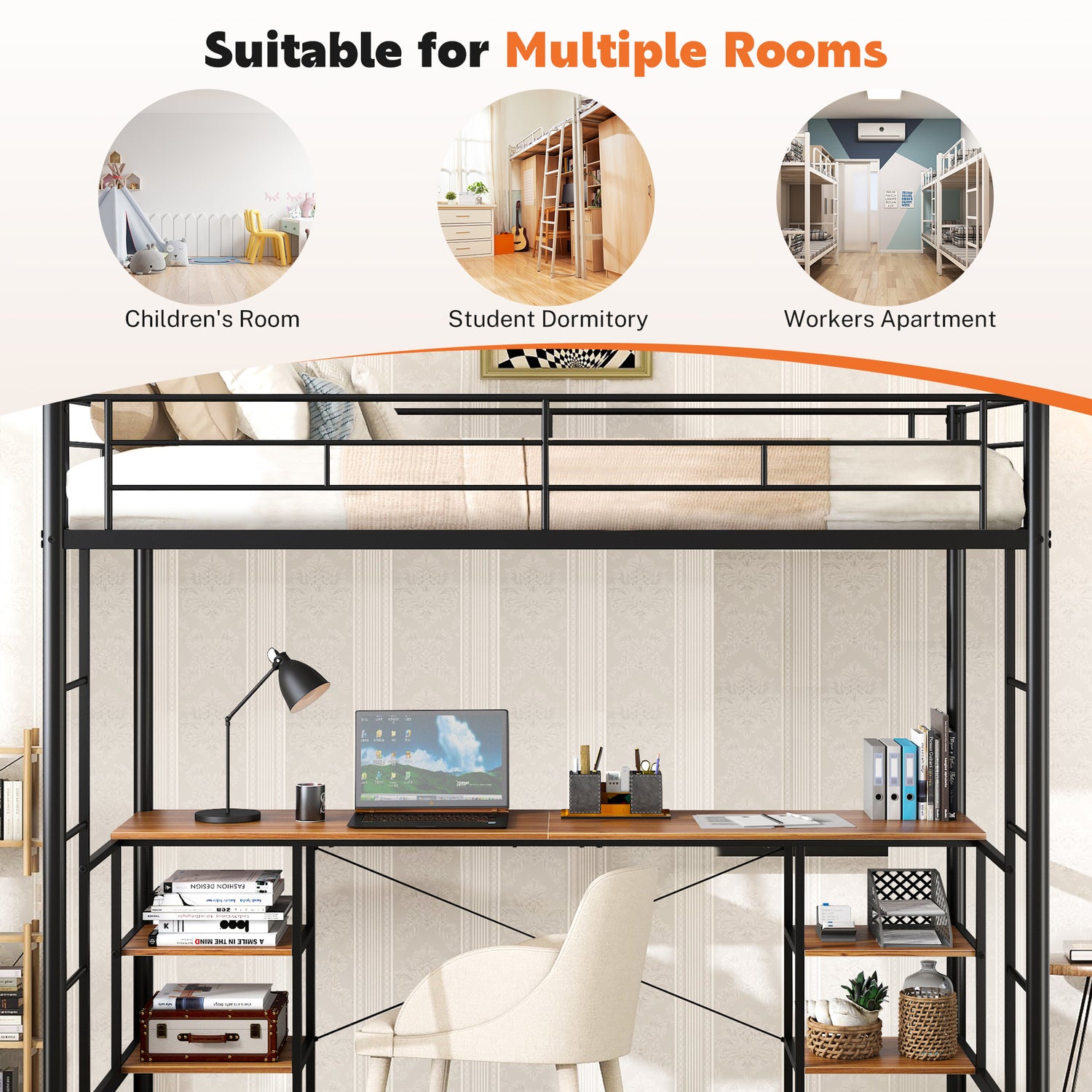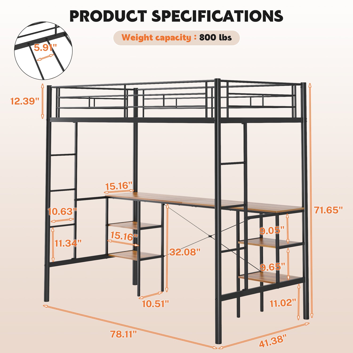 SYNGAR Twin Loft Bed with Desk, Metal Loft Bed with 4 Storage Shelves, Space-Saving Bed Frame with Bilateral Ladders and Safety Guard Rails for Boys Girls Kids Teens Adults, Black