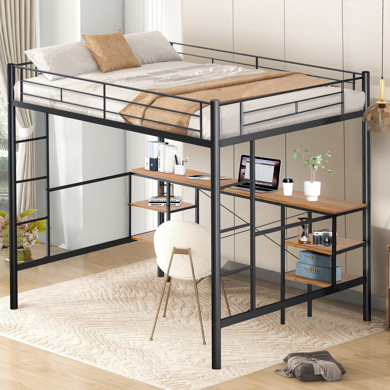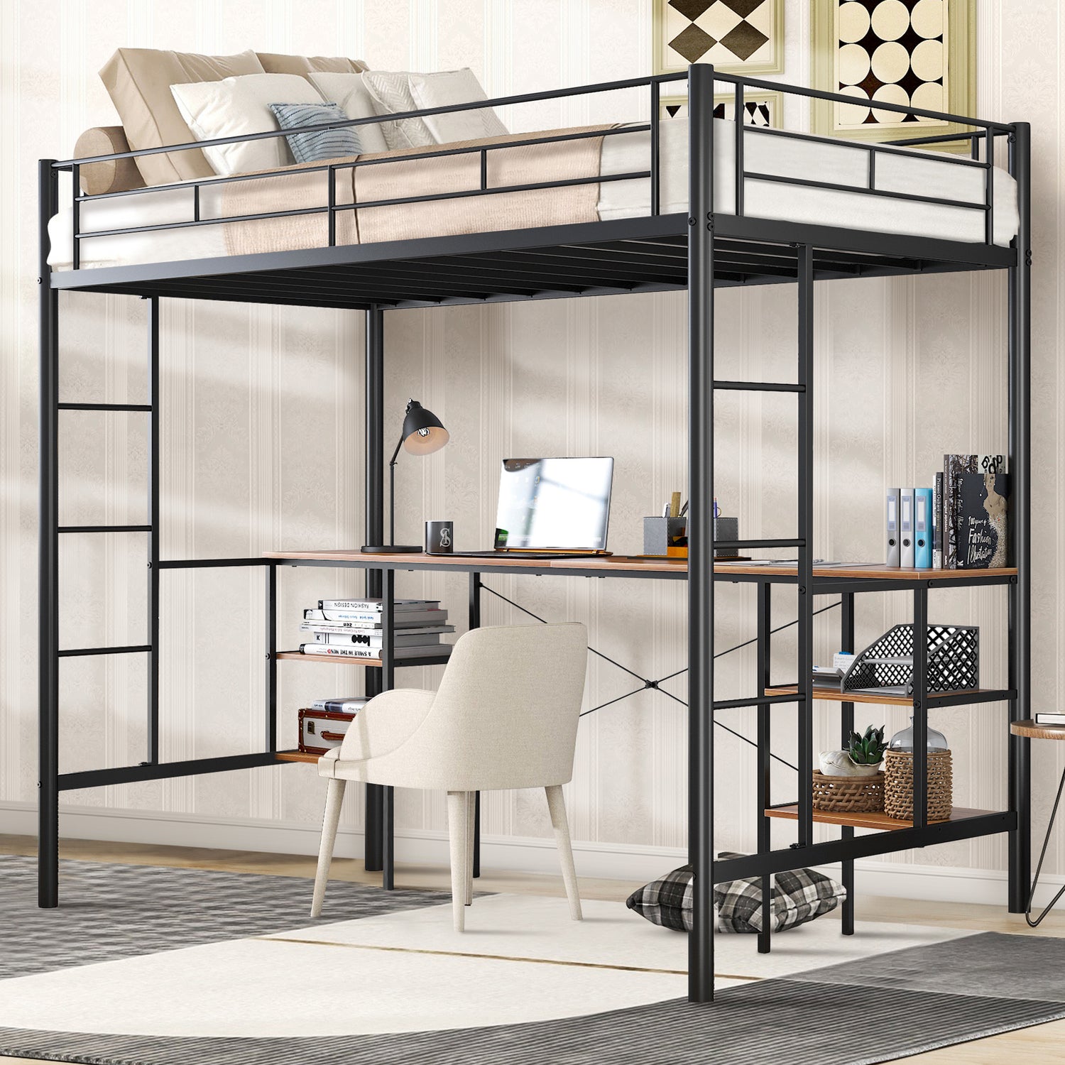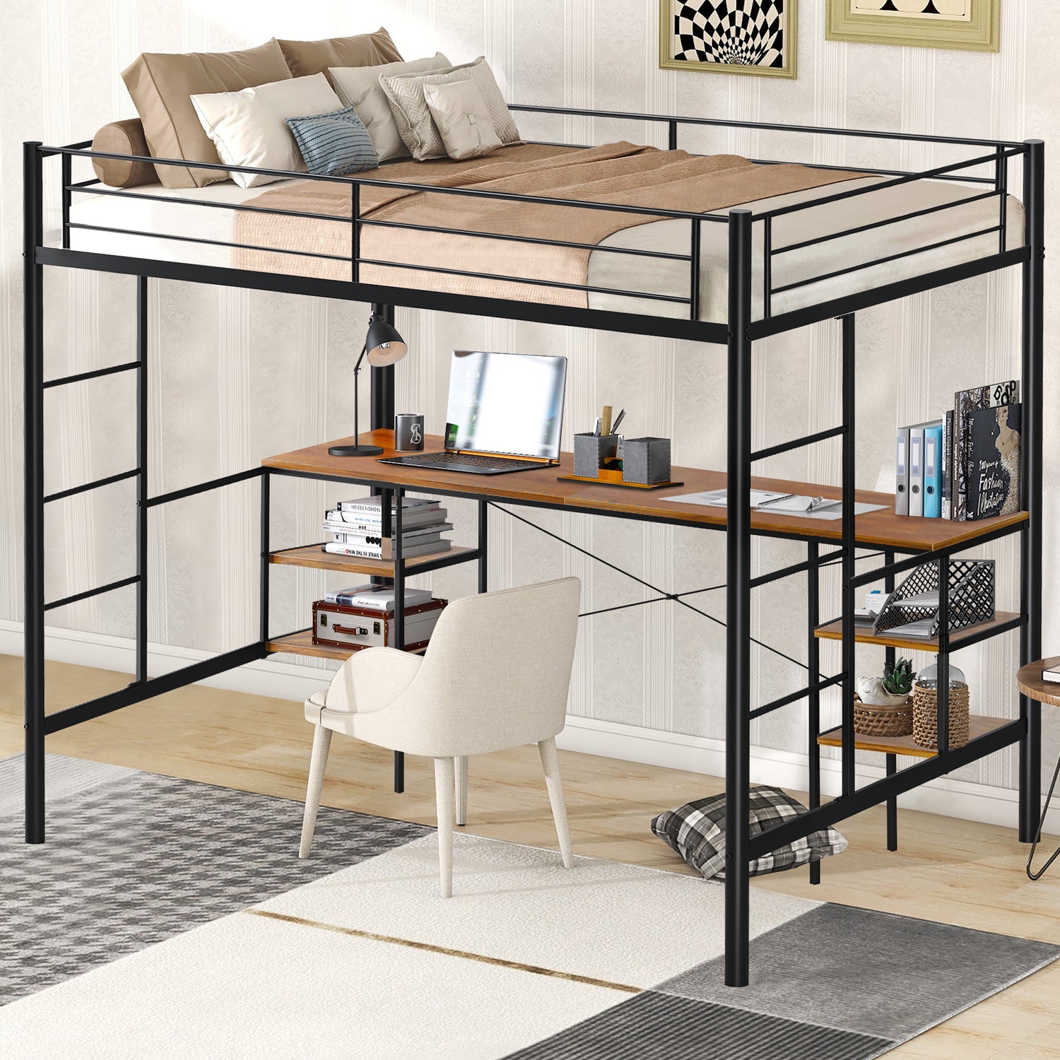 SYNGAR Twin Loft Bed with Desk, Metal Loft Bed with 4 Storage Shelves, Space-Saving Bed Frame with Bilateral Ladders and Safety Guard Rails for Boys Girls Kids Teens Adults, Black